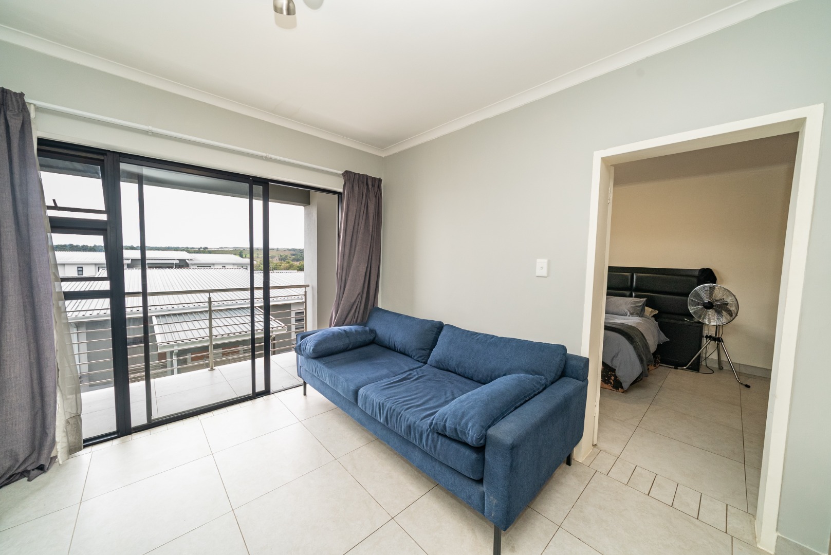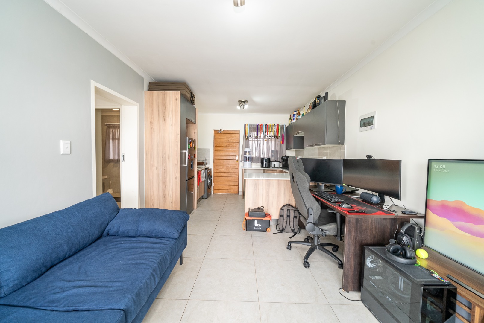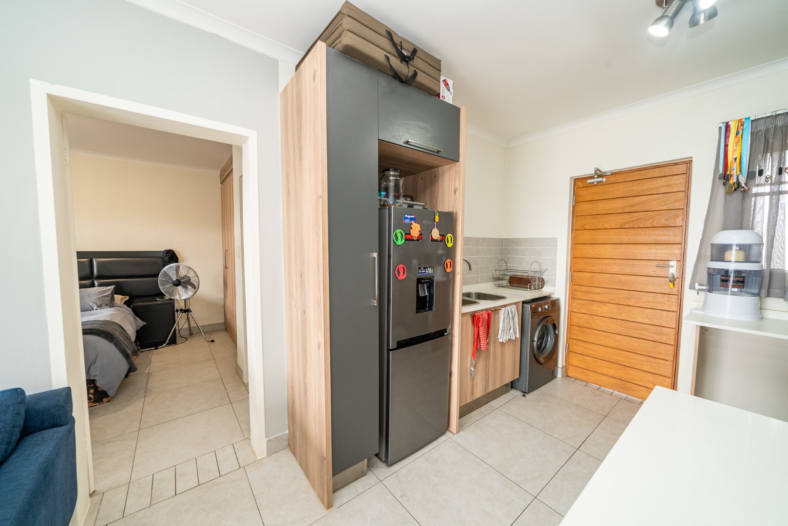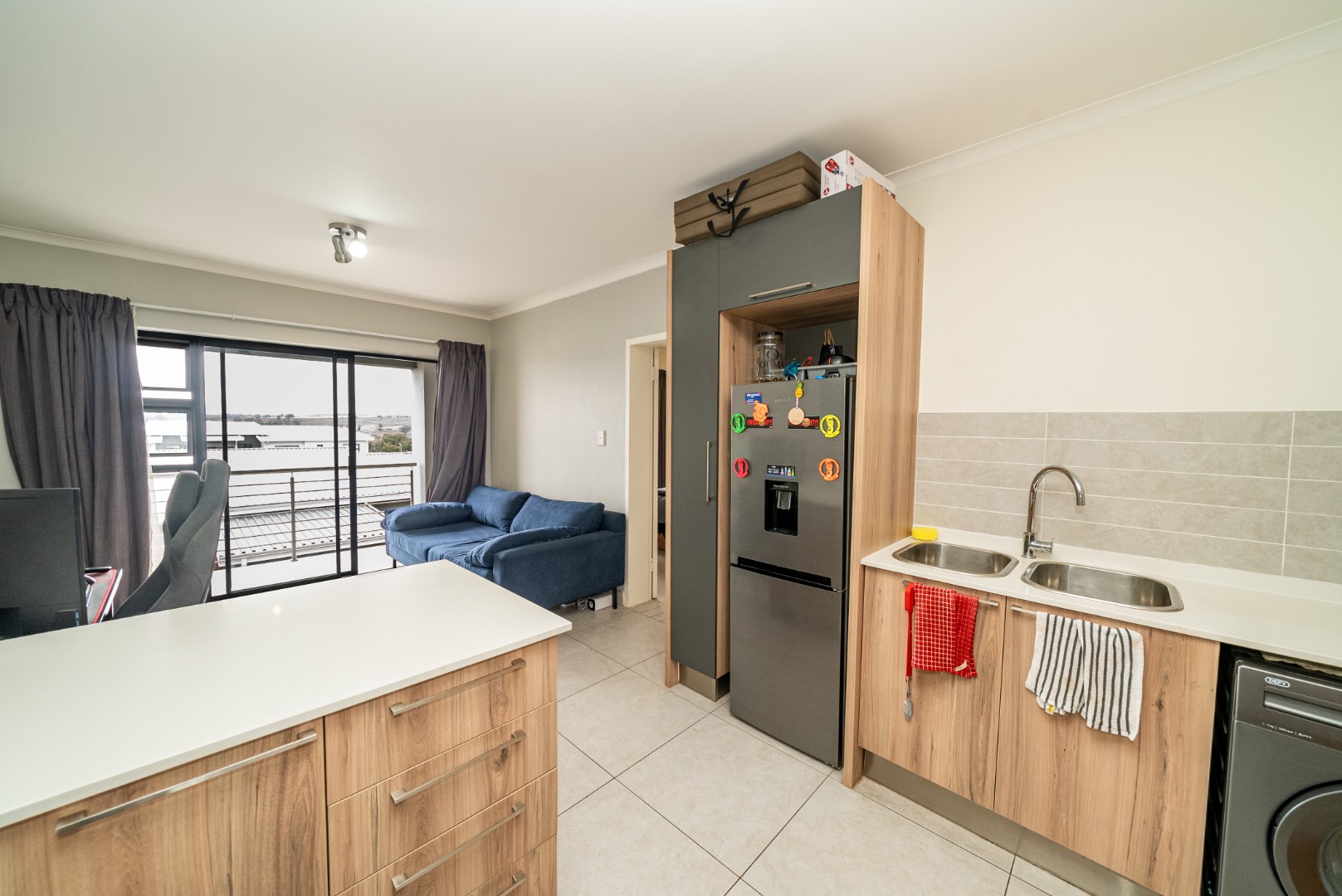 The apartment features a well-designed open-plan layout, seamlessly connecting the lounge and kitchen areas, creating a spacious and functional environment. The modern kitchen is equipped for everyday living, while the lounge provides direct access to a private balcony through elegant sliding doors. This outdoor space is perfect for relaxed entertaining. Practical amenities include a gas geyser for energy efficiency and fibre readiness, ensuring high-speed internet connectivity.