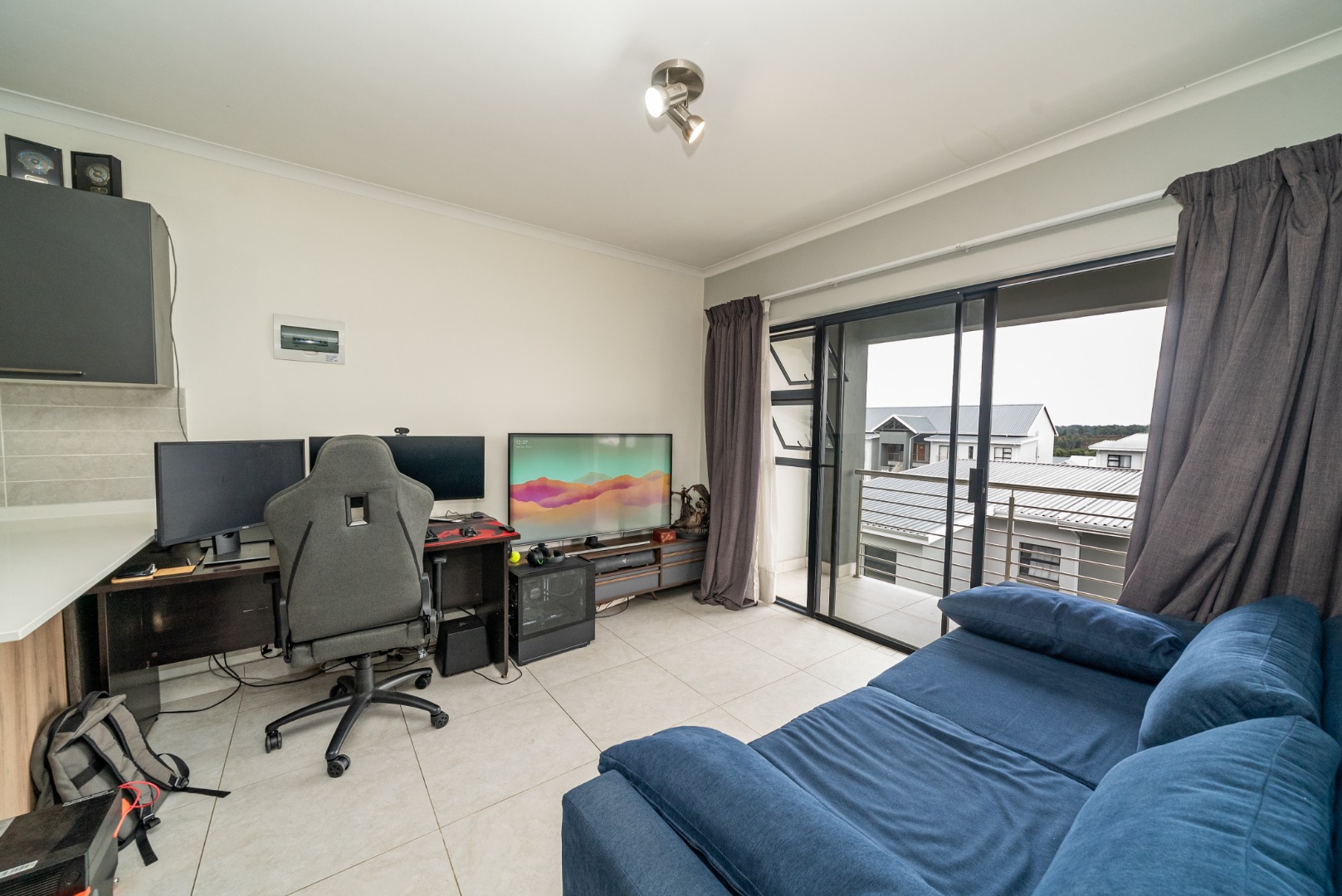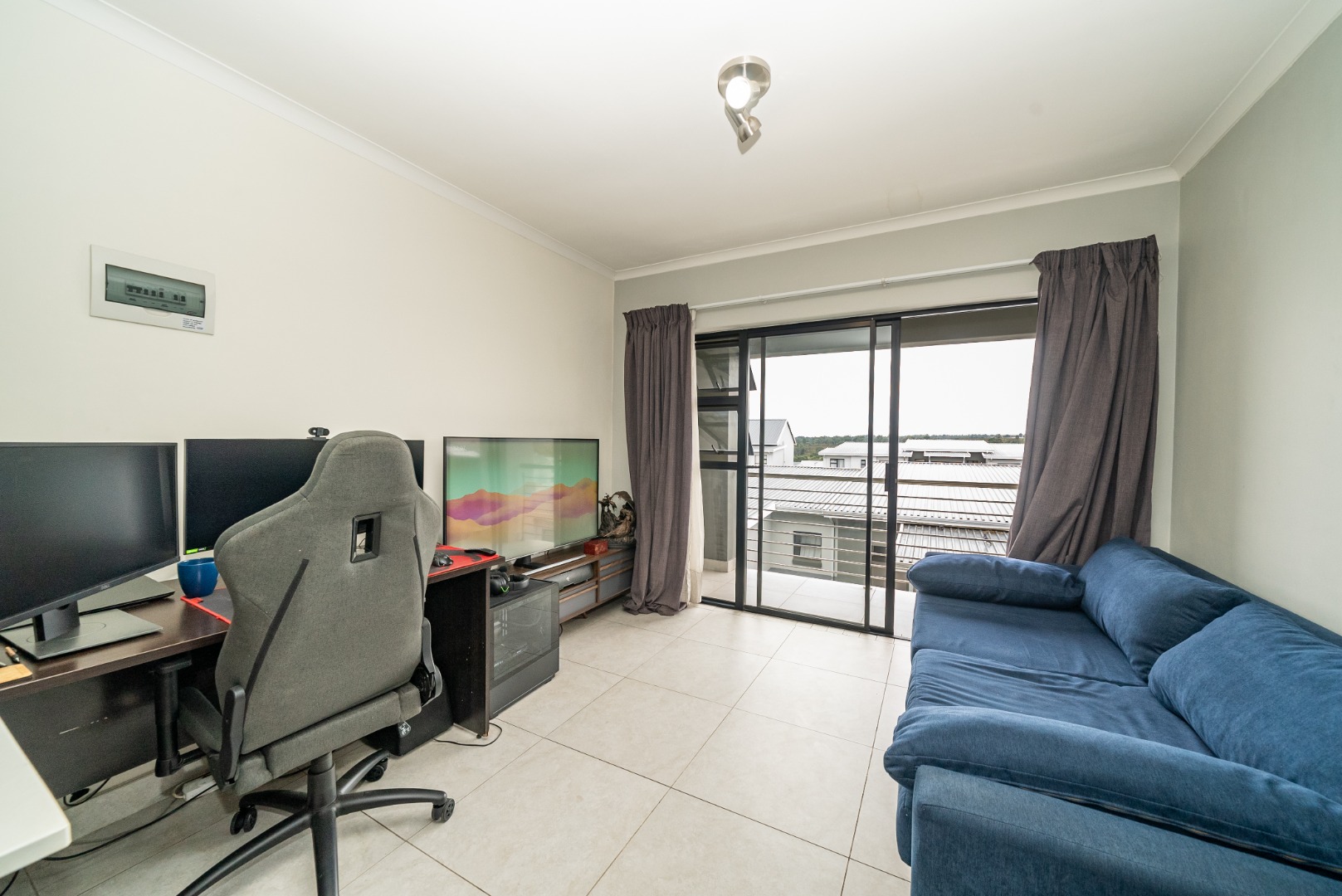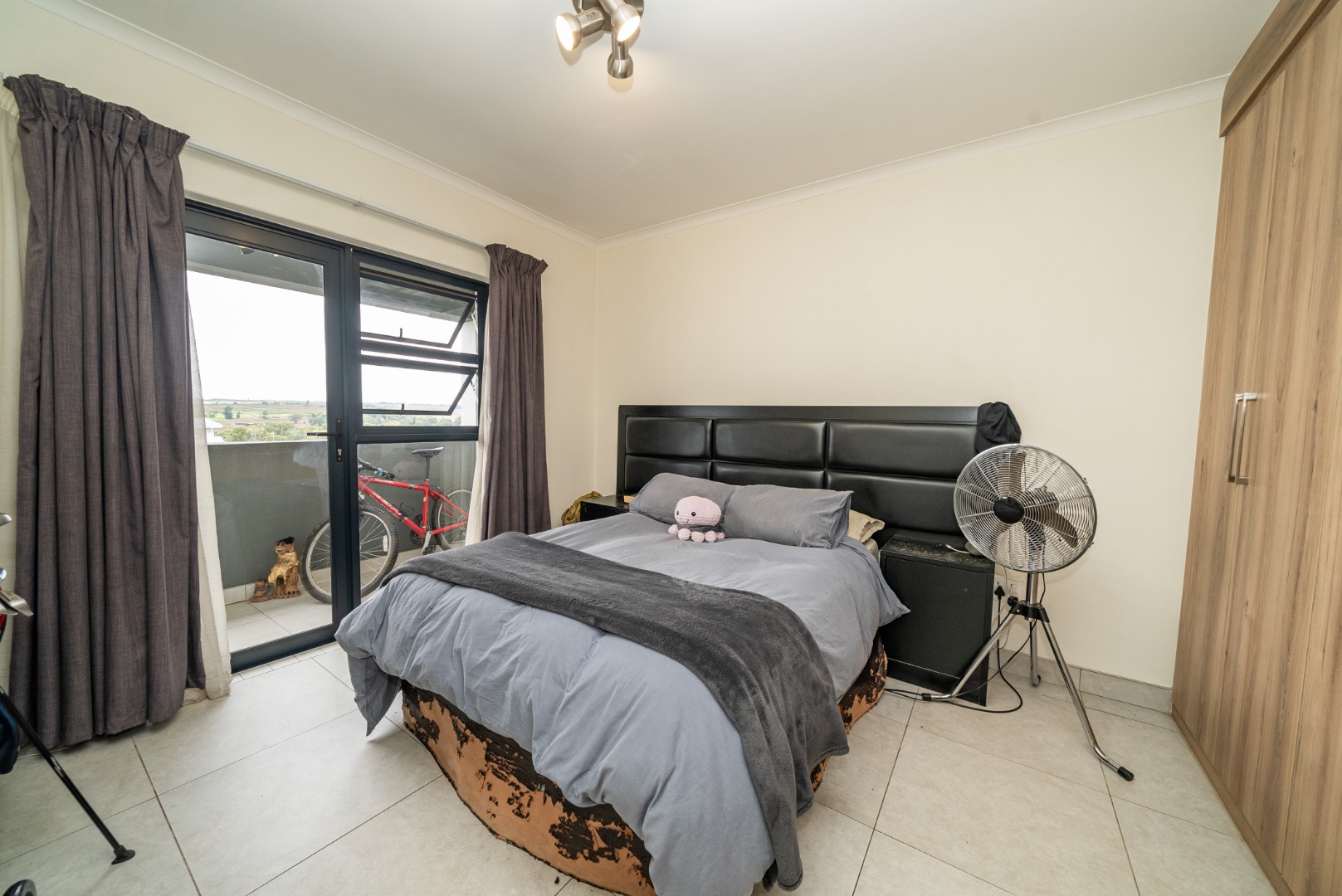 The apartment features a well-designed open-plan layout, seamlessly connecting the lounge and kitchen areas, creating a spacious and functional environment. The modern kitchen is equipped for everyday living, while the lounge provides direct access to a private balcony through elegant sliding doors. This outdoor space is perfect for relaxed entertaining. Practical amenities include a gas geyser for energy efficiency and fibre readiness, ensuring high-speed internet connectivity.