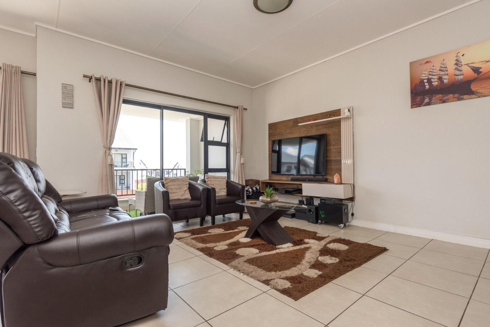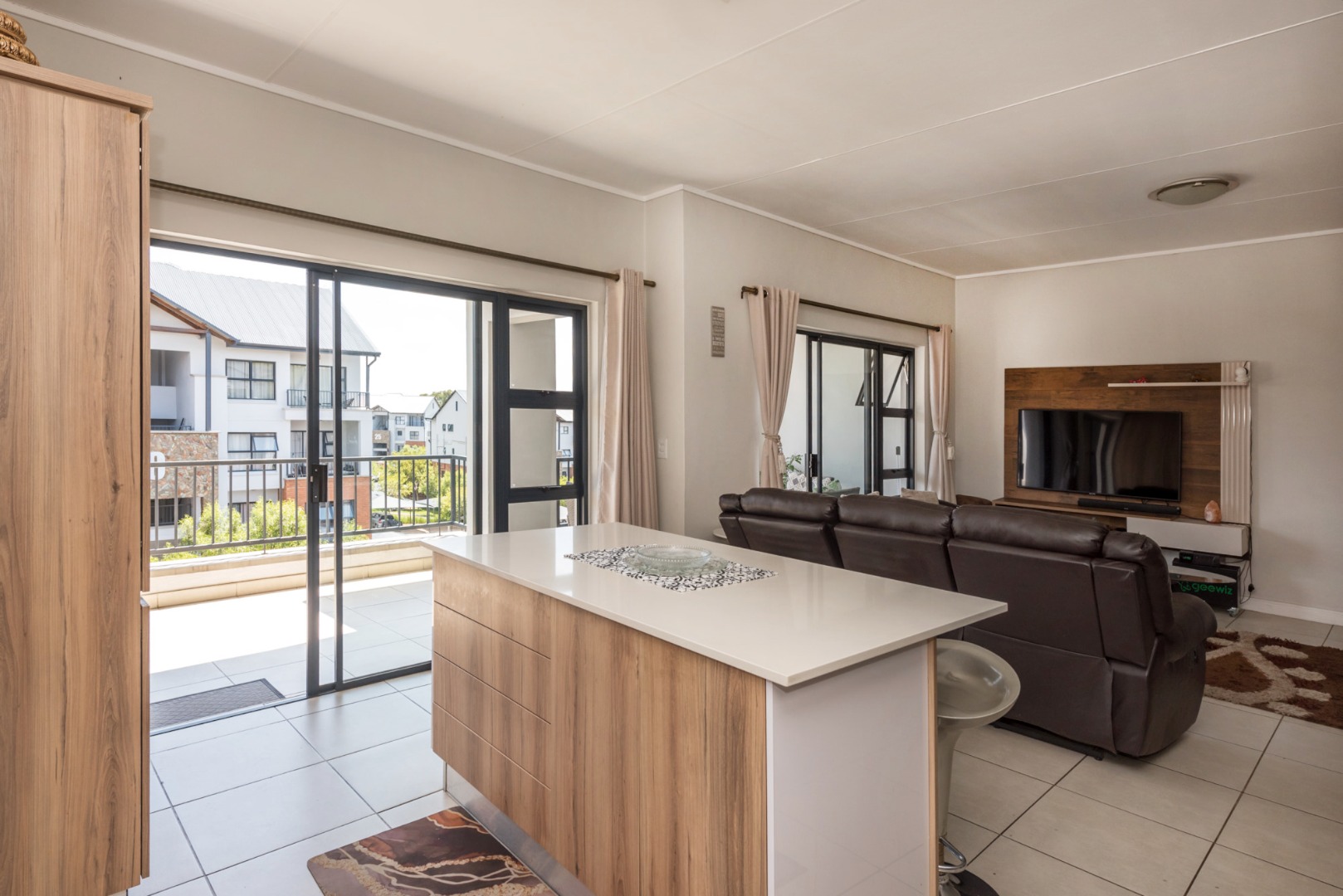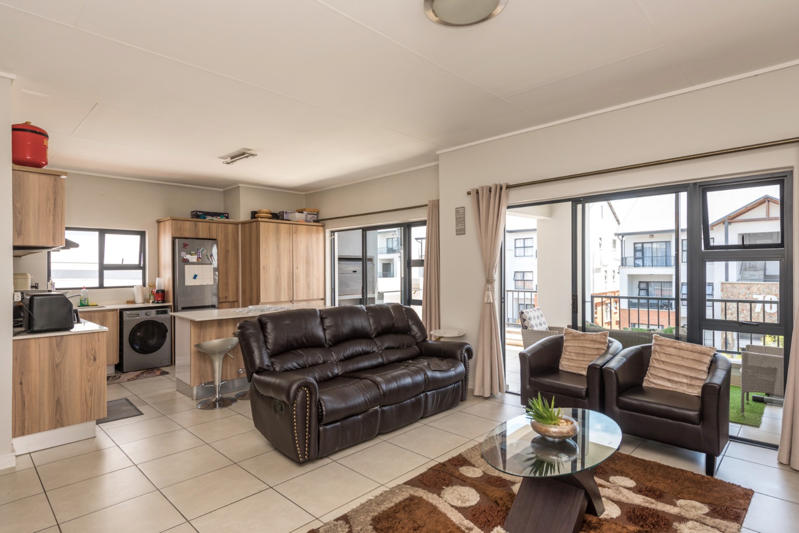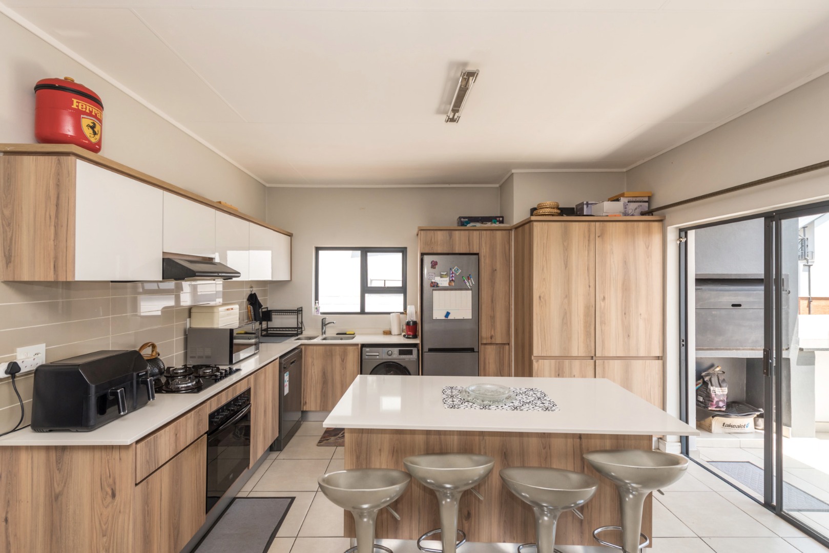 The sleek kitchen showcases modern two-tone cabinetry, a tiled backsplash and integrated appliances, including an oven, hob, extractor fan, dishwasher and washing machine, combining functionality with refined finishes. The open-plan lounge and kitchen are both fitted with sliding doors that lead onto a generously sized, covered patio complete with a built-in braai, making it ideal for entertaining or relaxed outdoor living.