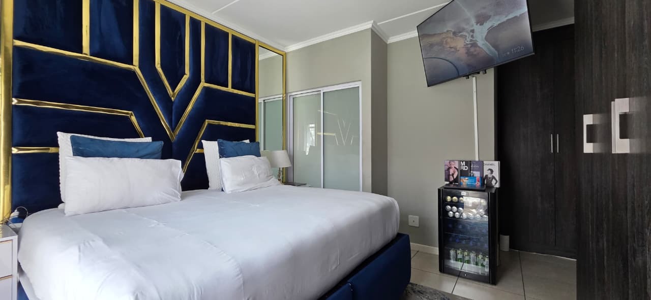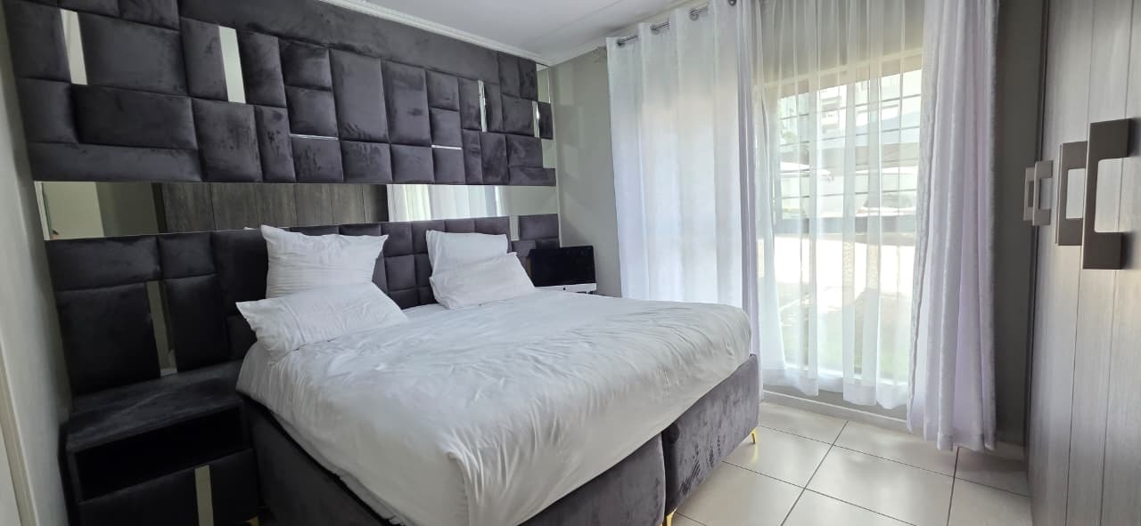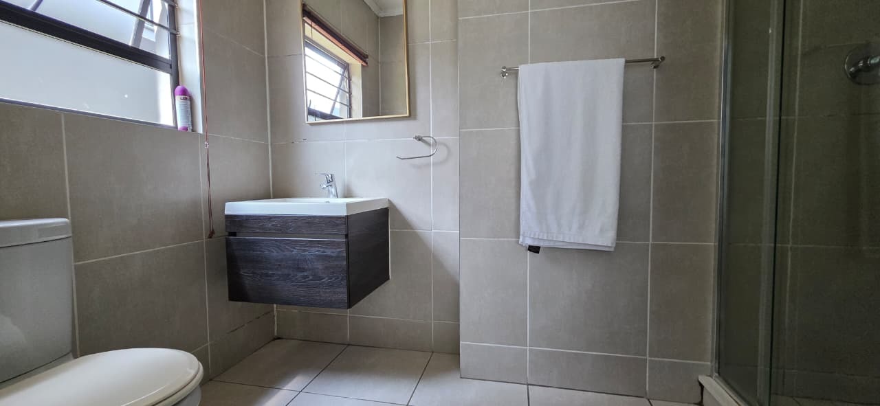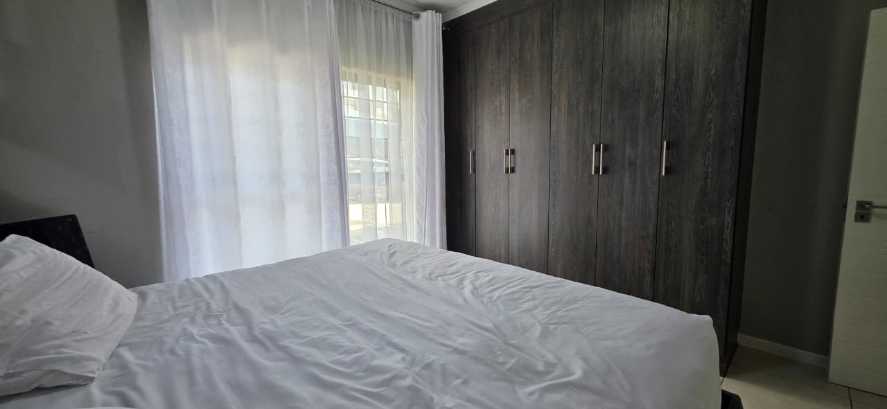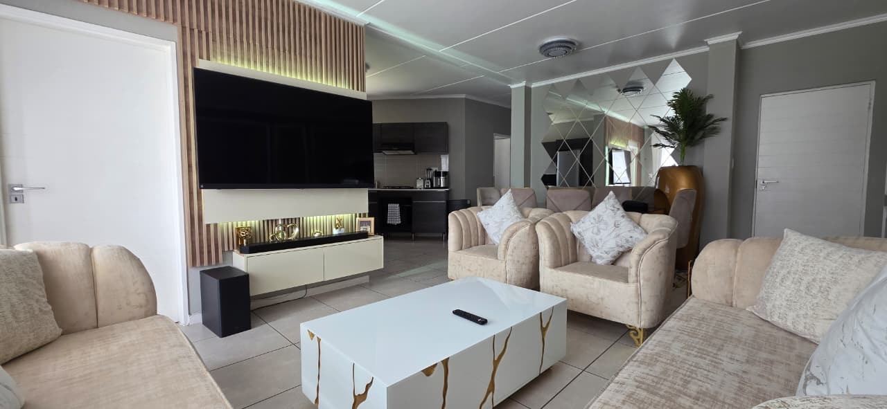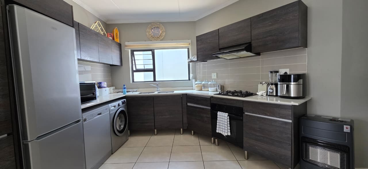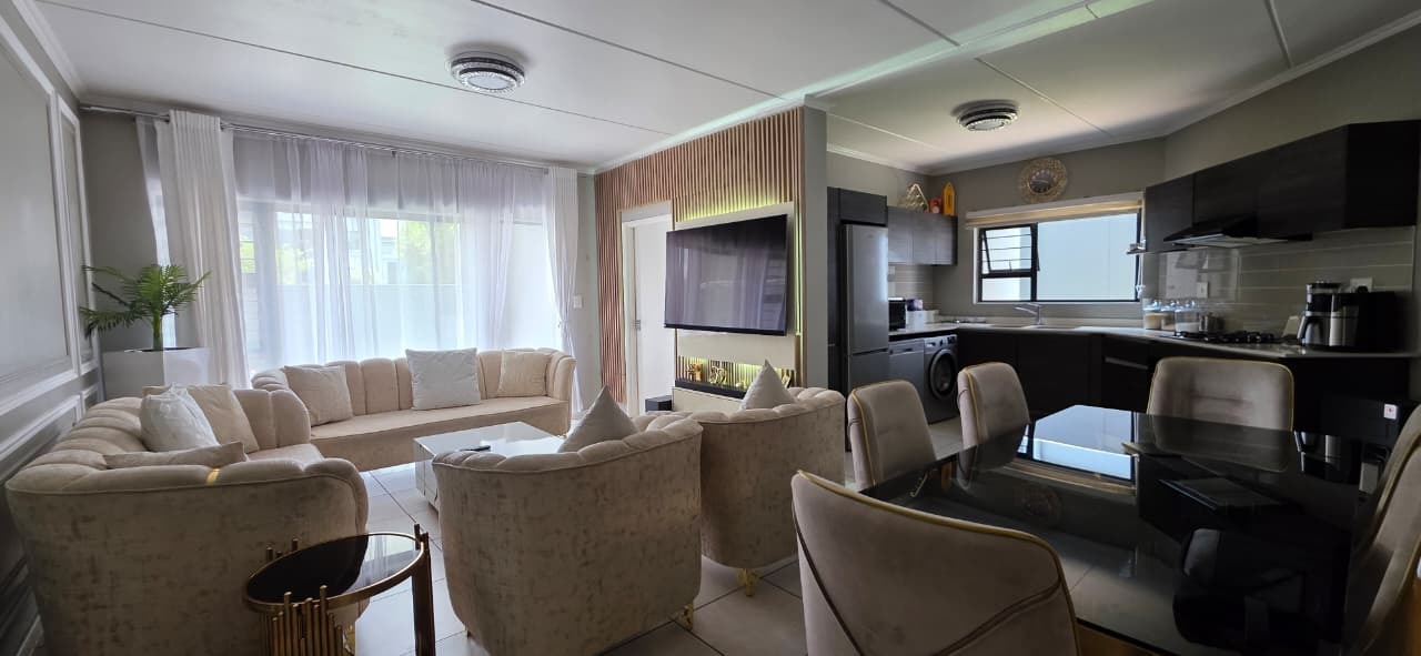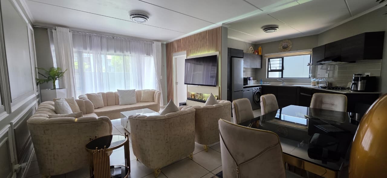 This contemporary 107 sqm apartment offers sophisticated living within a secure complex in Modderfontein, Edenvale. An inviting open-plan layout seamlessly integrates the lounge, dining area, and a modern kitchen. The kitchen boasts dark wood-look cabinetry and light countertops creating a stylish and functional space. Light floor tiles and elegant accents complete the cohesive design.