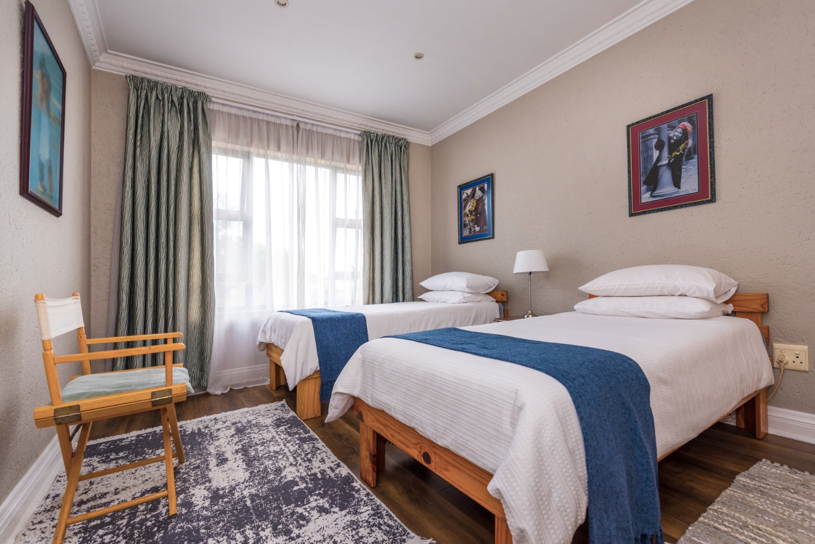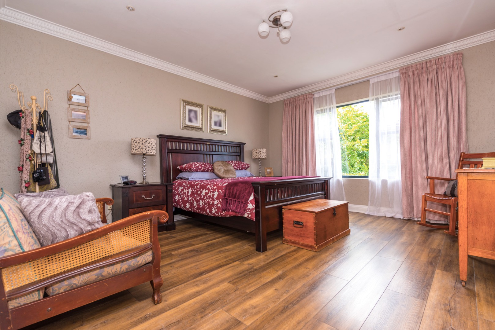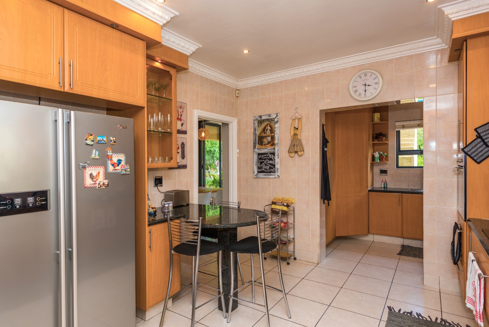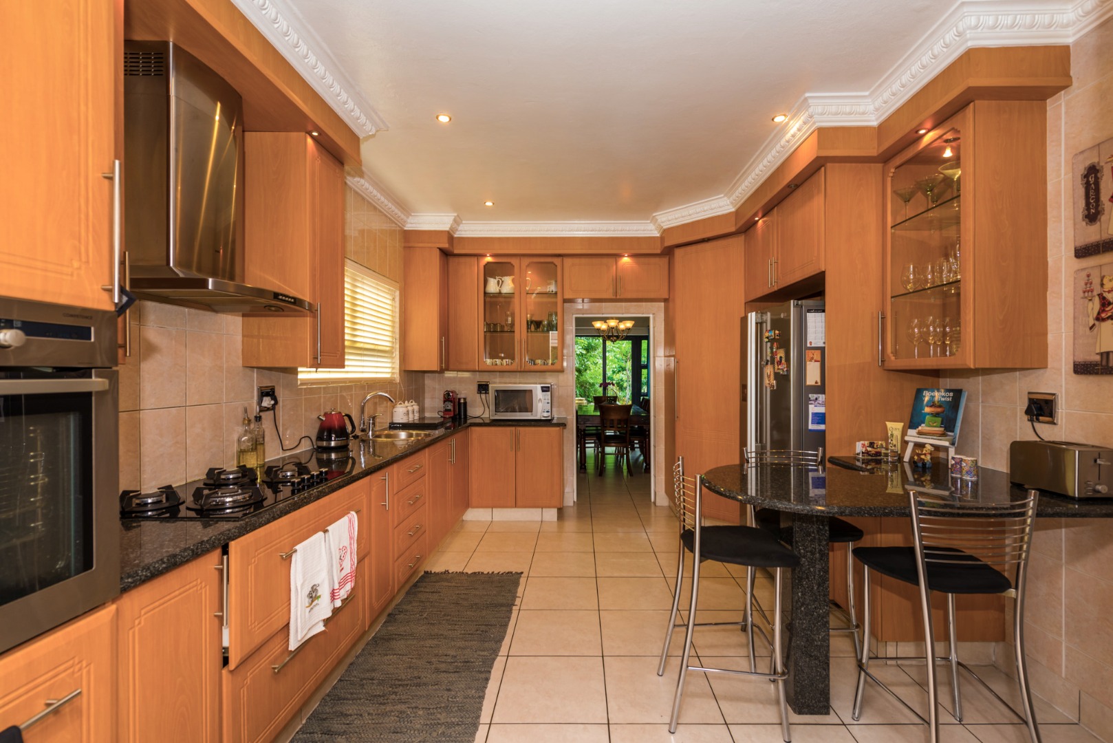 The modern, separate kitchen features Rustenburg black granite tops, a gas hob, electric oven and extractor fan, along with a practical three-seater breakfast counter. A separate scullery provides under-counter space for three appliances as well as room for a double-door fridge. Downstairs also includes a generous study and a guest toilet for added convenience.