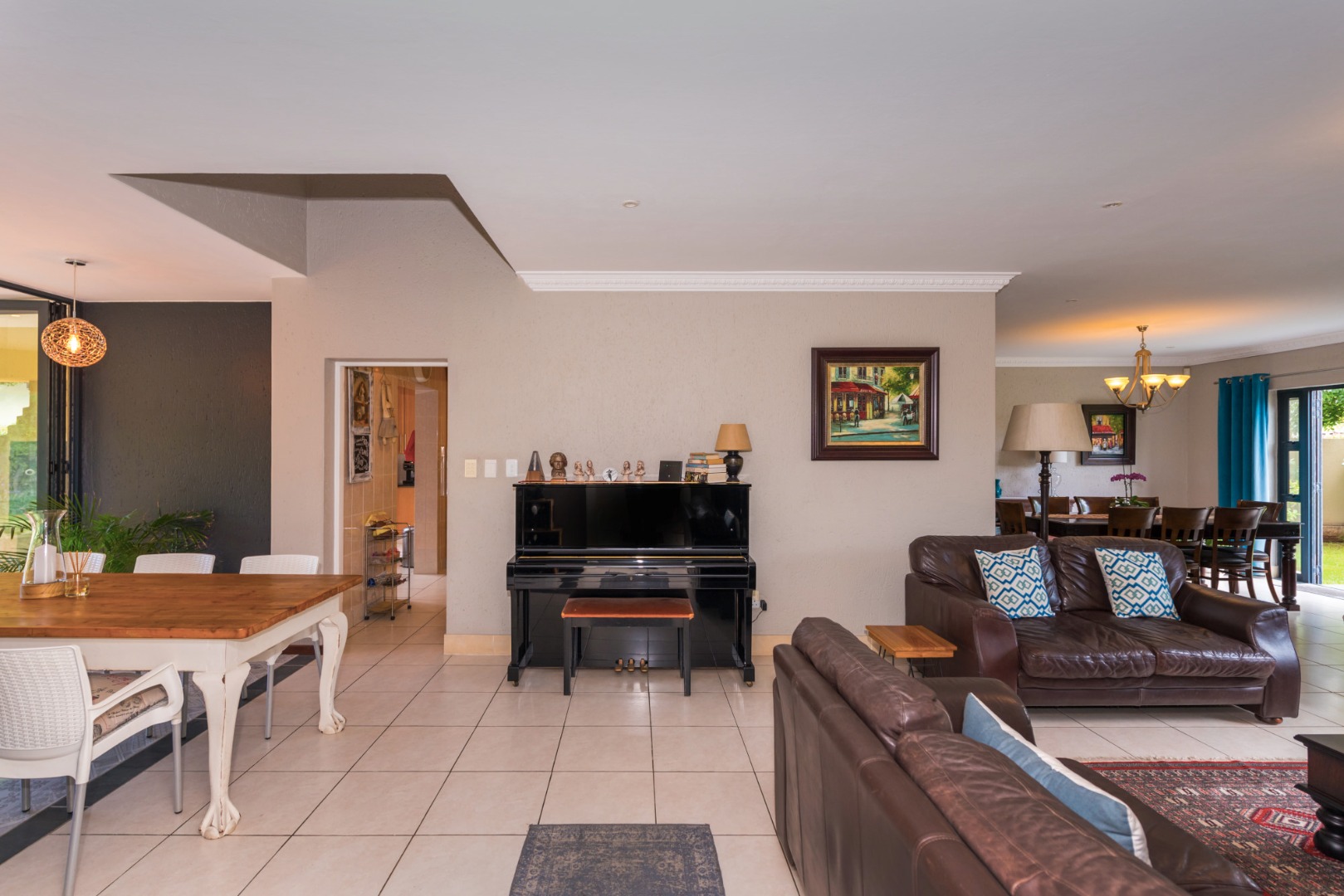The living spaces are designed for easy family living and effortless entertaining. The open-plan lounge and dining room create a warm and welcoming atmosphere, while an additional dining area flows out to a covered entertainment patio fitted with a built-in braai. This outdoor area overlooks the sparkling pool and private back garden, making it ideal for hosting family and friends.