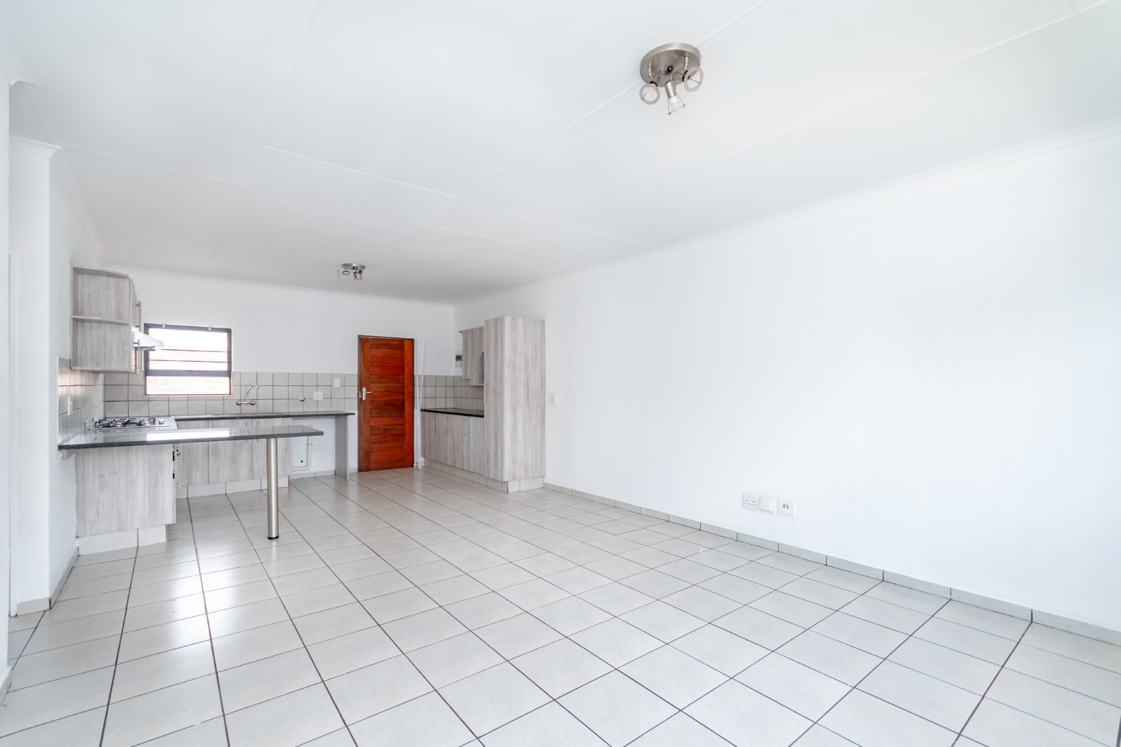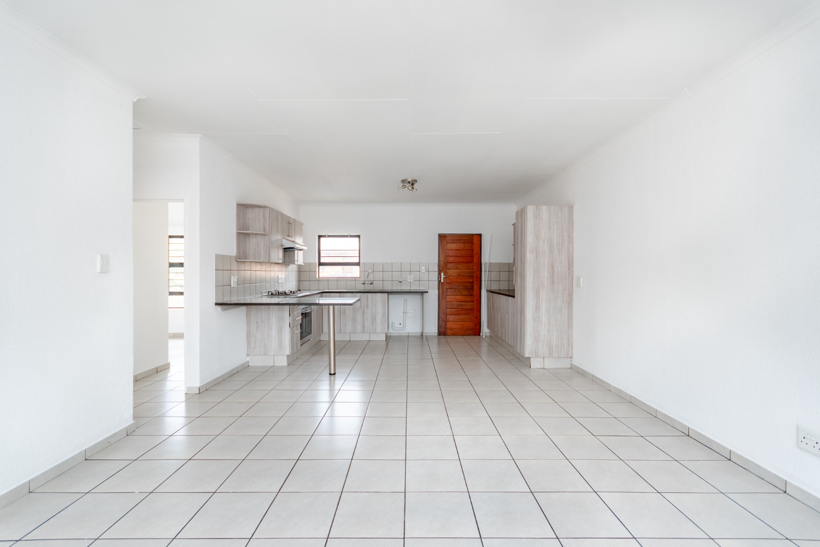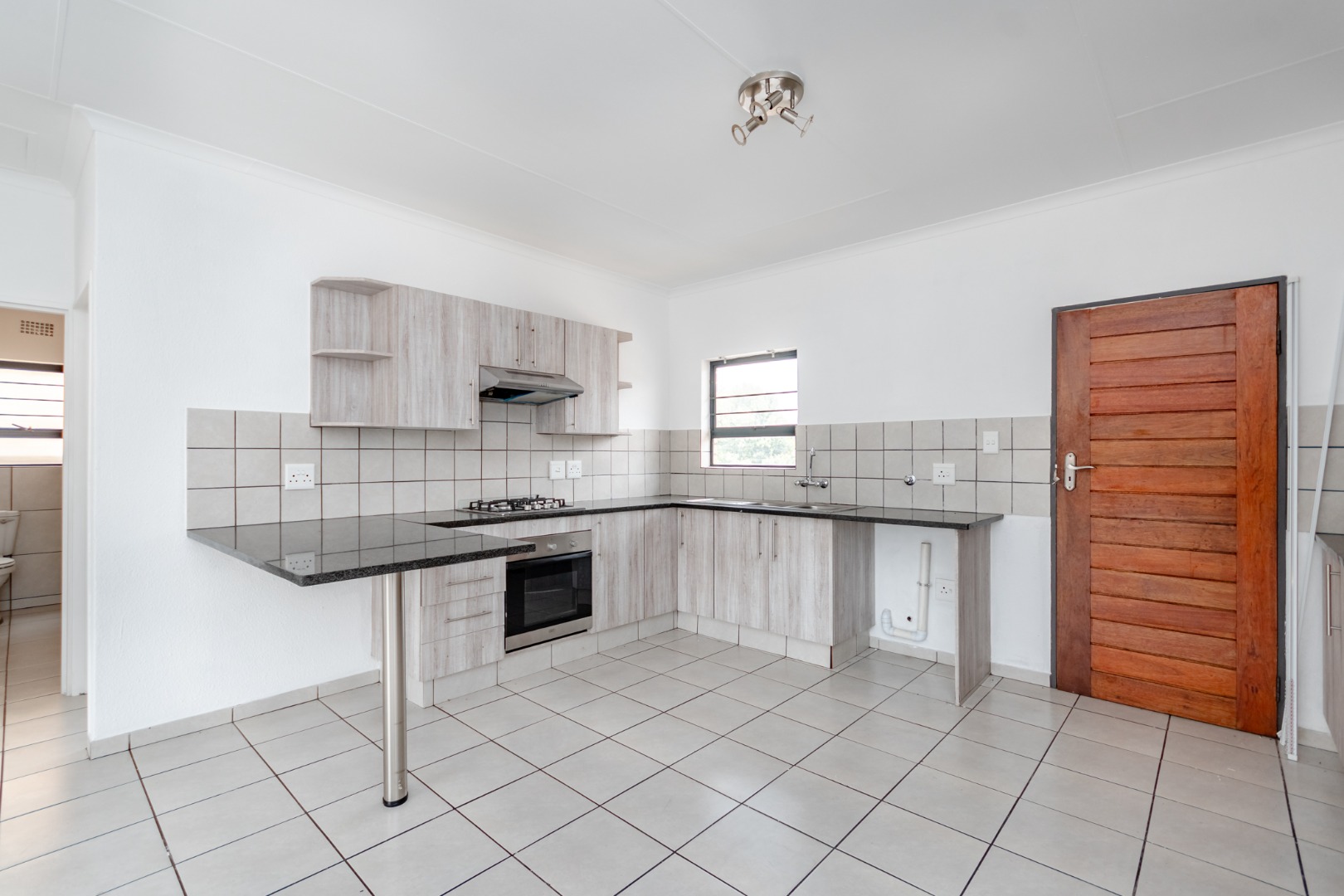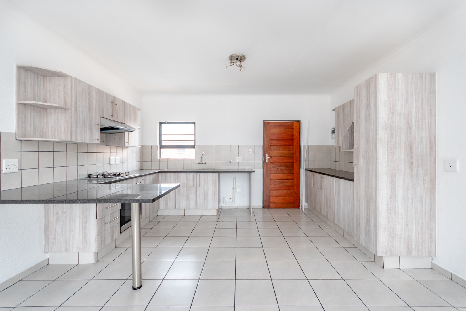 The unit comes equipped with an integrated gas hob, oven, and extractor fan, complemented by a convenient breakfast bar,solar geyser. Throughout the unit, clean white walls and light-colored tiled flooring create a bright and airy atmosphere, enhanced by ample natural light from well-placed windows.