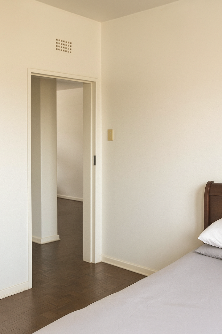 The residence offers two comfortable bedrooms, each featuring neutral tones and classic parquet flooring, providing a versatile canvas for personal styling. Natural light floods both rooms through generous windows, with one bedroom including a dedicated desk area. The property includes 1.5 bathrooms; a main bathroom with a modern glass shower enclosure, toilet, and wall-mounted sink, and a separate guest toilet, both featuring clean tiled surfaces.