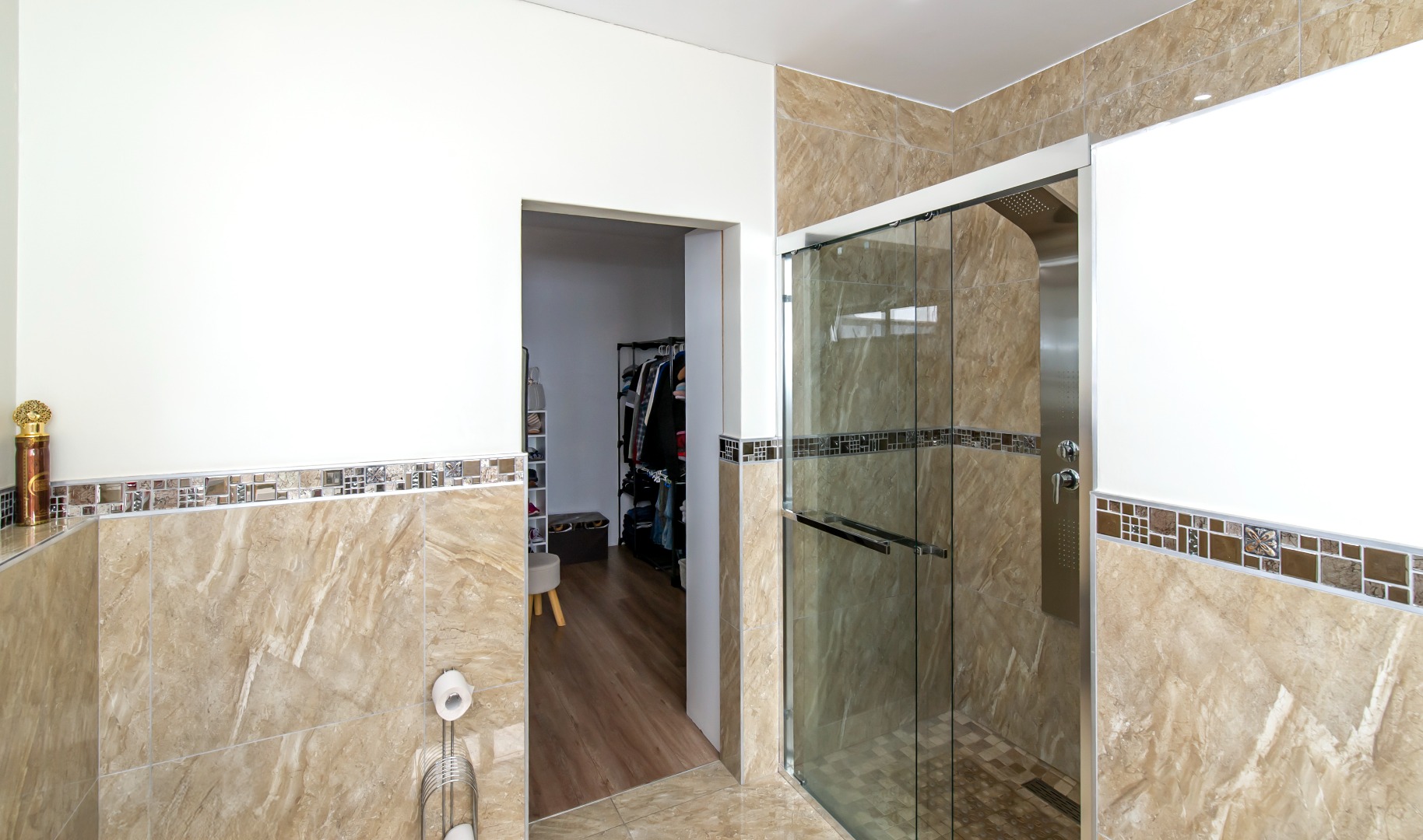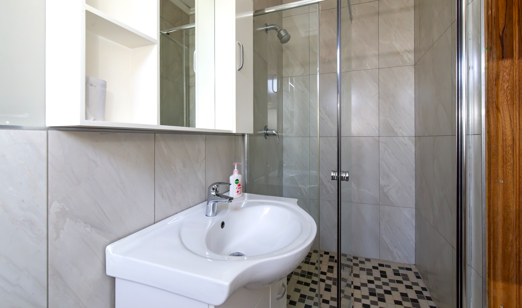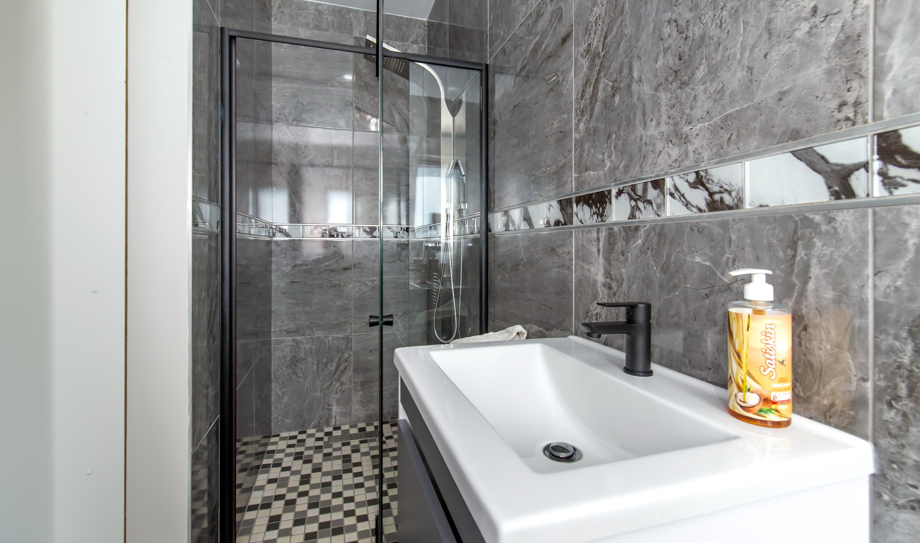 Two expansive bedrooms with laminate flooring and built-in cupboards, one with an aircon and a full en-suite bathroom. A full guest bathroom and a separate guest toilet are also located downstairs which is ideal for visitors and entertaining