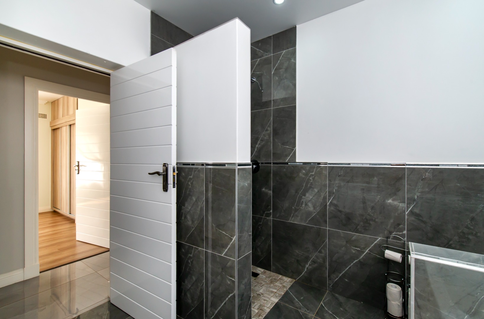 Up a flight of stairs, you’ll find an expansive open-plan living space that combines comfort with flexibility. The layout offers ample room for a dining area, a TV room, and a cozy lounge, all flowing together seamlessly to create an inviting atmosphere for both relaxation and entertaining. Large doors open onto a balcony, adding natural light and extending the living area outdoors.