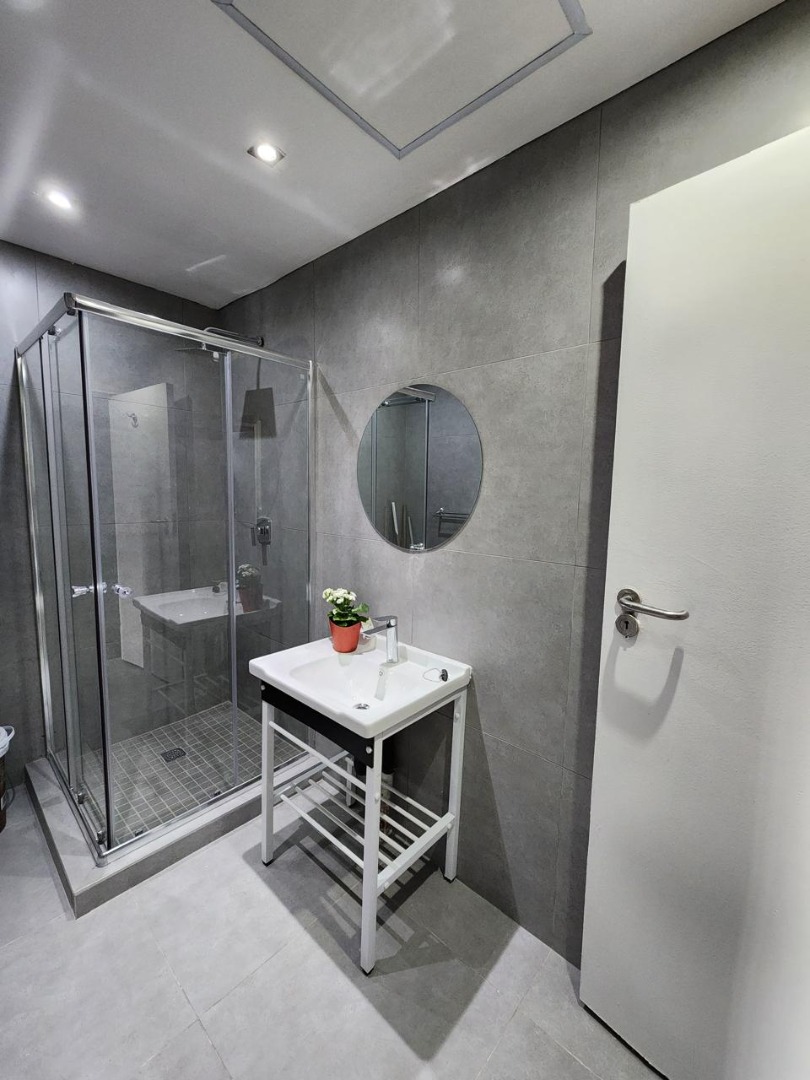 The compact, L-shaped kitchen is well-appointed with modern dark wood cabinetry, complemented by granite-look countertops and a characterful brick-style backsplash. It comes equipped with an integrated oven, hob, and dishwasher, providing essential amenities for daily living. The sleek, modern bathroom features gray tiled walls and flooring, a glass-enclosed walk-in shower, a freestanding basin, and recessed lighting, ensuring a clean and functional space.