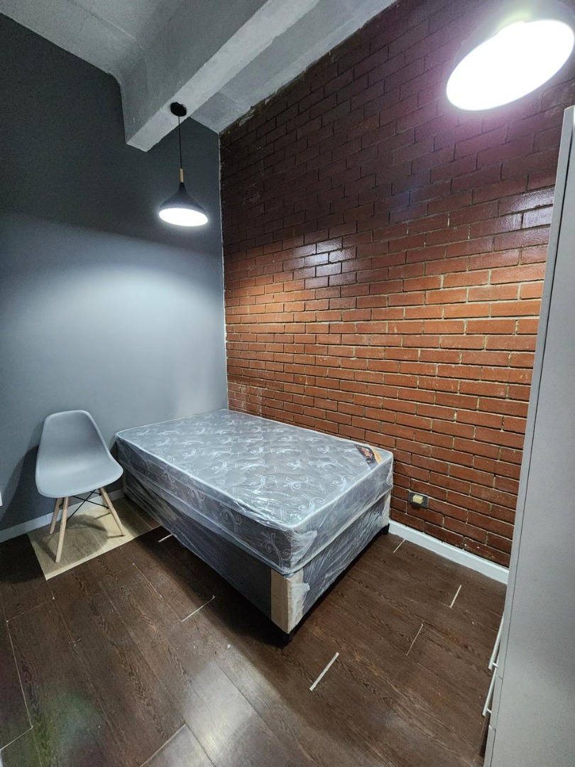 The unit comprises four bedrooms, each designed for comfort and practicality. The bedrooms showcases a distinctive industrial design with exposed red brick, dark gray walls, and dark wood-look flooring, illuminated by modern pendant lights. The efficient layout maximises space, making it perfectly suited for multiple occupants seeking individual living areas within a shared environment.