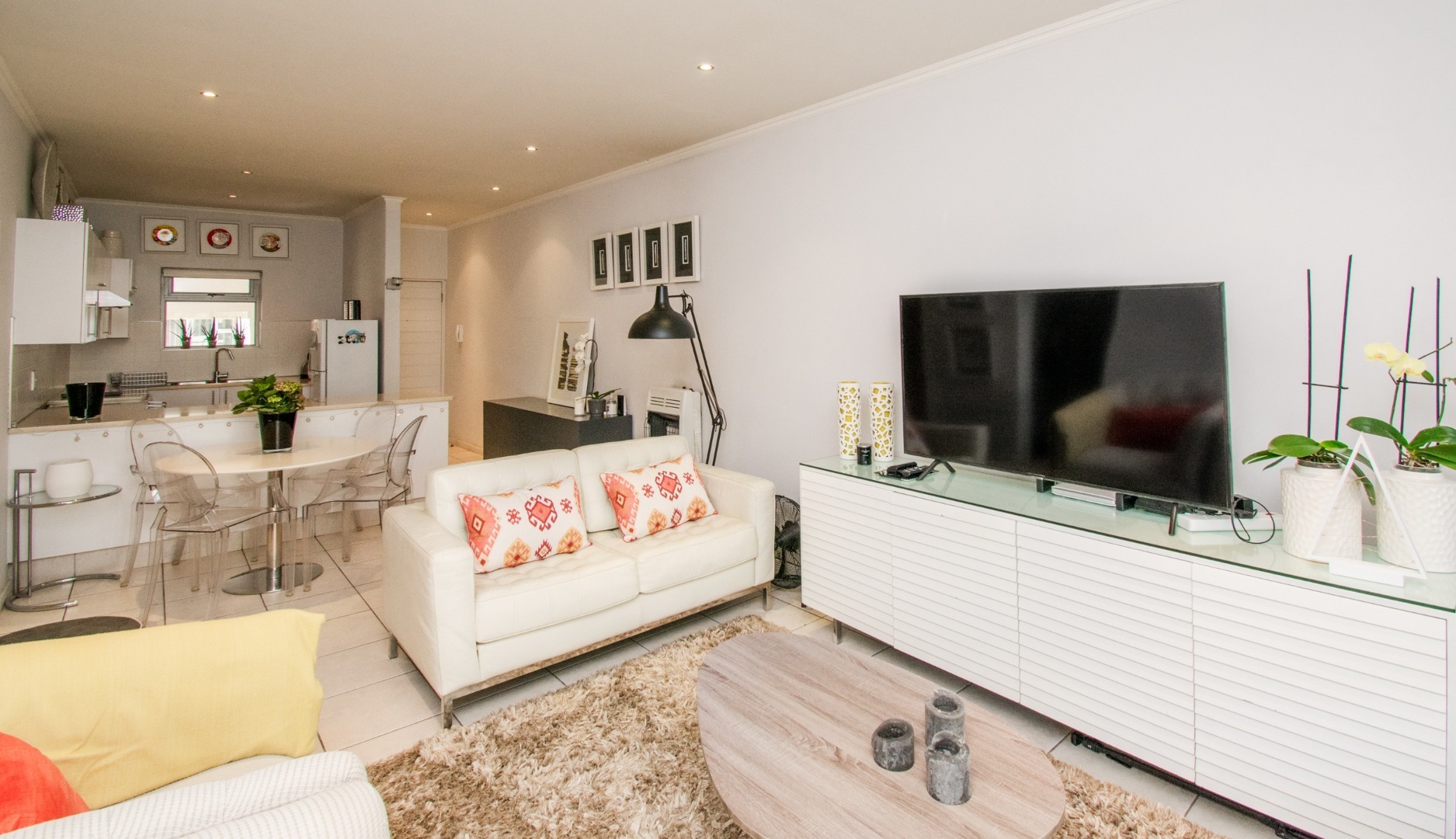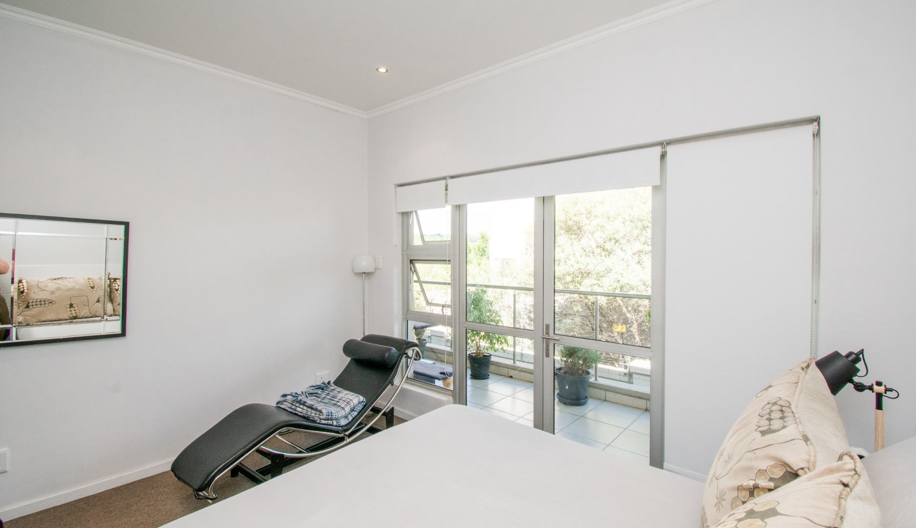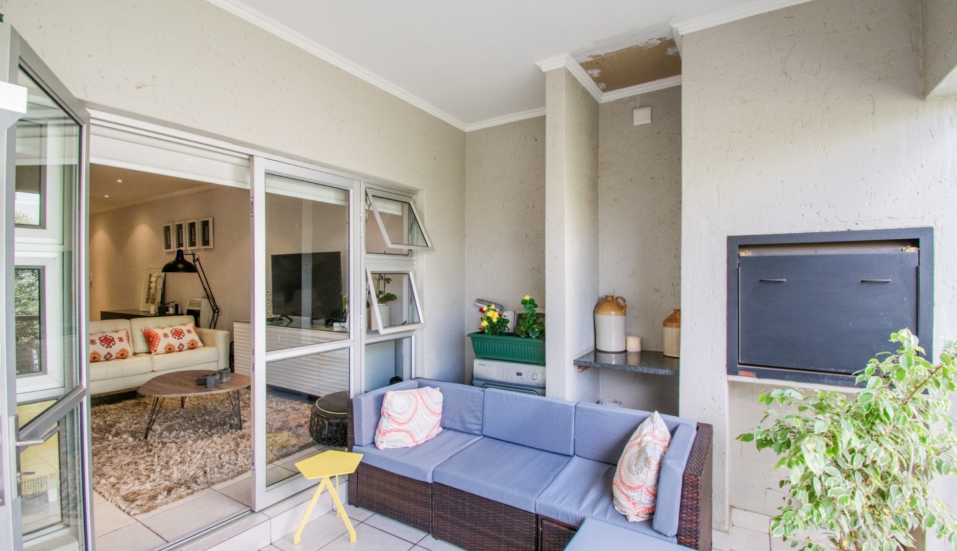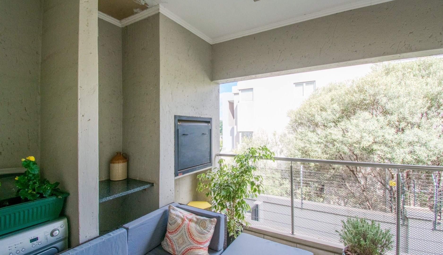 Off the kitchen is the open-plan living area, which flows onto a lovely spacious balcony with a built-in-braai which can host an outside dining set or lounger set to induce relaxation.