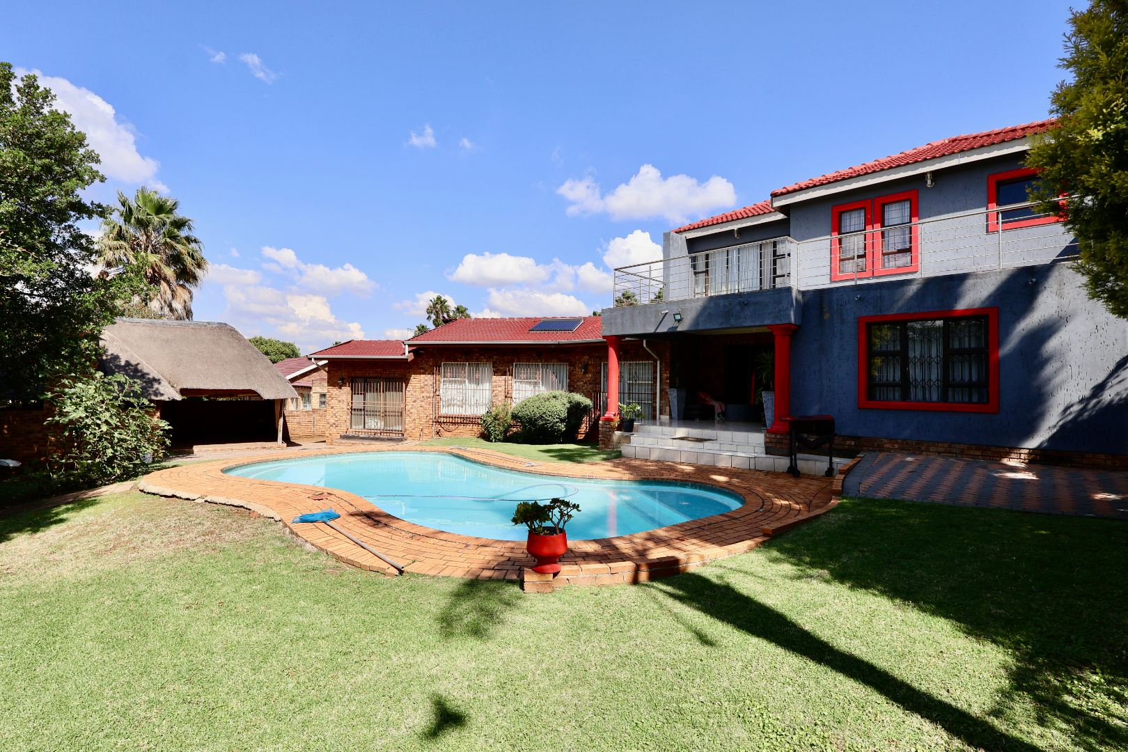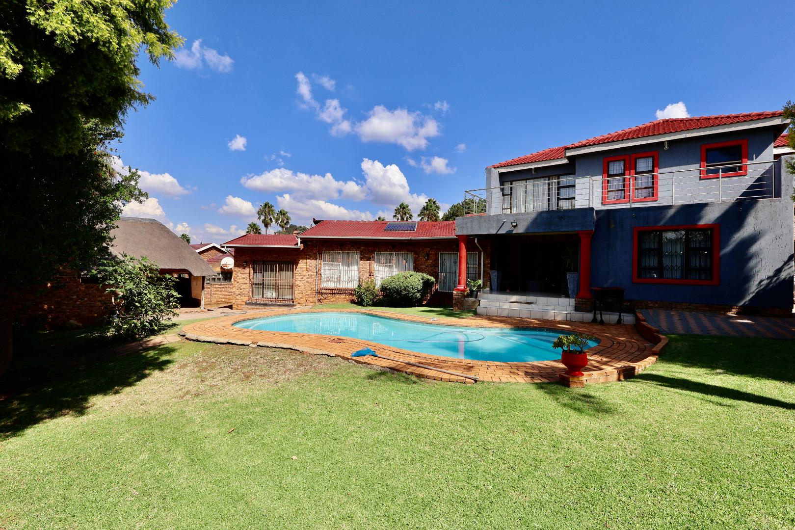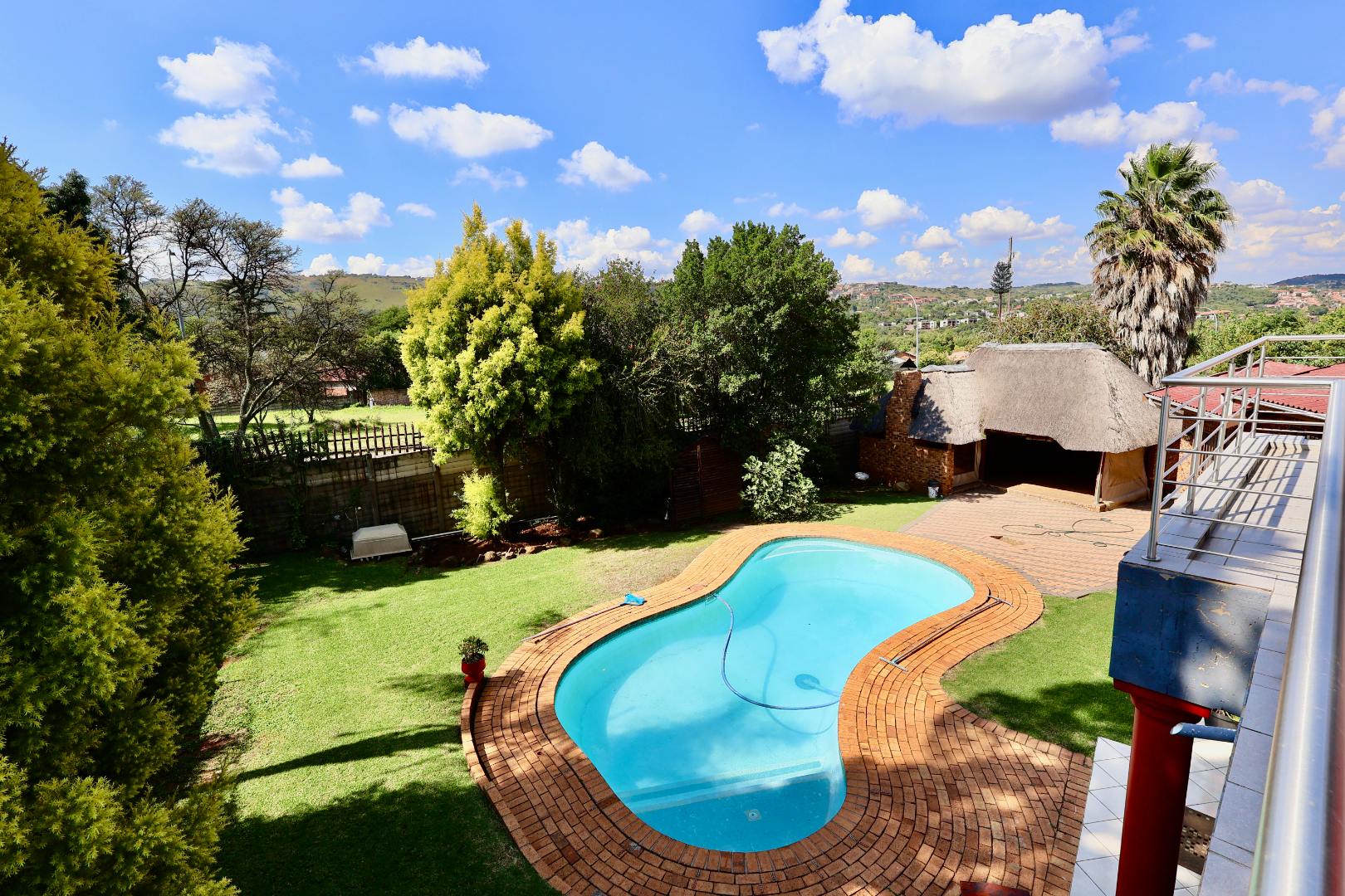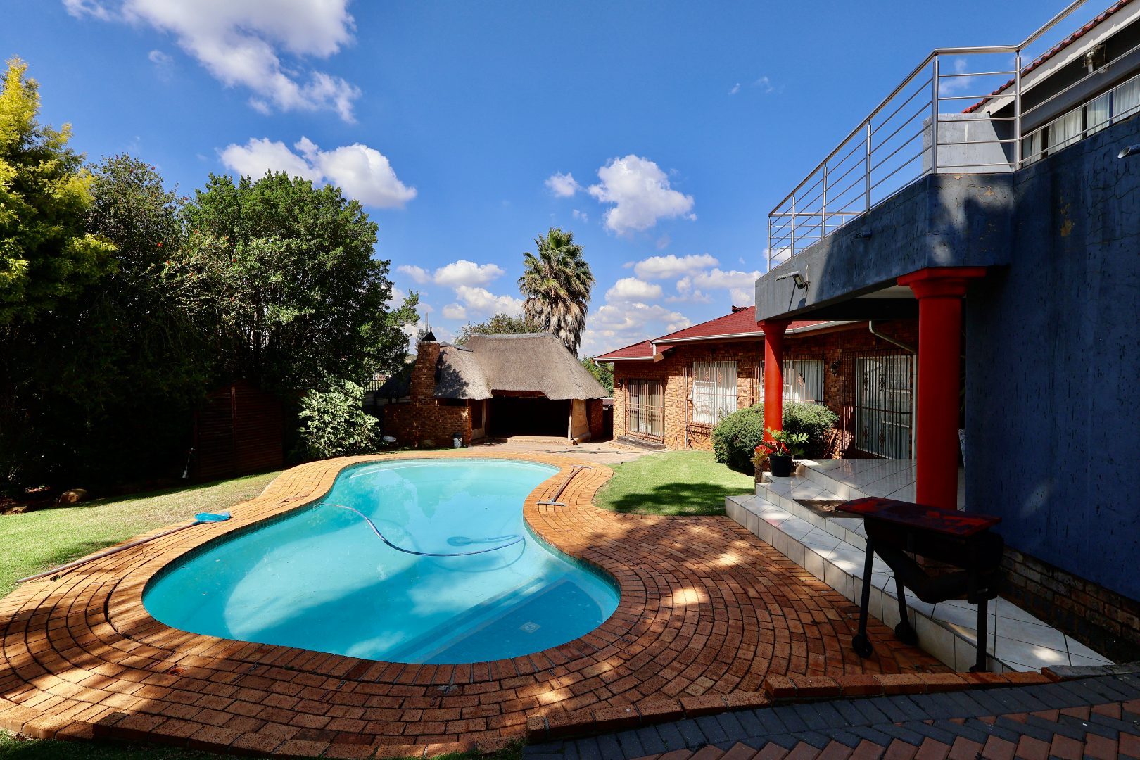 Outdoors, the fully fitted lapa with electrical fittings overlooks a sparkling swimming pool and a large, well-maintained garden, creating a welcoming environment for gatherings, celebrations, or relaxed weekend living.
