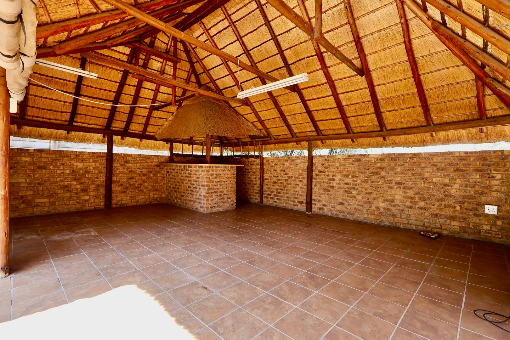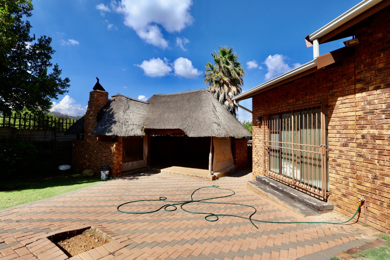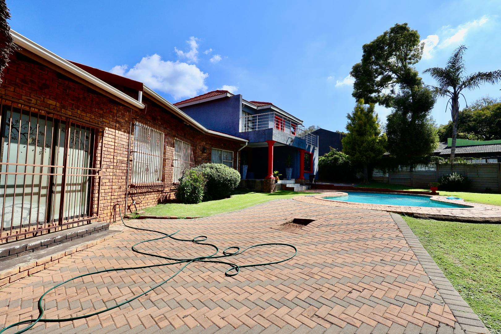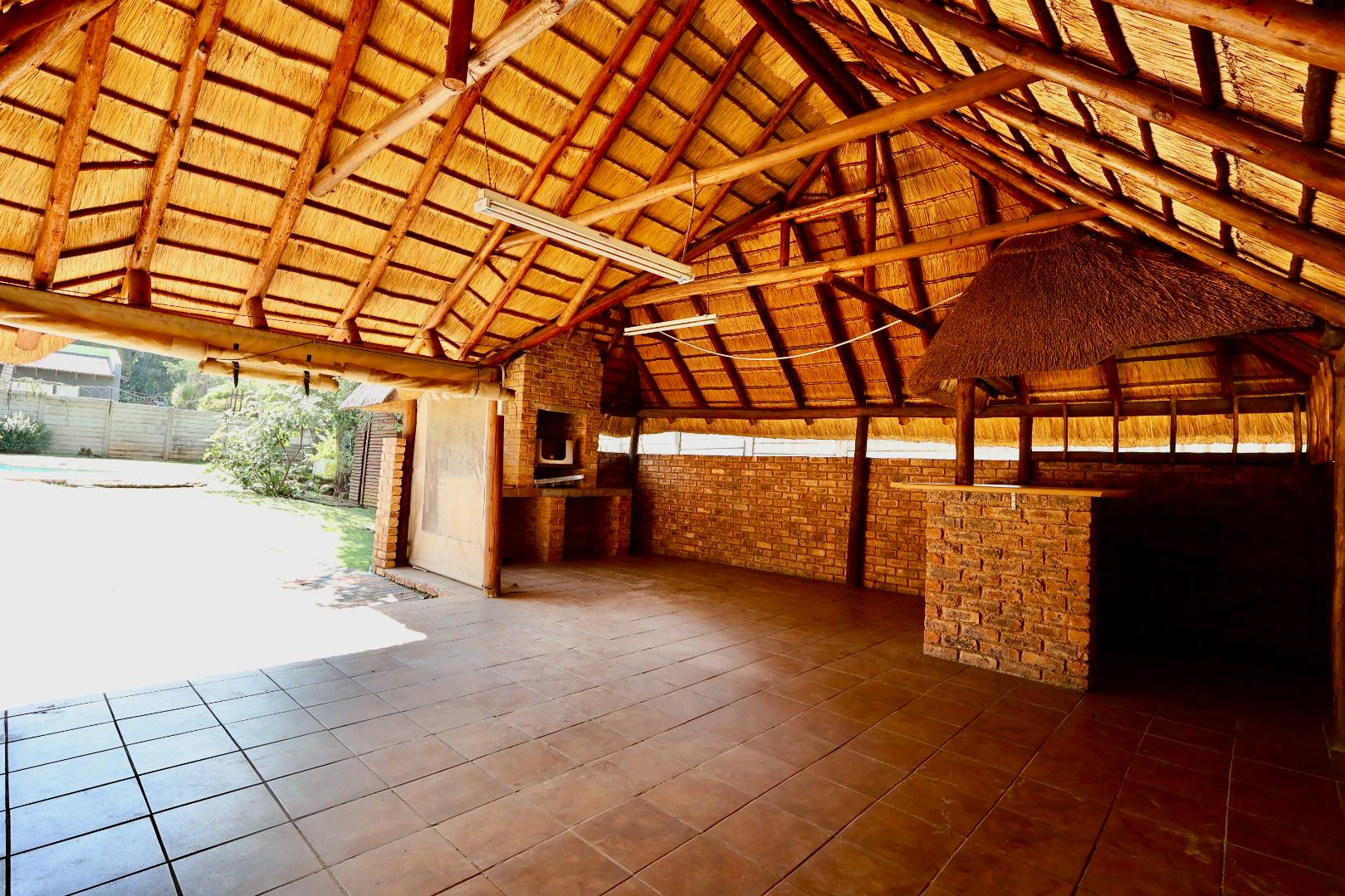 Outdoors, the fully fitted lapa with electrical fittings overlooks a sparkling swimming pool and a large, well-maintained garden, creating a welcoming environment for gatherings, celebrations, or relaxed weekend living.