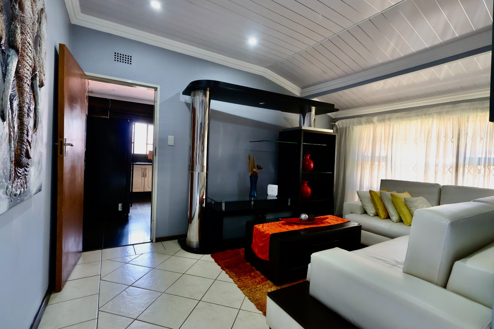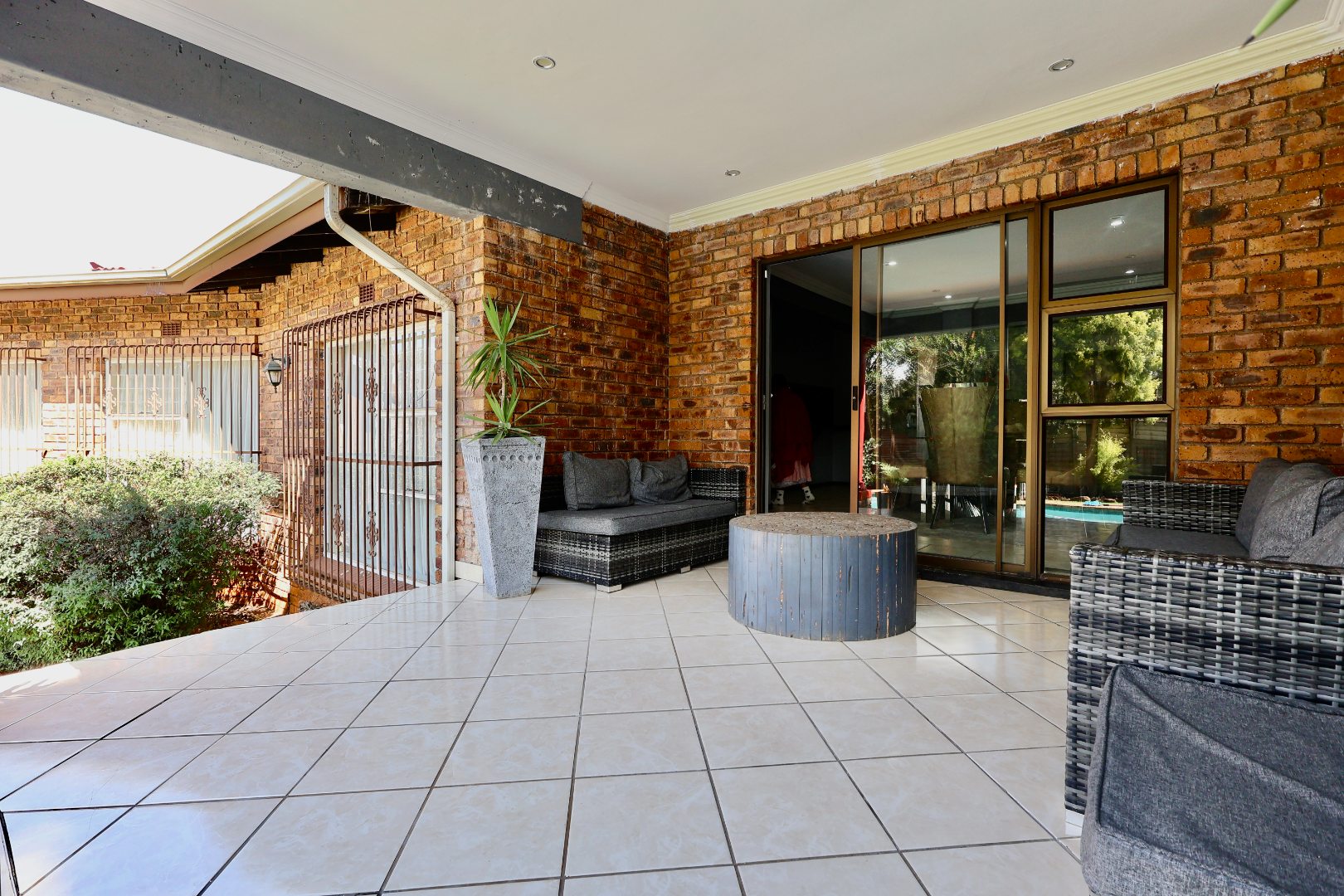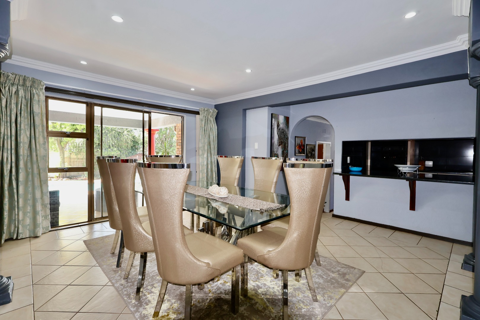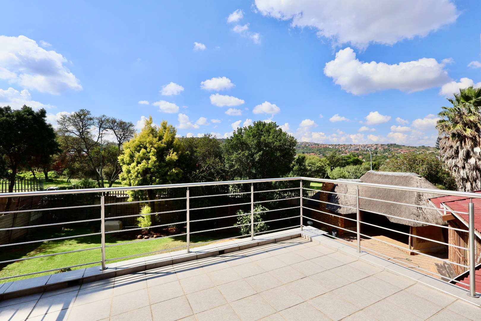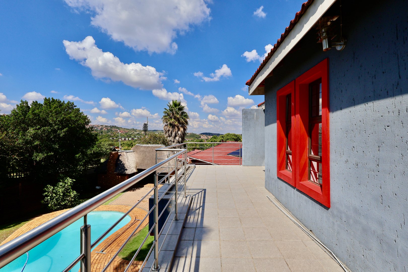 Outdoors, the fully fitted lapa with electrical fittings overlooks a sparkling swimming pool and a large, well-maintained garden, creating a welcoming environment for gatherings, celebrations, or relaxed weekend living.