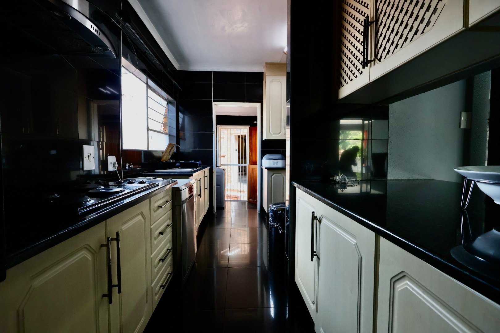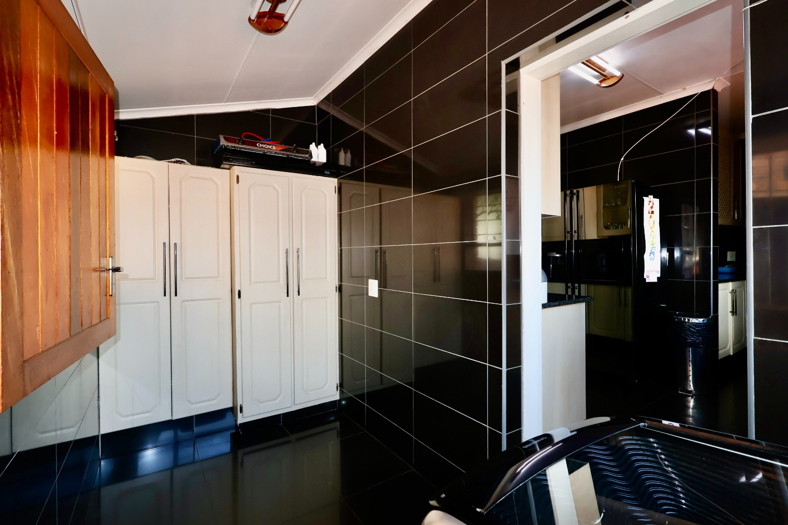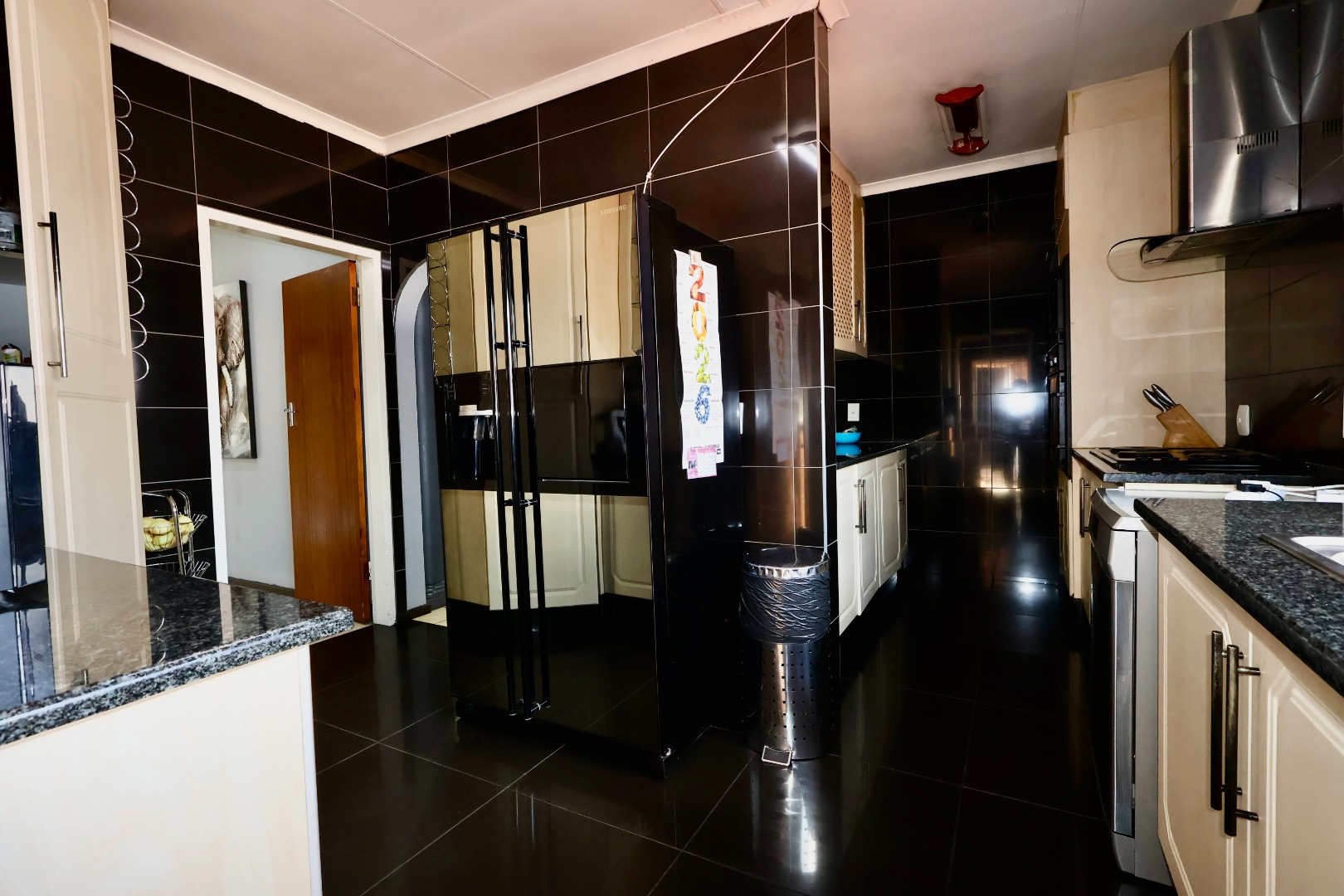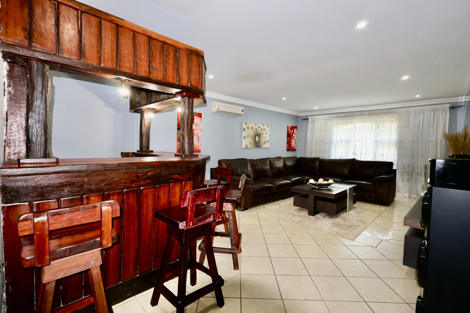 Outdoors, the fully fitted lapa with electrical fittings overlooks a sparkling swimming pool and a large, well-maintained garden, creating a welcoming environment for gatherings, celebrations, or relaxed weekend living.