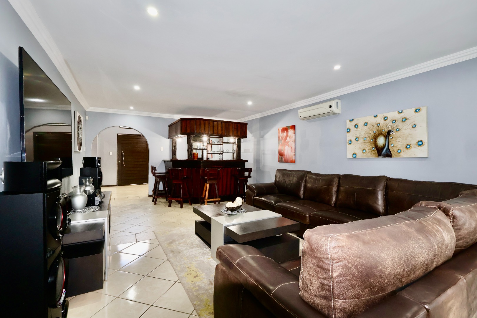 The main residence comprises five generously sized bedrooms and three well-appointed bathrooms, providing ample accommodation for a growing family. Three separate living areas create flexibility for relaxation, family time, or entertaining guests, while a formal dining room adds an elegant touch for special occasions. A dedicated bar area enhances the home’s entertainment appeal, seamlessly flowing into the outdoor spaces. An additional room offers the perfect opportunity for a home office or study, ideal for remote work or quiet retreat.