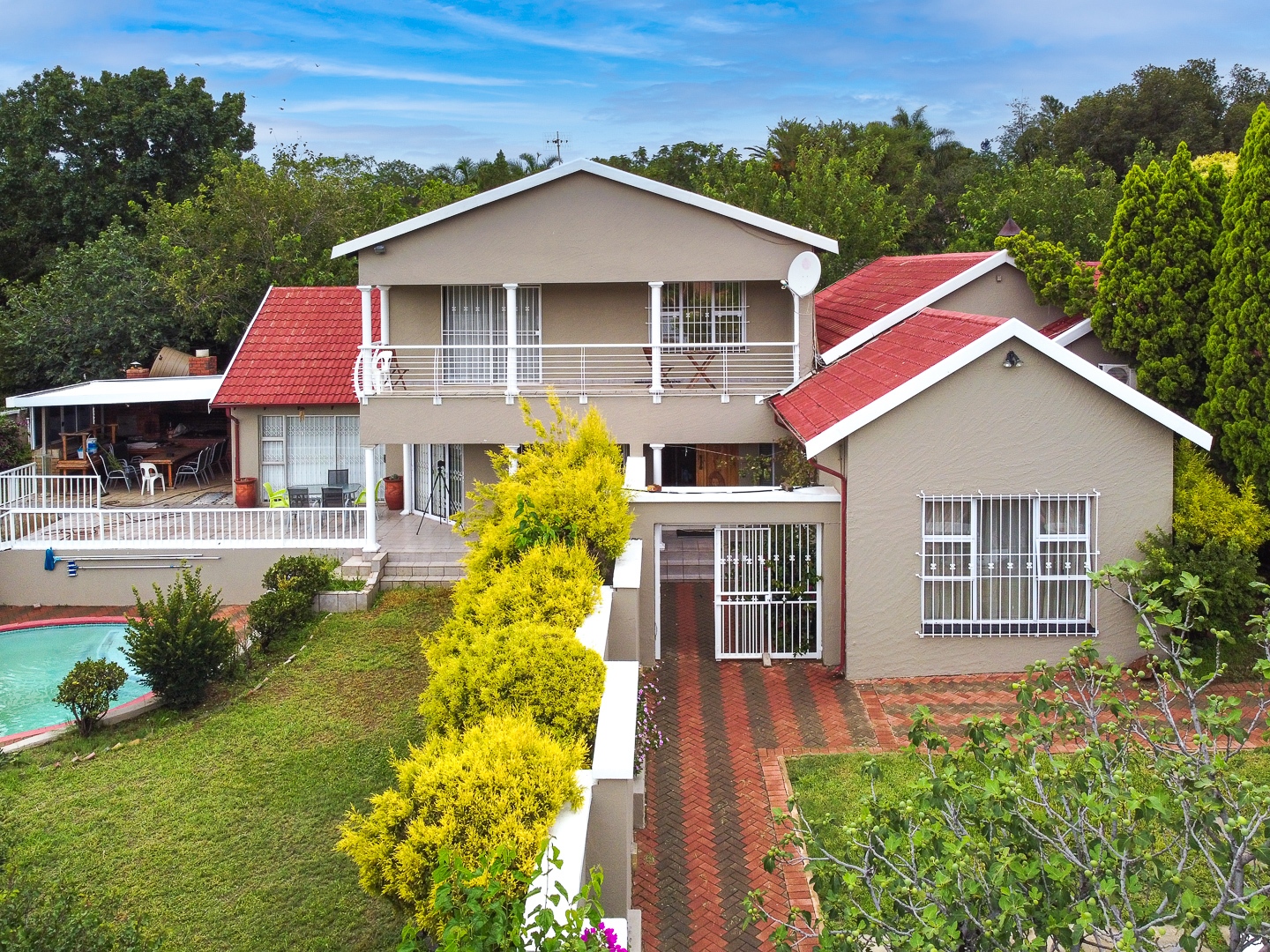 Boasting five bedrooms and four bathrooms (two of which are en-suite) this home is a sanctuary of comfort and elegance. With a grand entrance that opens into two spacious lounges, an elegant dining room, and a chic bar area, perfect for both intimate gatherings and lavish entertaining.