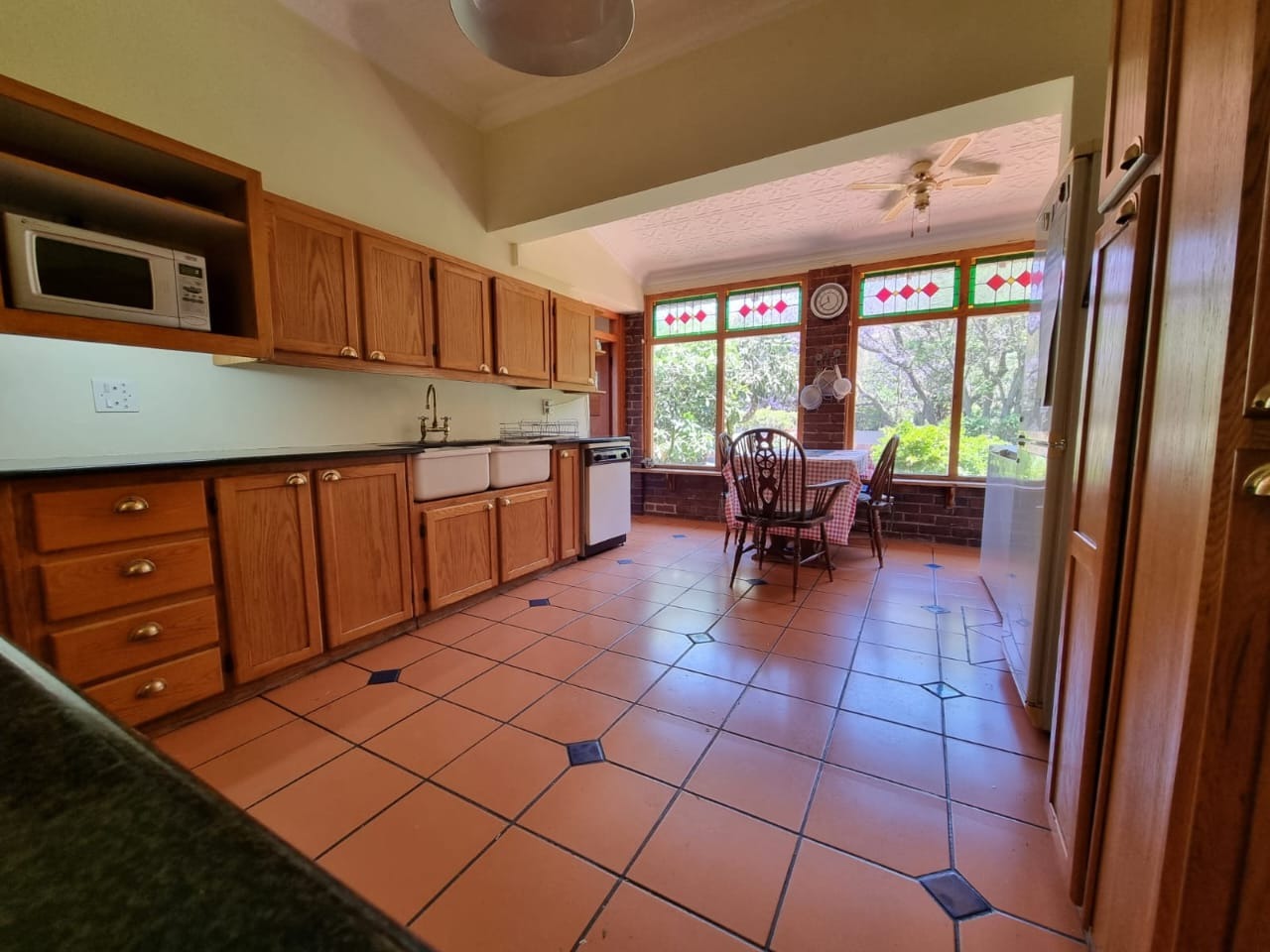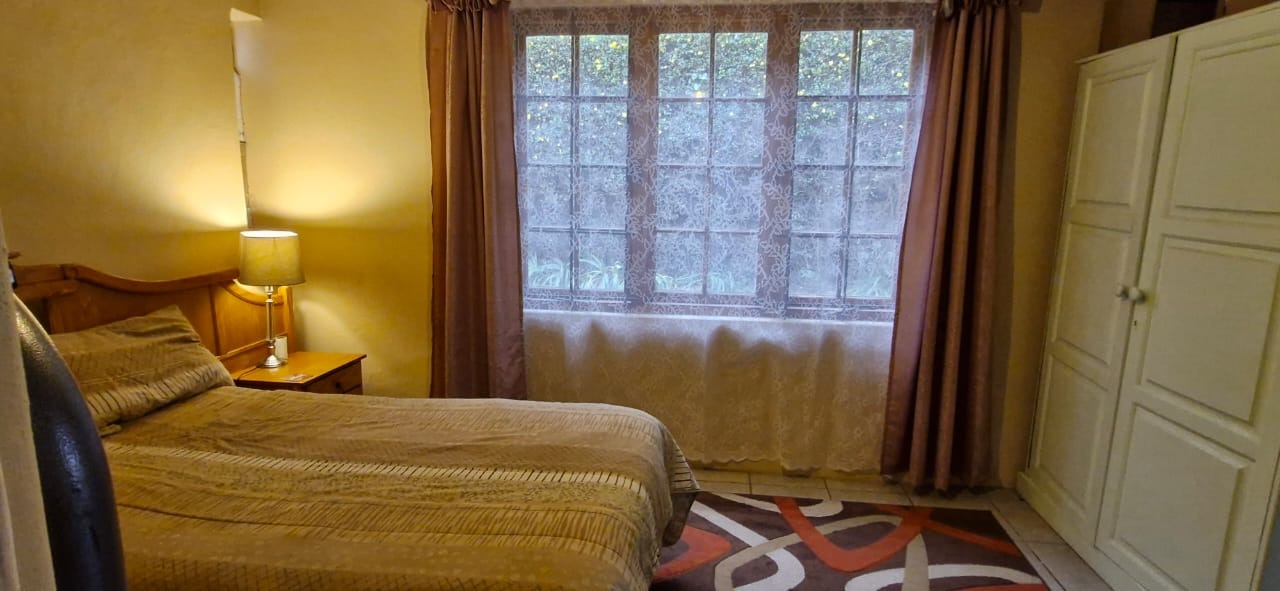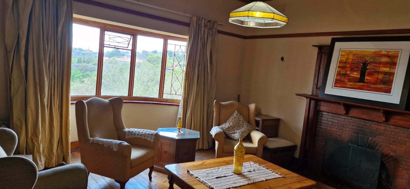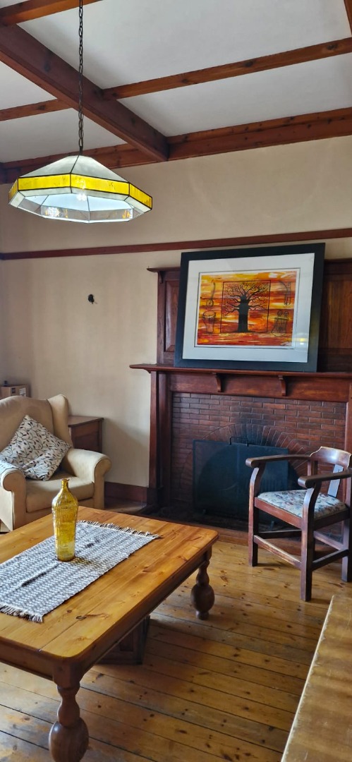 Step into the inviting lounge where rich wooden flooring and a cozy fireplace create a warm, homely atmosphere. The kitchen combines practicality and charm, featuring pressed ceilings, a ceiling fan, tiled flooring, and a separate scullery/laundry area for ease of use.