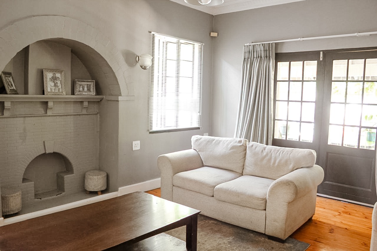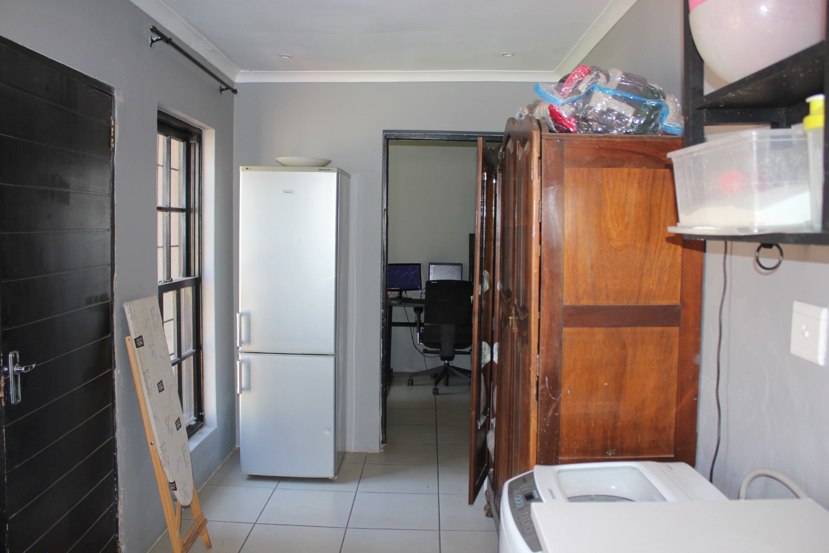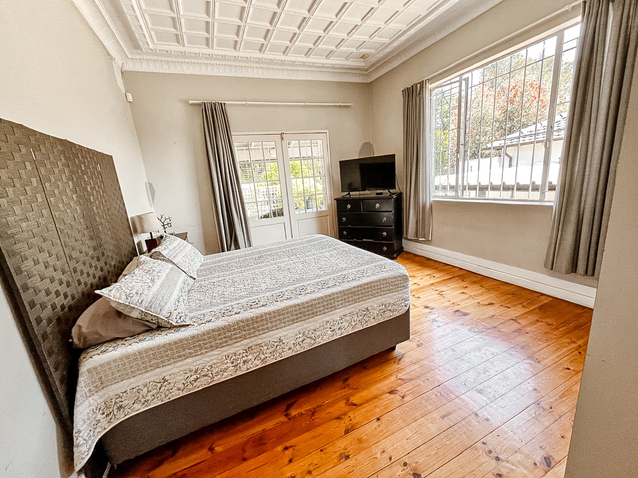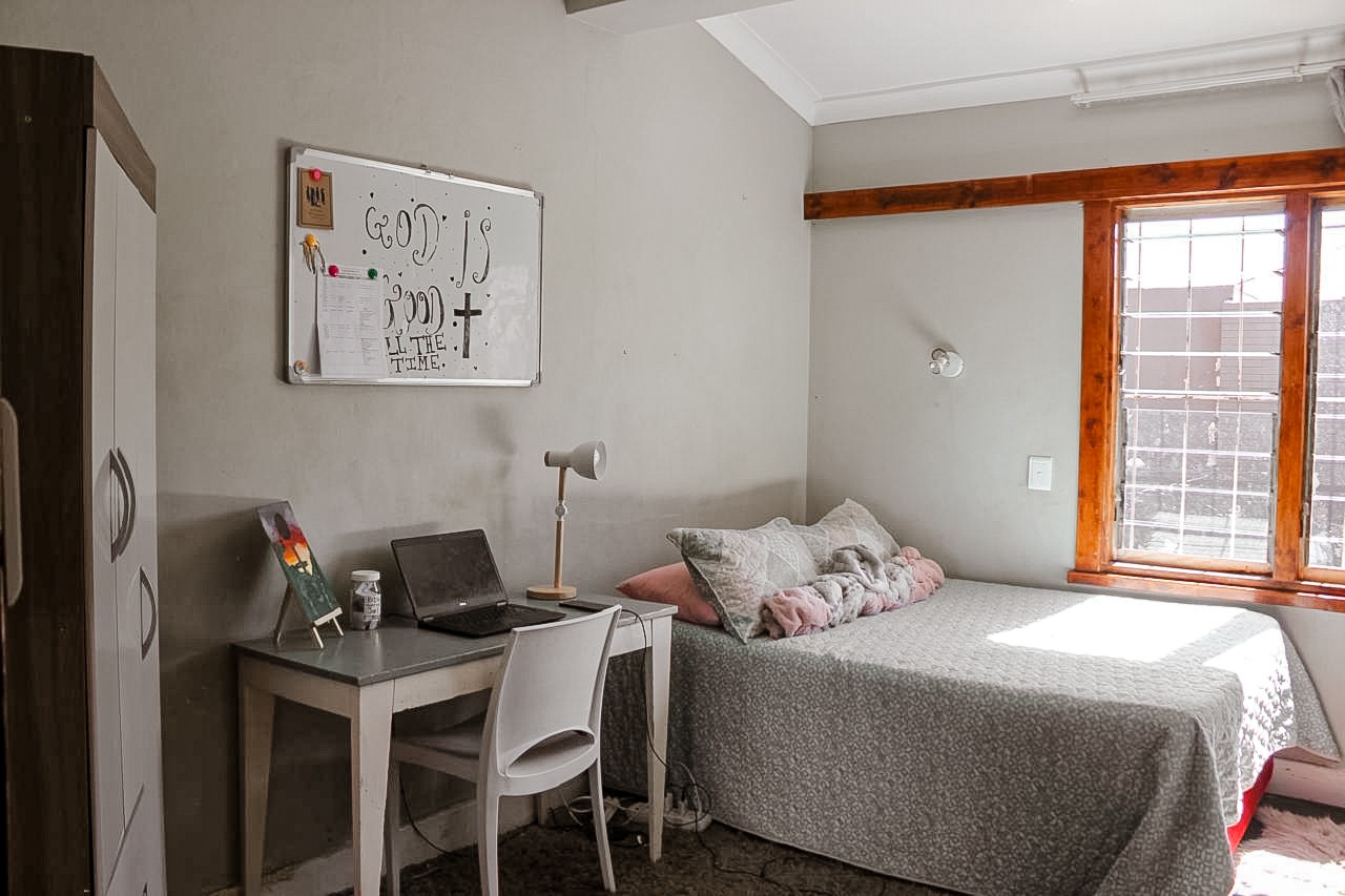 Outdoors, this property transforms into an entertainer’s dream. A boma-style garden with built-in benches and a bonfire area sits beneath leafy trees, setting the stage for summer braais, easy weekend get-togethers, or cozy nights under the stars. The backyard gives children room to play and adults plenty of space to unwind.