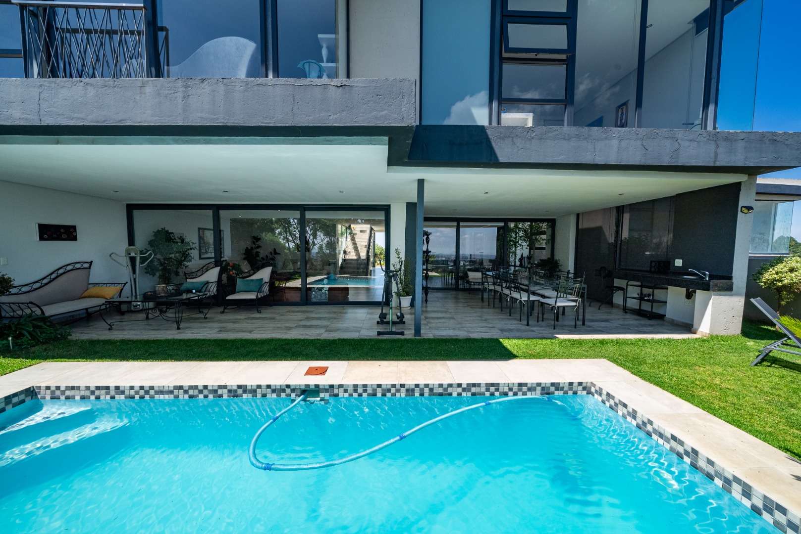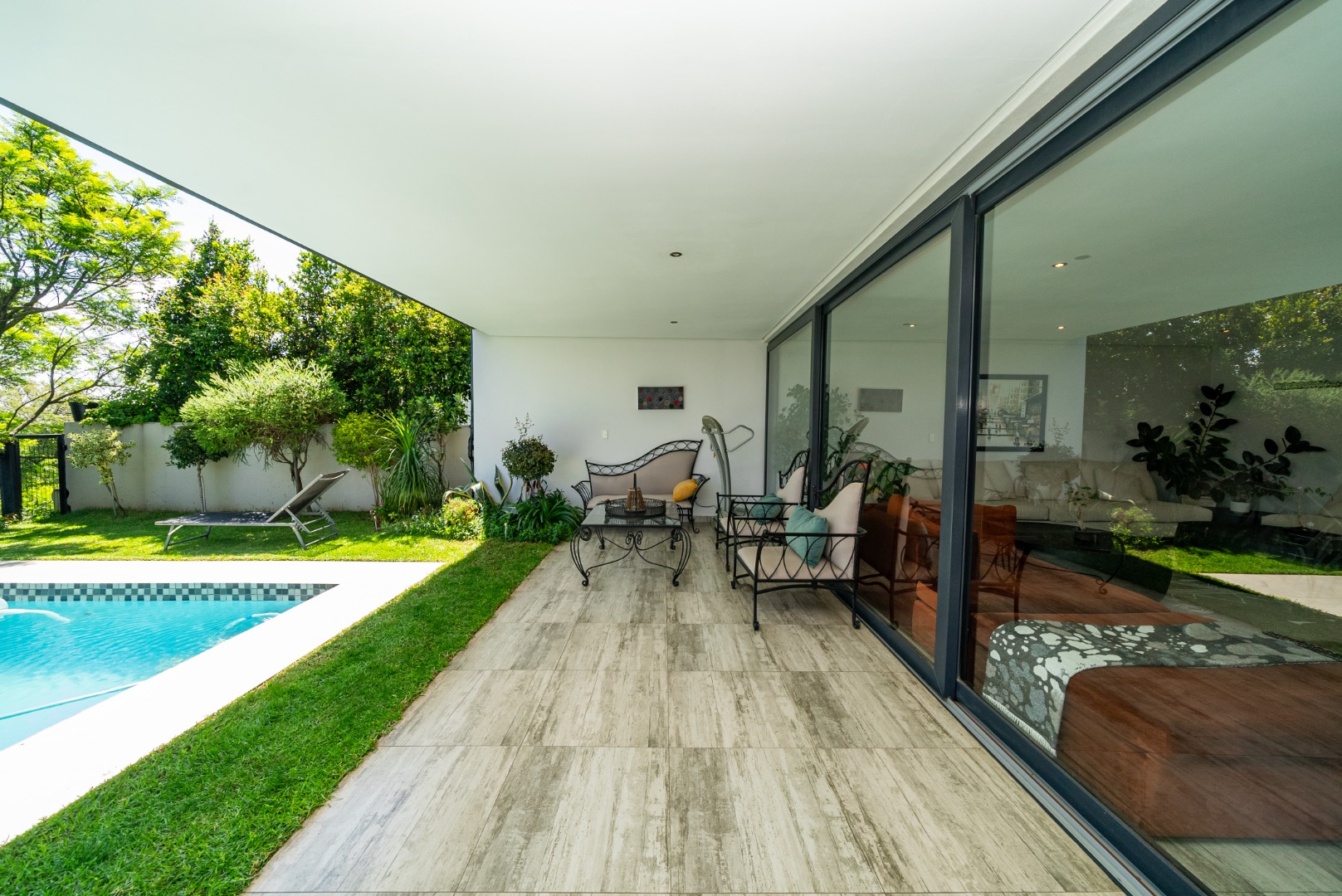 Stacking doors open to a covered patio overlooking the garden and solar-heated pool, all elevated by uninterrupted views.
