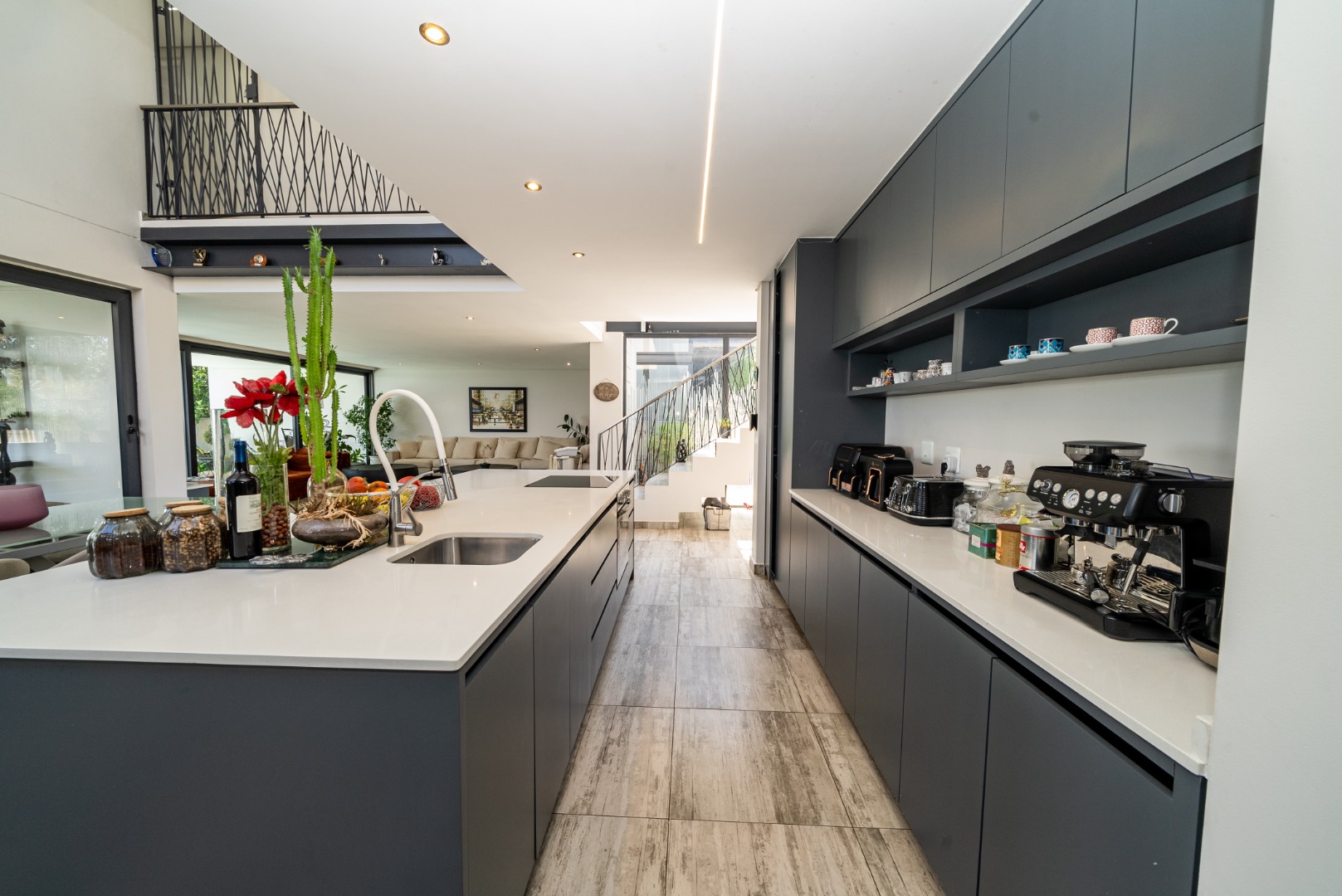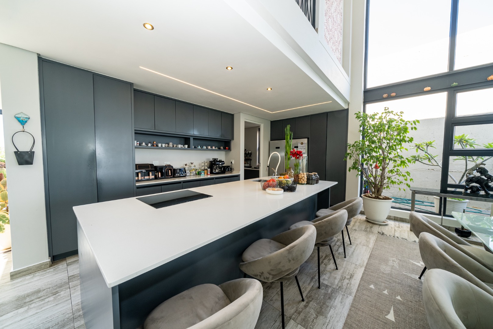 You enter into expansive tiled open-plan reception areas where large windows frame the skyline. The lounge, dining area and kitchen flow together naturally around a gas fireplace a warm central space ideal for both family living and entertaining.