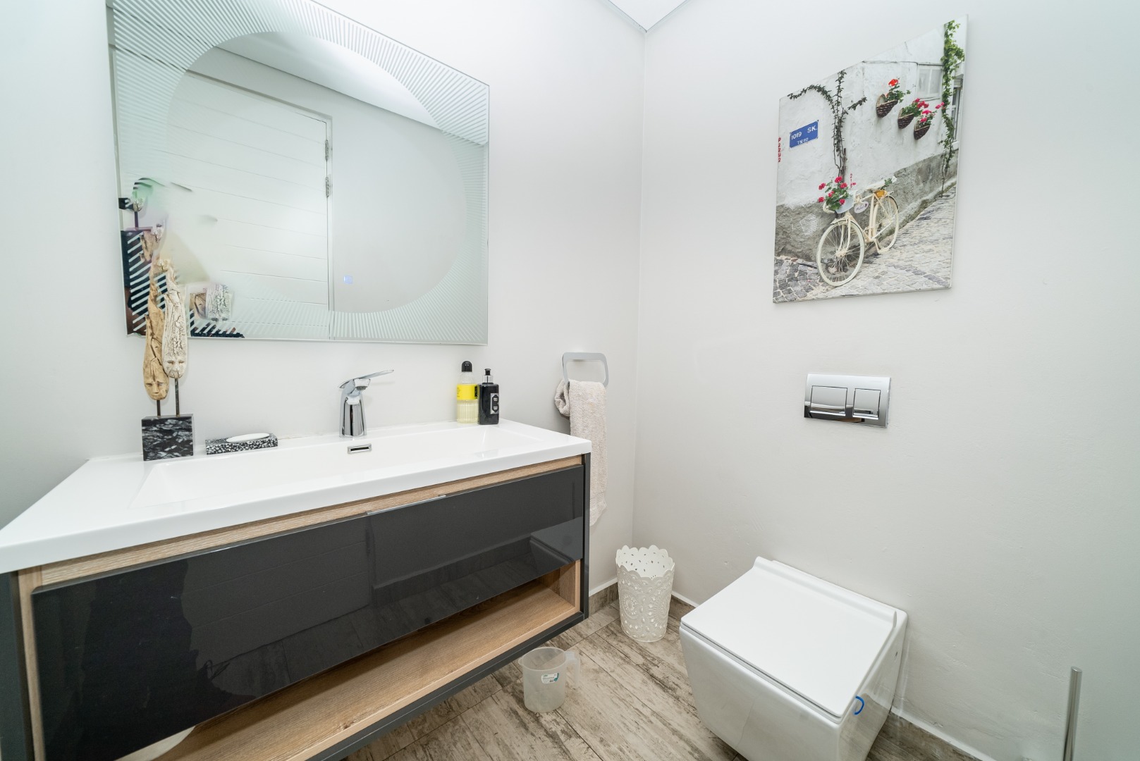 A guest bathroom is conveniently positioned on this level.