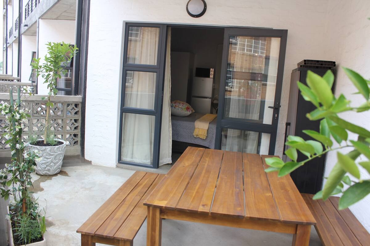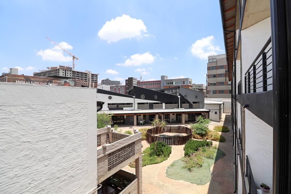 Discover urban living in this modern studio apartment located within a vibrant complex in Maboneng, Johannesburg. This unique property offers an industrial-chic aesthetic, characterized by exposed brick walls and high concrete ceilings that create a spacious and contemporary atmosphere. The compact yet highly functional layout includes an integrated kitchenette, thoughtfully equipped with essential appliances such as a fridge, microwave, and toaster oven, ensuring convenience for daily living. The apartment features a well-appointed bathroom with a modern vessel sink set on a concrete-style vanity, complemented by black tiled shower interiors and clear glass doors. Ample towel storage and a rustic-industrial design add character to this essential space. The living area seamlessly extends to a private outdoor patio, providing a perfect spot for relaxation or al fresco dining with its wooden picnic table and direct access. Residents benefit from the complex's communal amenities, including a refreshing swimming pool and a landscaped garden courtyard, ideal for leisure and socialising. A dedicated parking bay adds to the practicality of this metropolitan residence. The building's modern multi-story design and industrial-style black railings contribute to its distinctive kerb appeal. Situated in the dynamic Maboneng precinct, this property places you in the heart of Johannesburg's cultural and creative hub, offering a lively urban experience. The complex ensures peace of mind with 24-hour security and CCTV surveillance, providing a secure environment for all residents. Key Features: * Studio Apartment (0.5 Bedrooms) * 1 Bathroom * Integrated Kitchenette * Private Outdoor Patio * Communal Swimming Pool * Landscaped Garden * 1 Parking Bay * 24-Hour Security & CCTV * Industrial-Chic Design