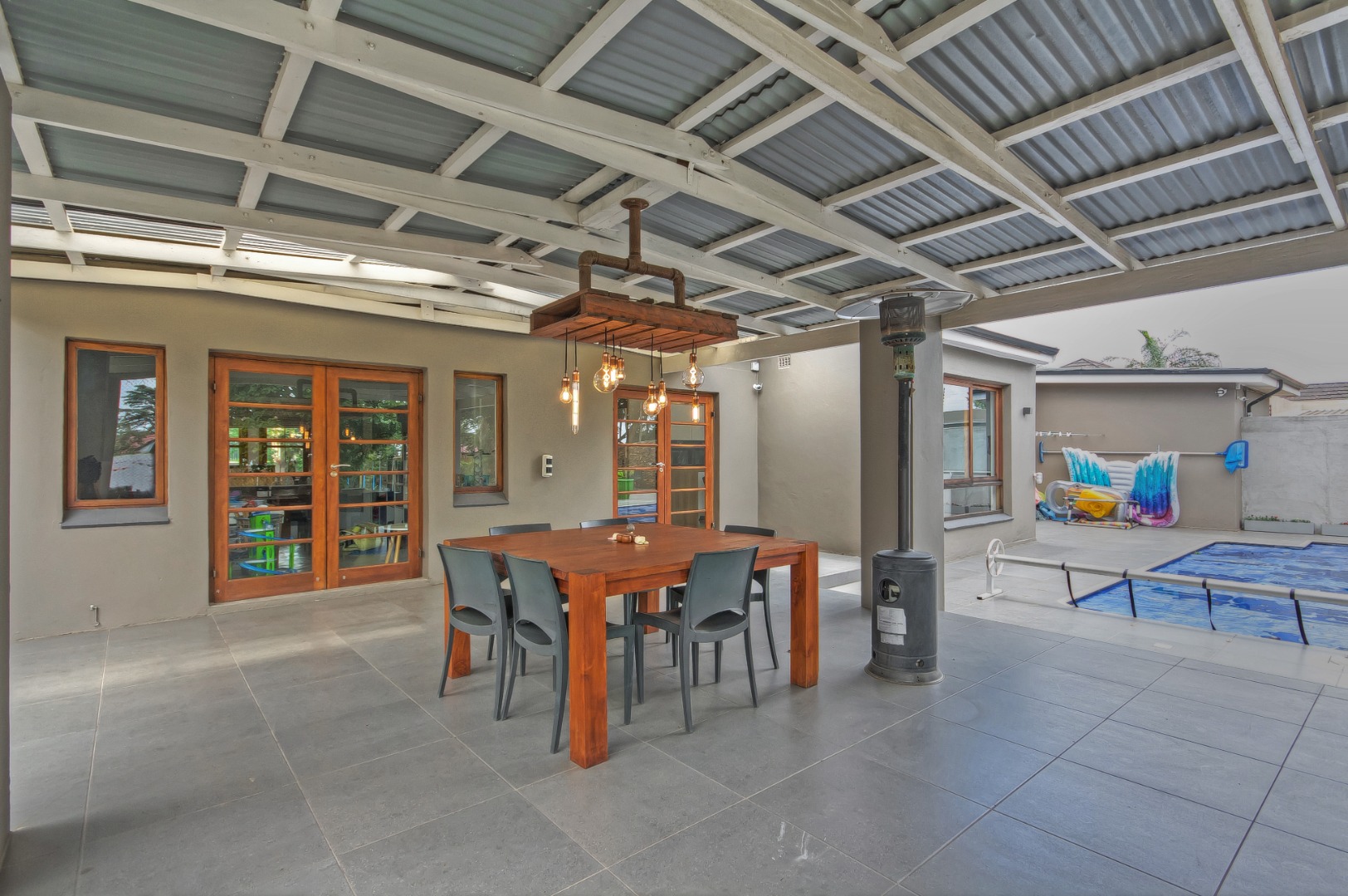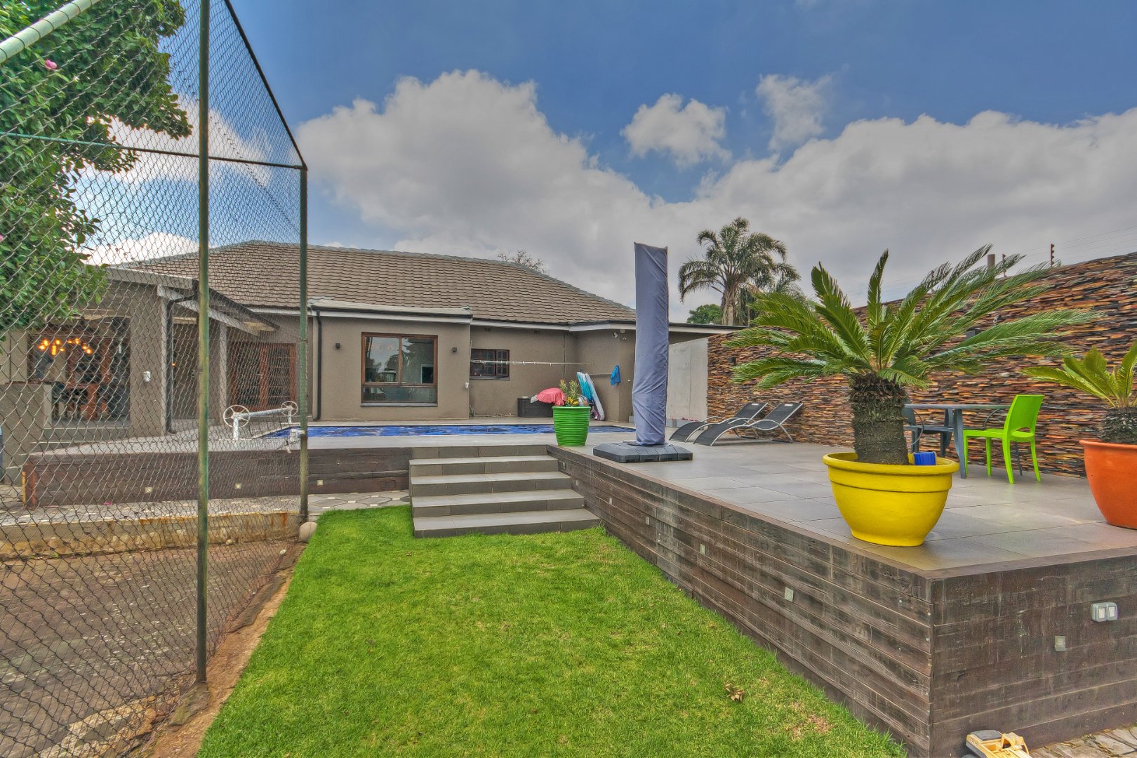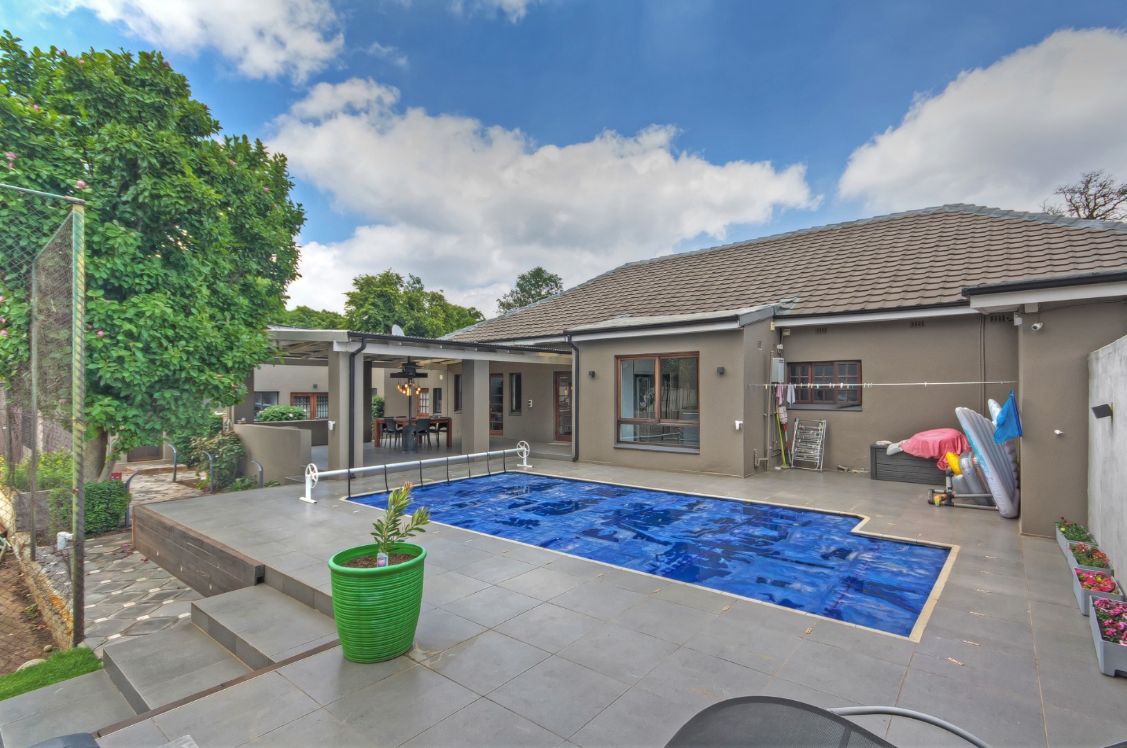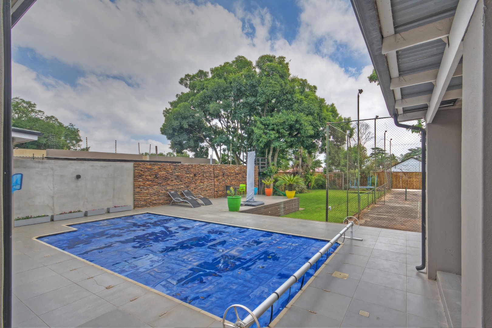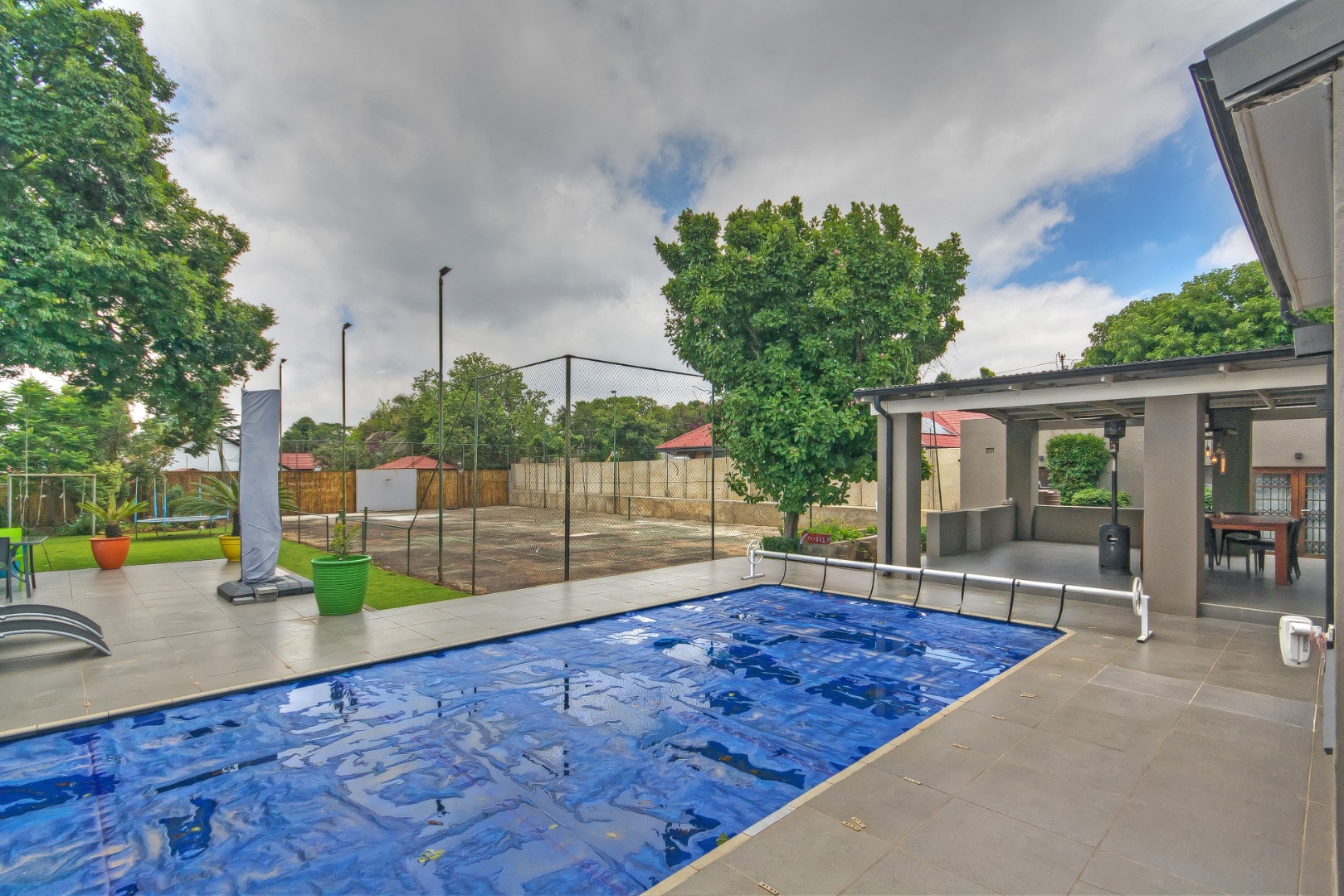 Four generously proportioned bedrooms offer serene retreats, complemented by two exquisitely appointed bathrooms, including a luxurious en-suite, ensuring comfort and privacy. The sprawling 2165 sqm erf provides an exceptional outdoor oasis, complete with a sparkling solar heated swimming pool, a private tennis court, and a tranquil garden, all accessible from a charming patio. Ample parking is provided by three fully automated garages and four additional parking bays, while a separate 2 bedroom flatlet and domestic rooms offer versatile accommodation options. Enjoy seamless living.