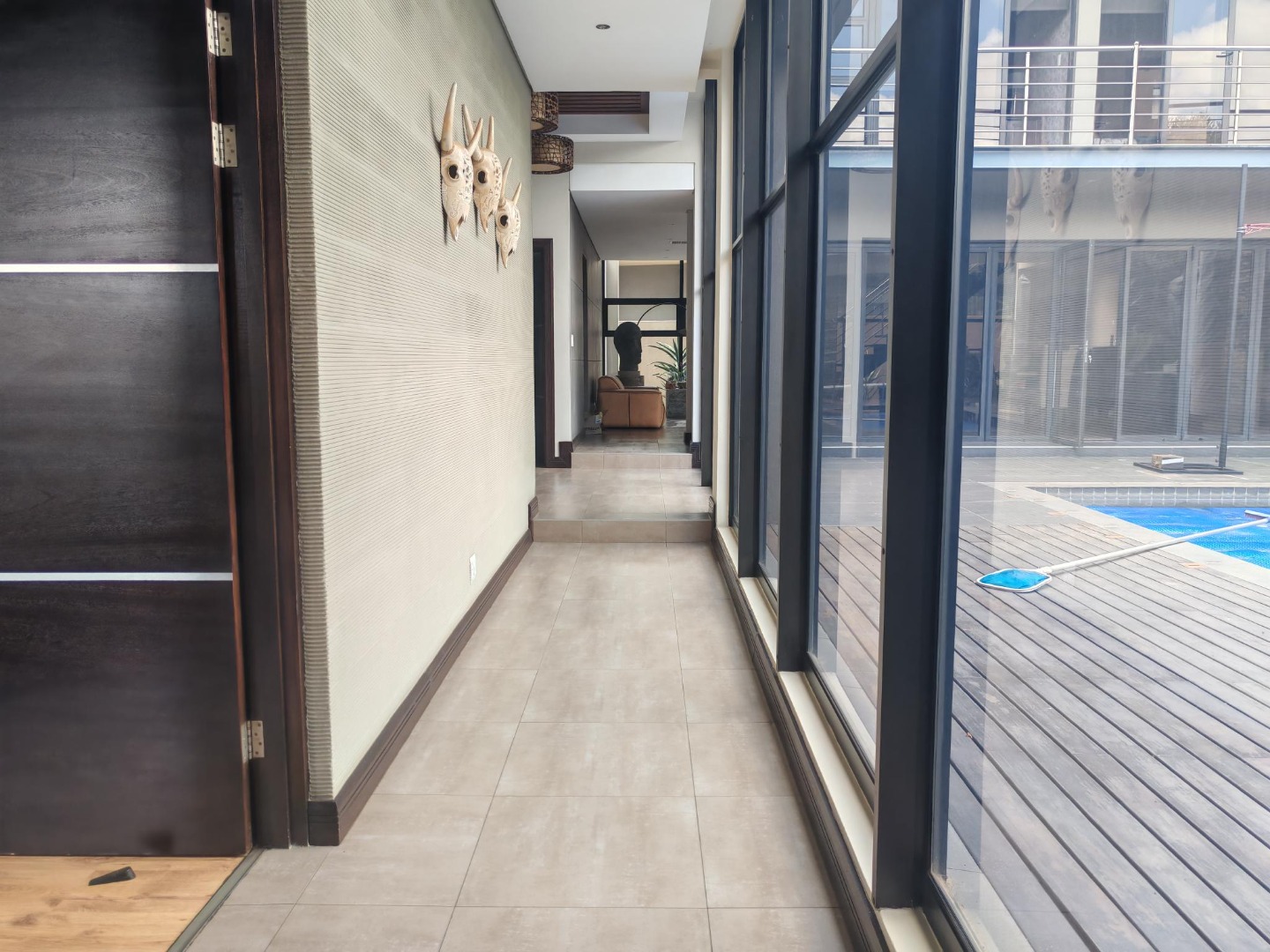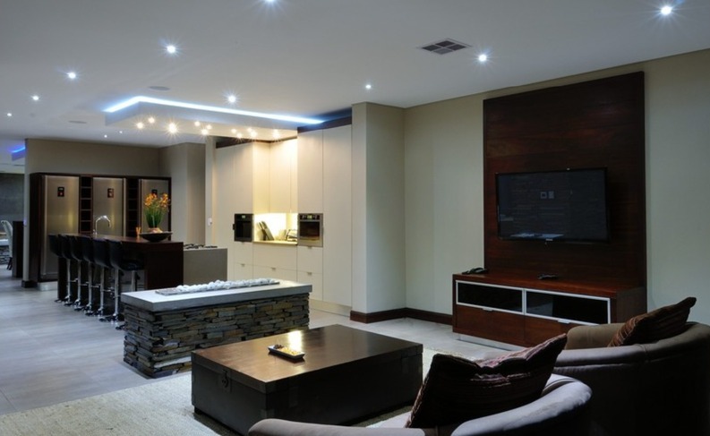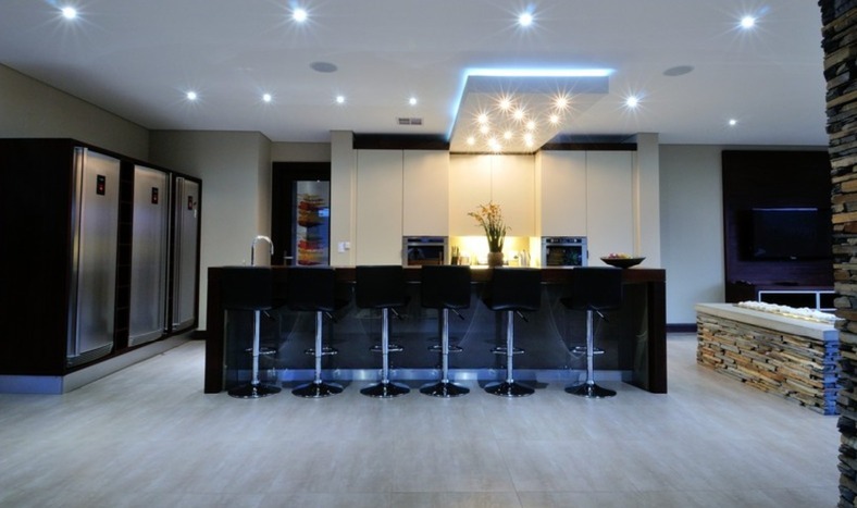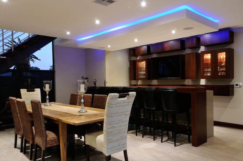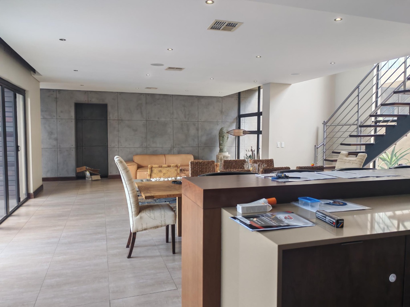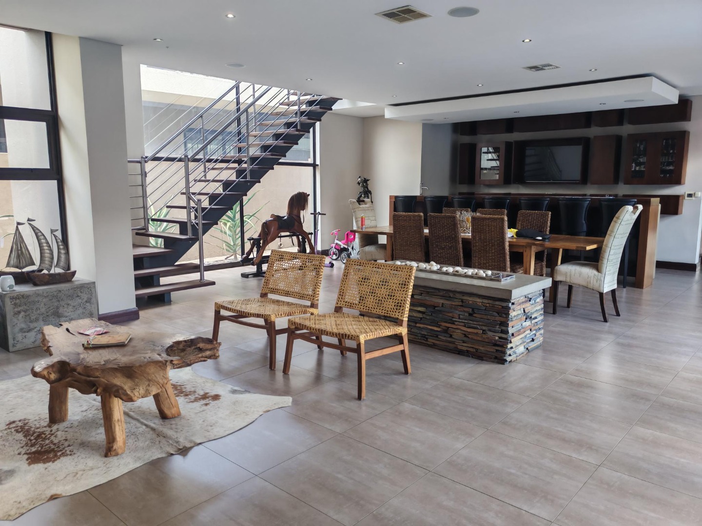Step inside to a world of refined comfort and style. The interior boasts a thoughtfully designed layout, including two spacious lounges, a dedicated dining room, and a comfortable family TV room, providing ample space for both intimate gatherings and grand entertaining. An inviting entrance hall sets the tone, leading to a well-appointed pantry and a sophisticated built-in bar, ideal for hosting. The property also features a dedicated braai room, enhancing the South African lifestyle experience. The modern aesthetic is further exemplified by the sleek interior staircase, featuring dark wooden steps, stainless steel railings, and a stylish wooden slatted ceiling adorned with contemporary pendant lights and integrated spotlights.