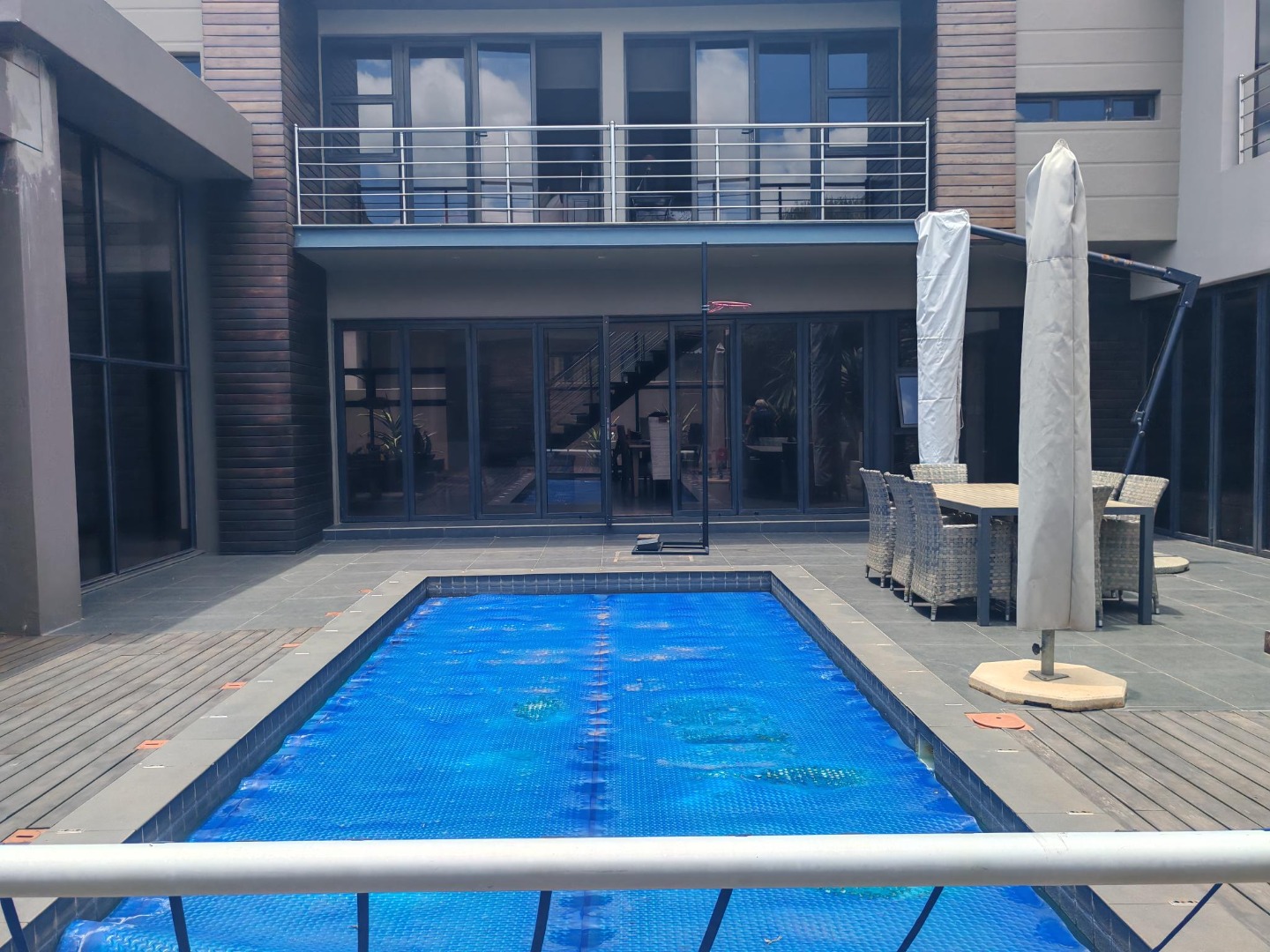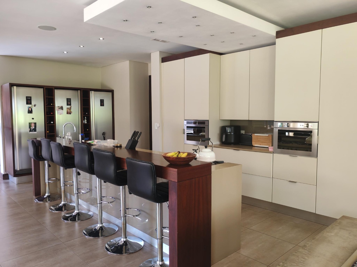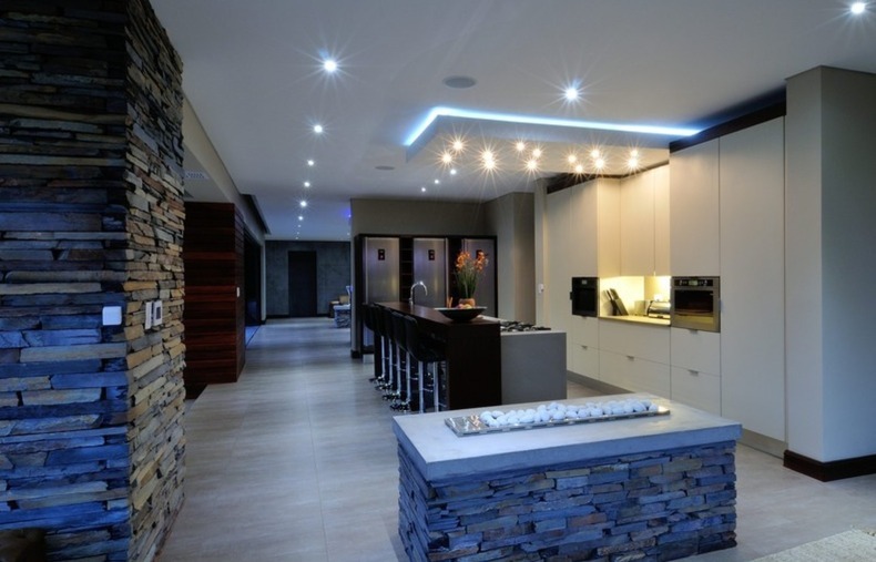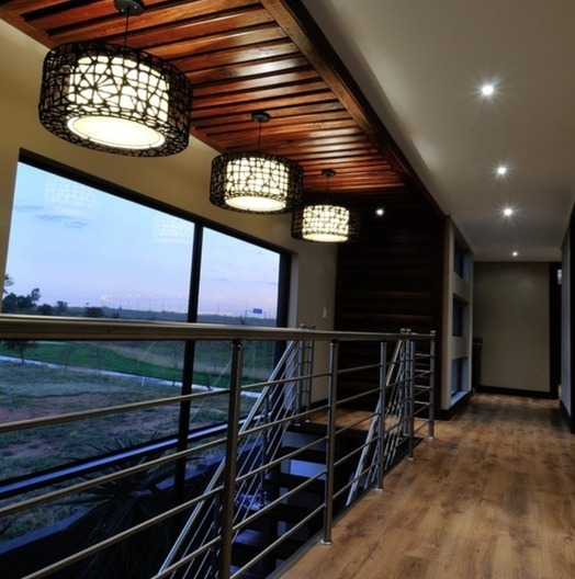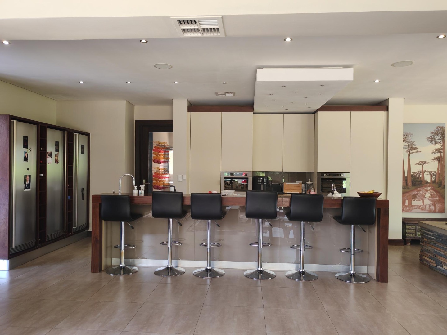 Step inside to a world of refined comfort and style. The interior boasts a thoughtfully designed layout, including two spacious lounges, a dedicated dining room, and a comfortable family TV room, providing ample space for both intimate gatherings and grand entertaining. An inviting entrance hall sets the tone, leading to a well-appointed pantry and a sophisticated built-in bar, ideal for hosting. The property also features a dedicated braai room, enhancing the South African lifestyle experience. The modern aesthetic is further exemplified by the sleek interior staircase, featuring dark wooden steps, stainless steel railings, and a stylish wooden slatted ceiling adorned with contemporary pendant lights and integrated spotlights.
