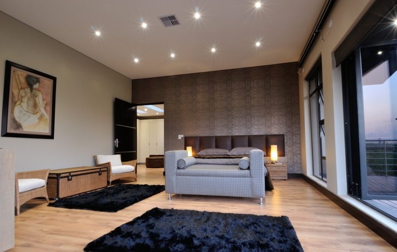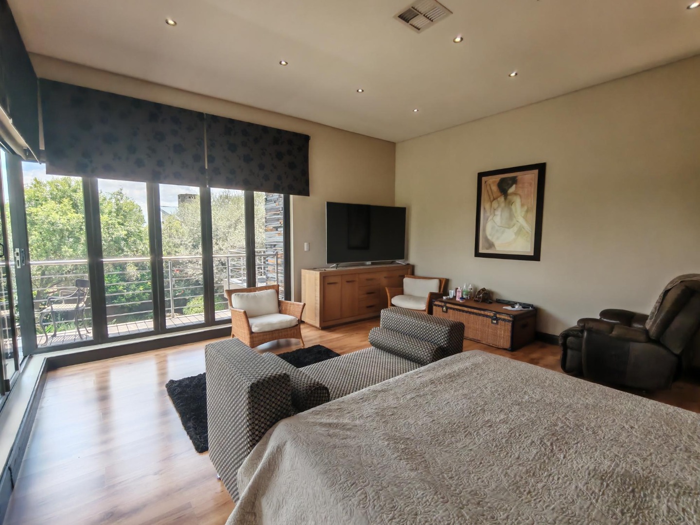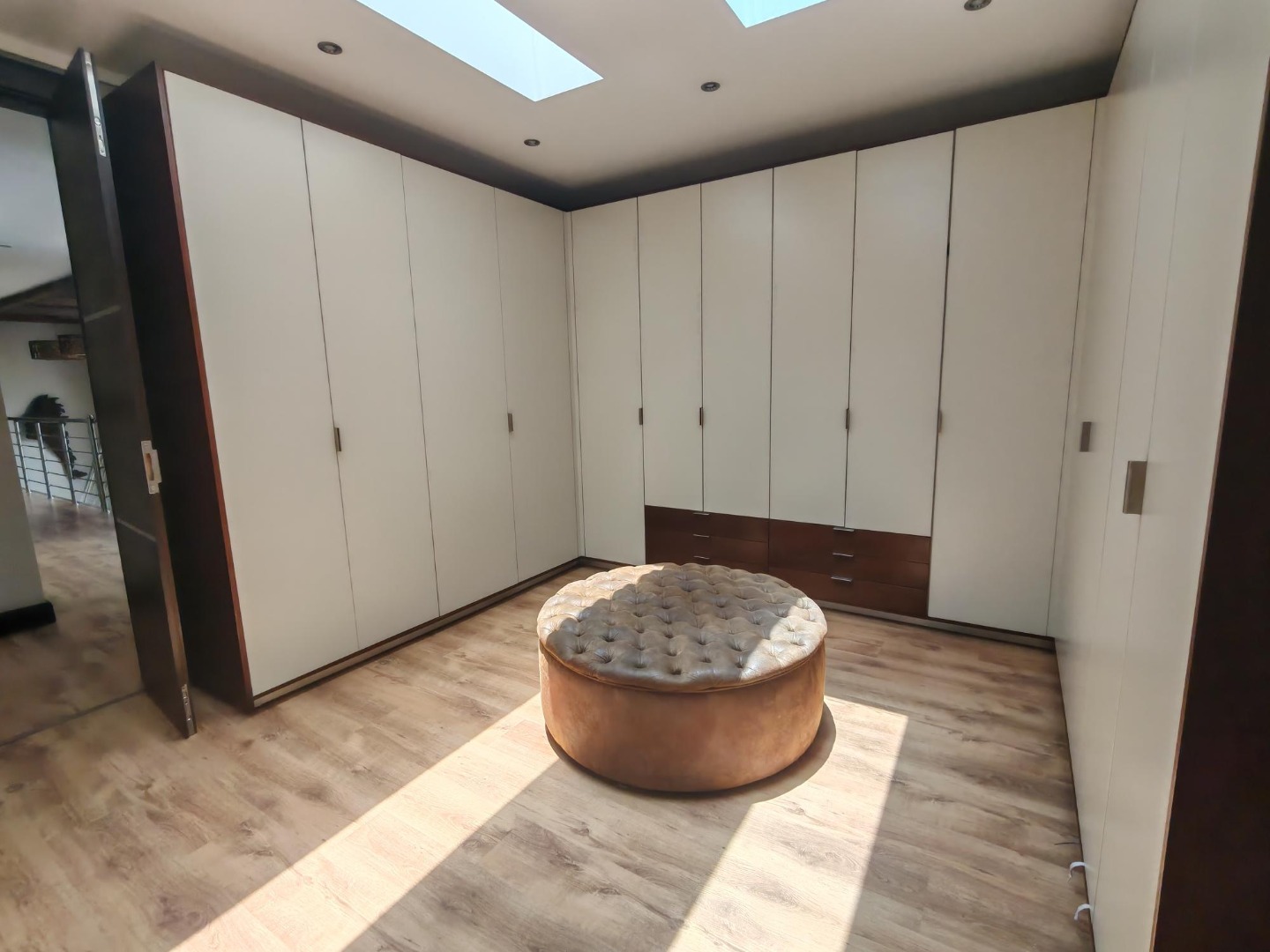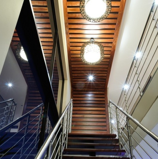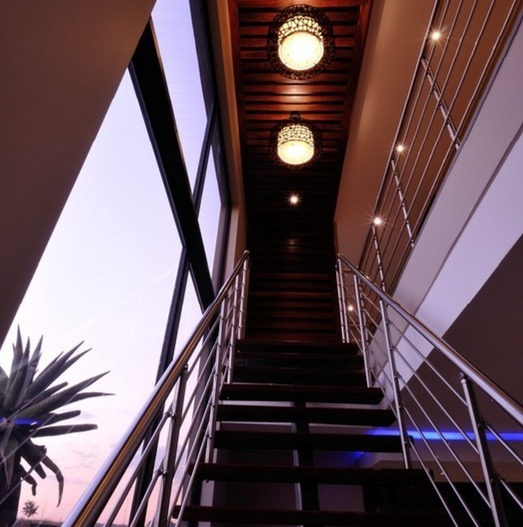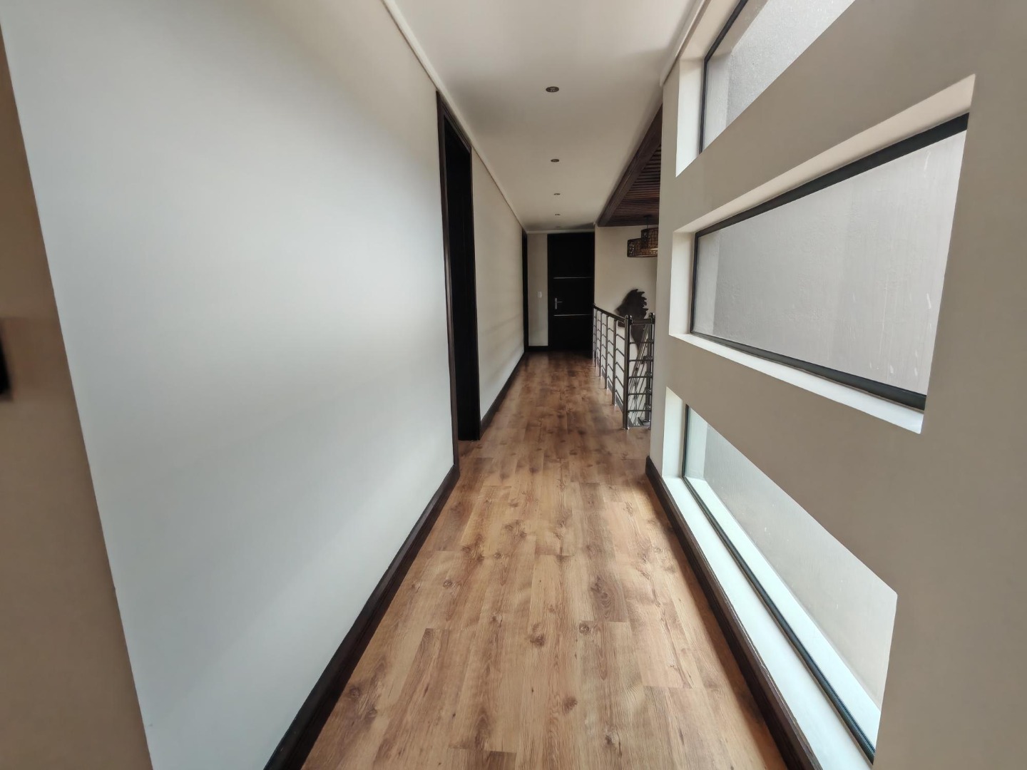 Step inside to a world of refined comfort and style. The interior boasts a thoughtfully designed layout, including two spacious lounges, a dedicated dining room, and a comfortable family TV room, providing ample space for both intimate gatherings and grand entertaining. An inviting entrance hall sets the tone, leading to a well-appointed pantry and a sophisticated built-in bar, ideal for hosting. The property also features a dedicated braai room, enhancing the South African lifestyle experience. The modern aesthetic is further exemplified by the sleek interior staircase, featuring dark wooden steps, stainless steel railings, and a stylish wooden slatted ceiling adorned with contemporary pendant lights and integrated spotlights.
