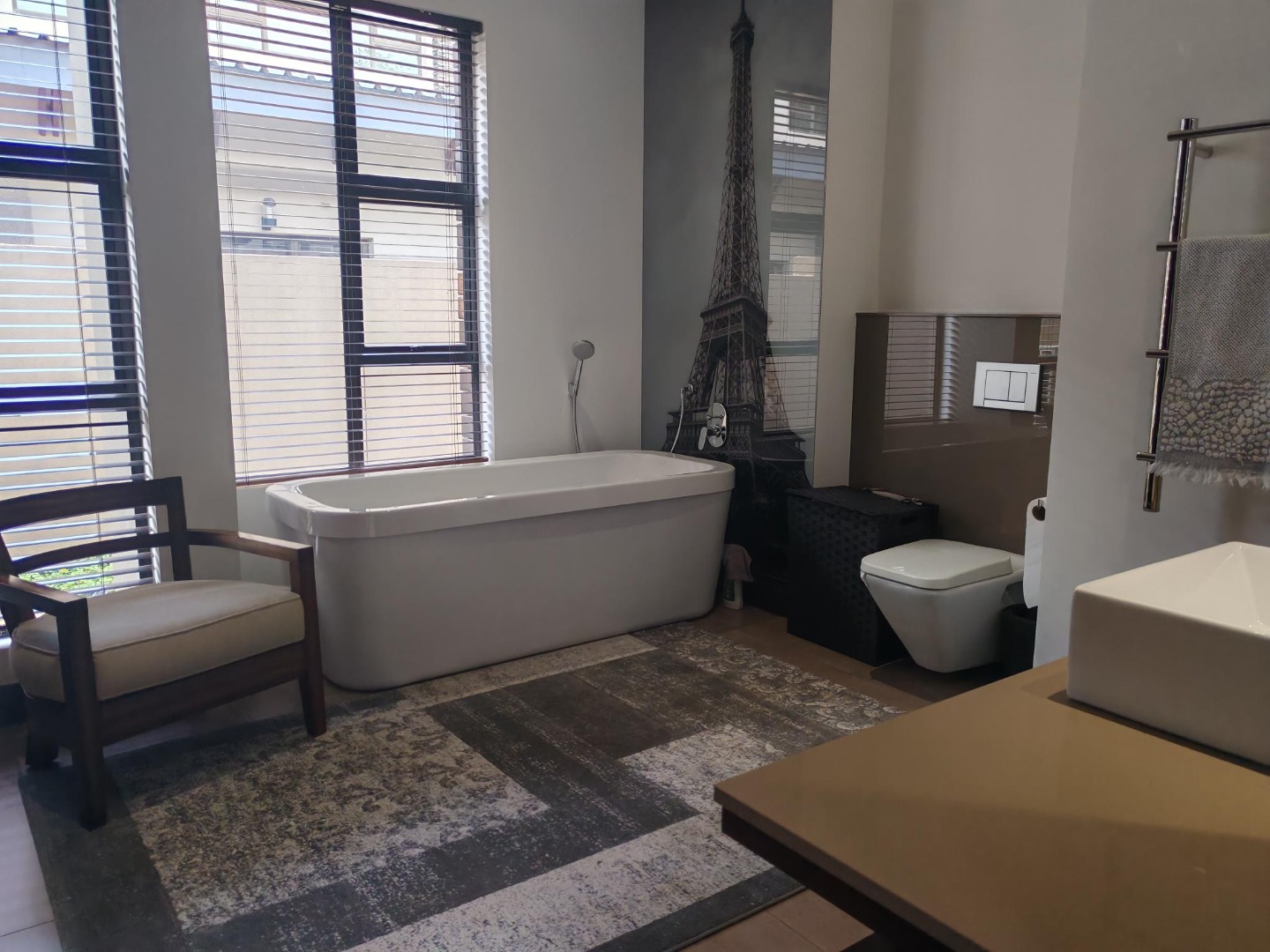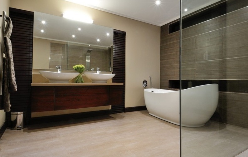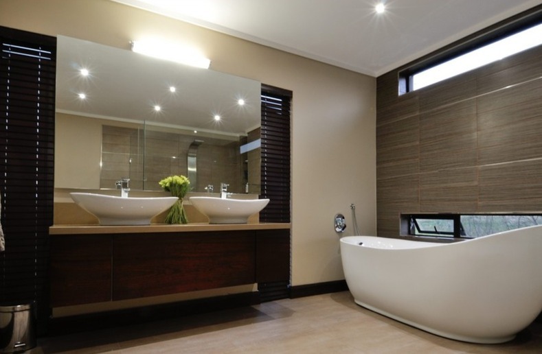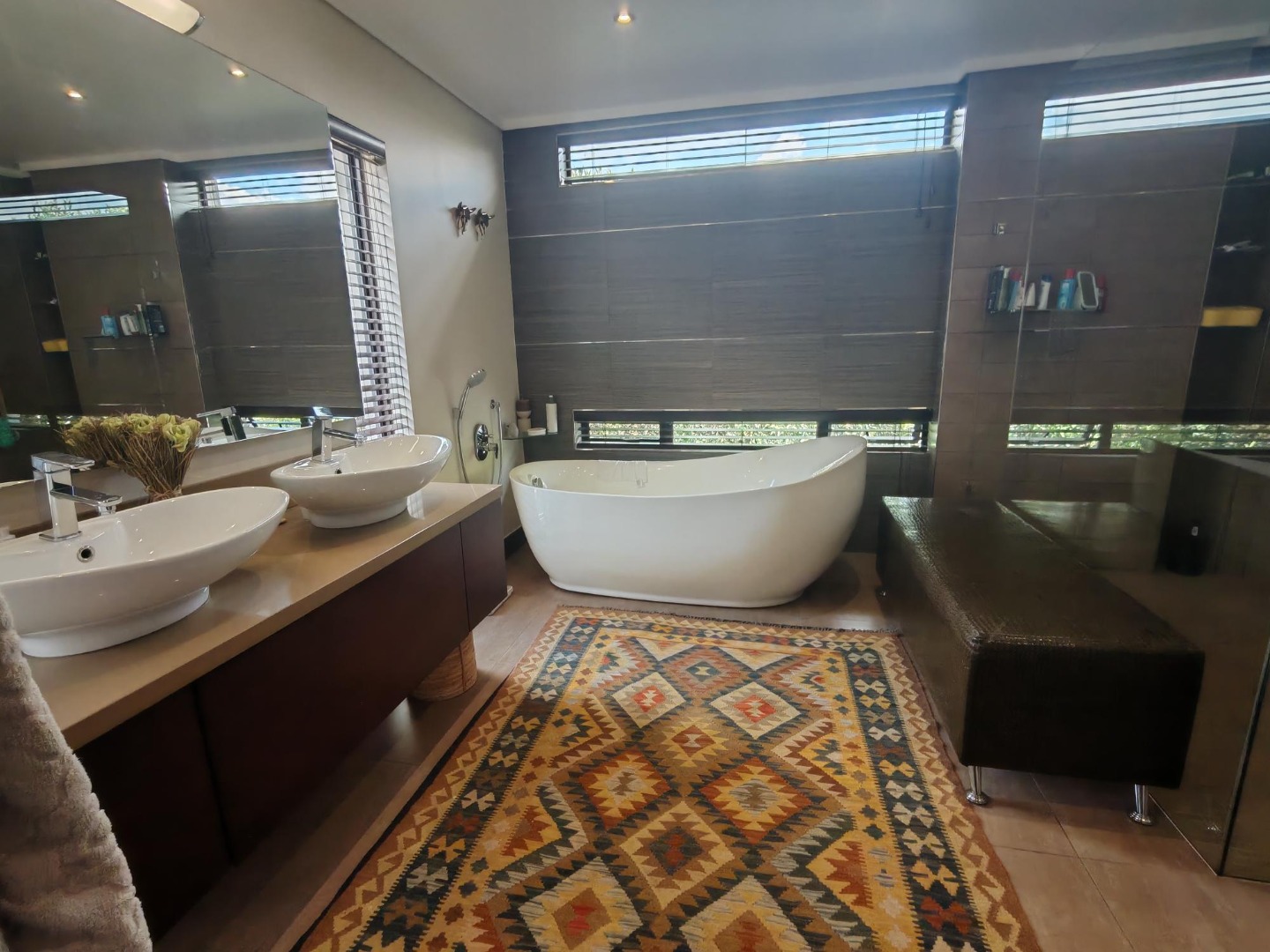 This magnificent home offers five generously sized bedrooms and six luxurious bathrooms, ensuring ultimate privacy and convenience for all residents and guests. The bathrooms are a testament to modern design, showcasing double vanities with elegant vessel sinks, sleek freestanding bathtubs, and separate shower areas with glass partitions, all set within a neutral palette complemented by dark wood accents and effective lighting. Additionally, the property includes staff quarters, adding to its comprehensive functionality.