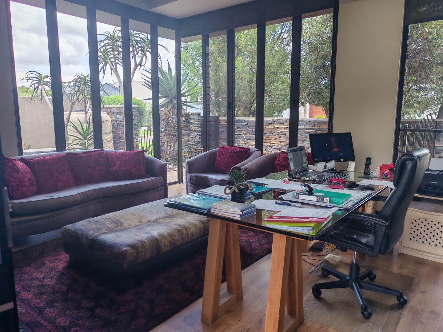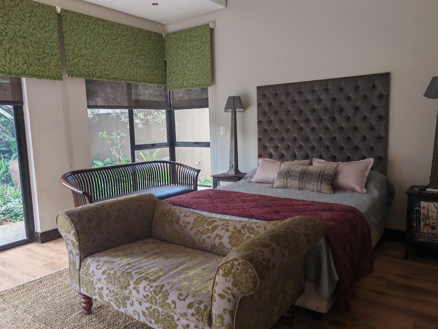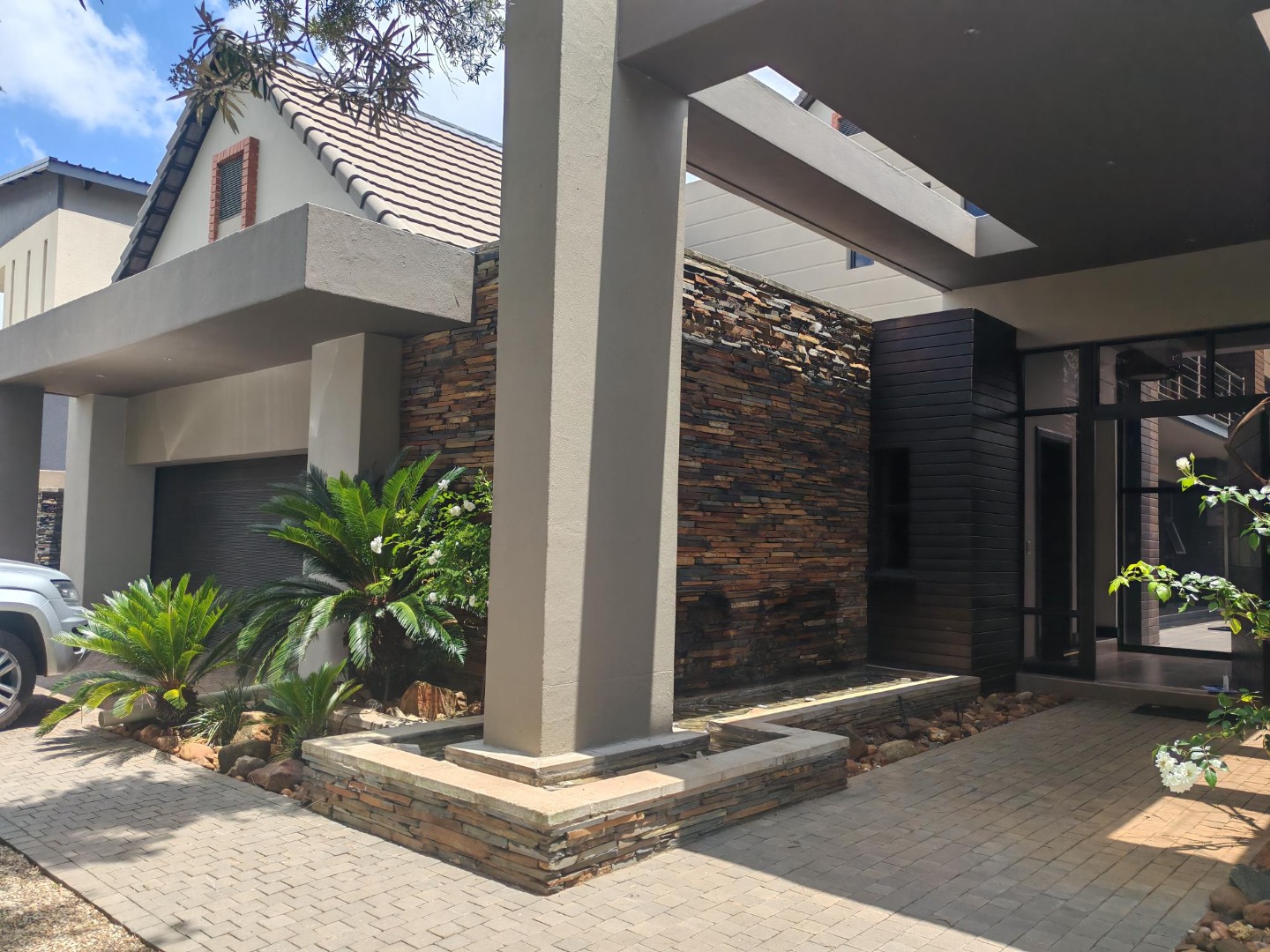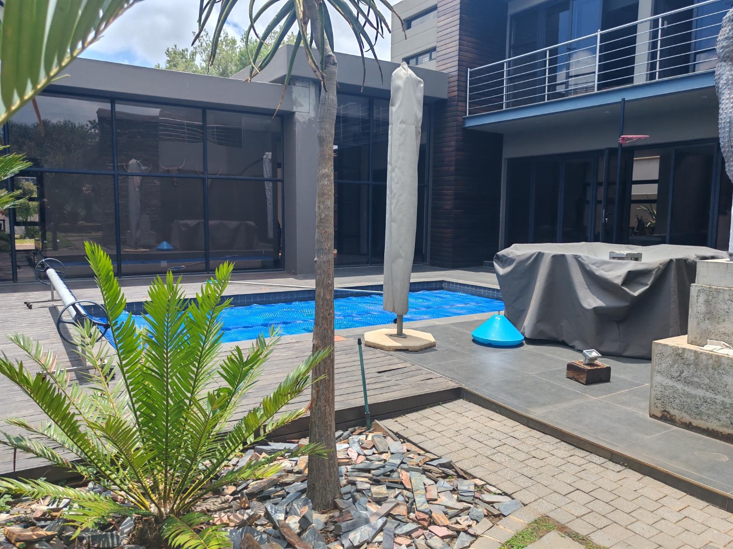 Outdoor living is equally impressive, with a private swimming pool providing a refreshing escape during warm South African days. The property is pet-friendly and features a well-maintained garden, offering a serene backdrop to daily life. Practical amenities include three garages and two additional parking spaces, ensuring ample secure parking for vehicles. The estate itself provides 24-hour security, offering peace of mind for residents.
