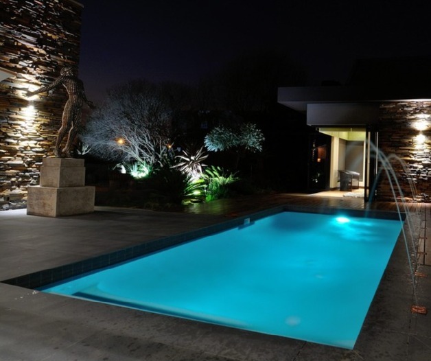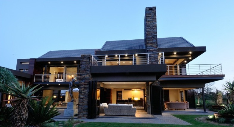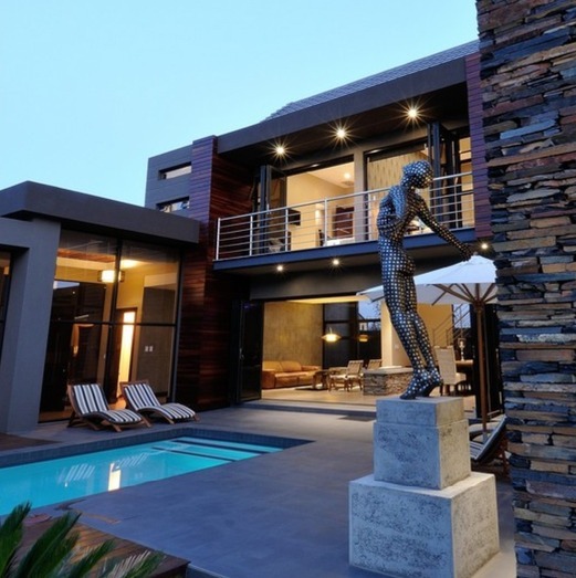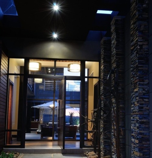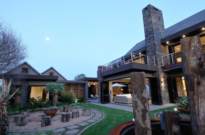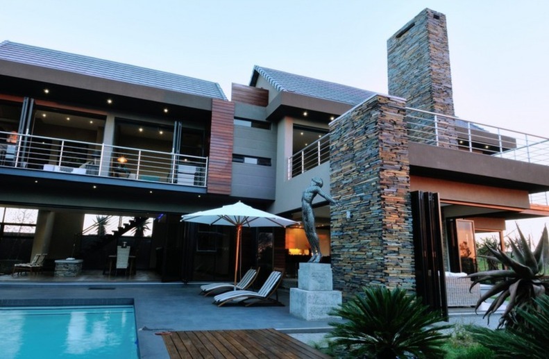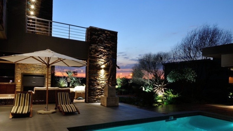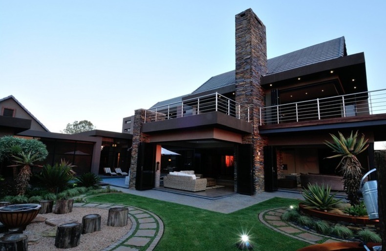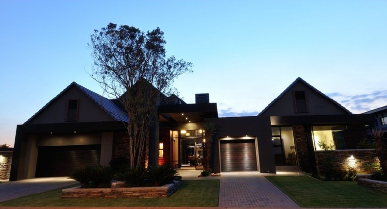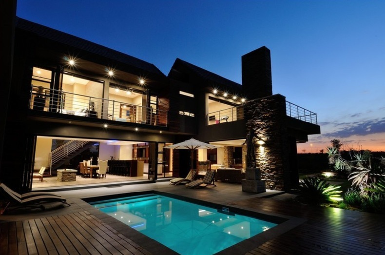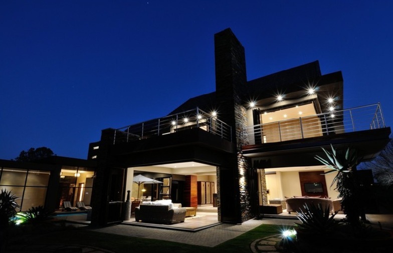 Discover unparalleled modern living in this exquisite residential sale property located within the prestigious Serengeti Lifestyle Estate in Kempton Park, South Africa. This striking two-story home immediately captivates with its contemporary architectural design, featuring elegant stone accents and extensive exterior lighting that creates a dramatic ambiance, especially at night. The seamless integration of indoor and outdoor spaces is highlighted by large bi-fold doors, opening to a meticulously lit, landscaped garden, perfect for sophisticated entertaining or tranquil relaxation.