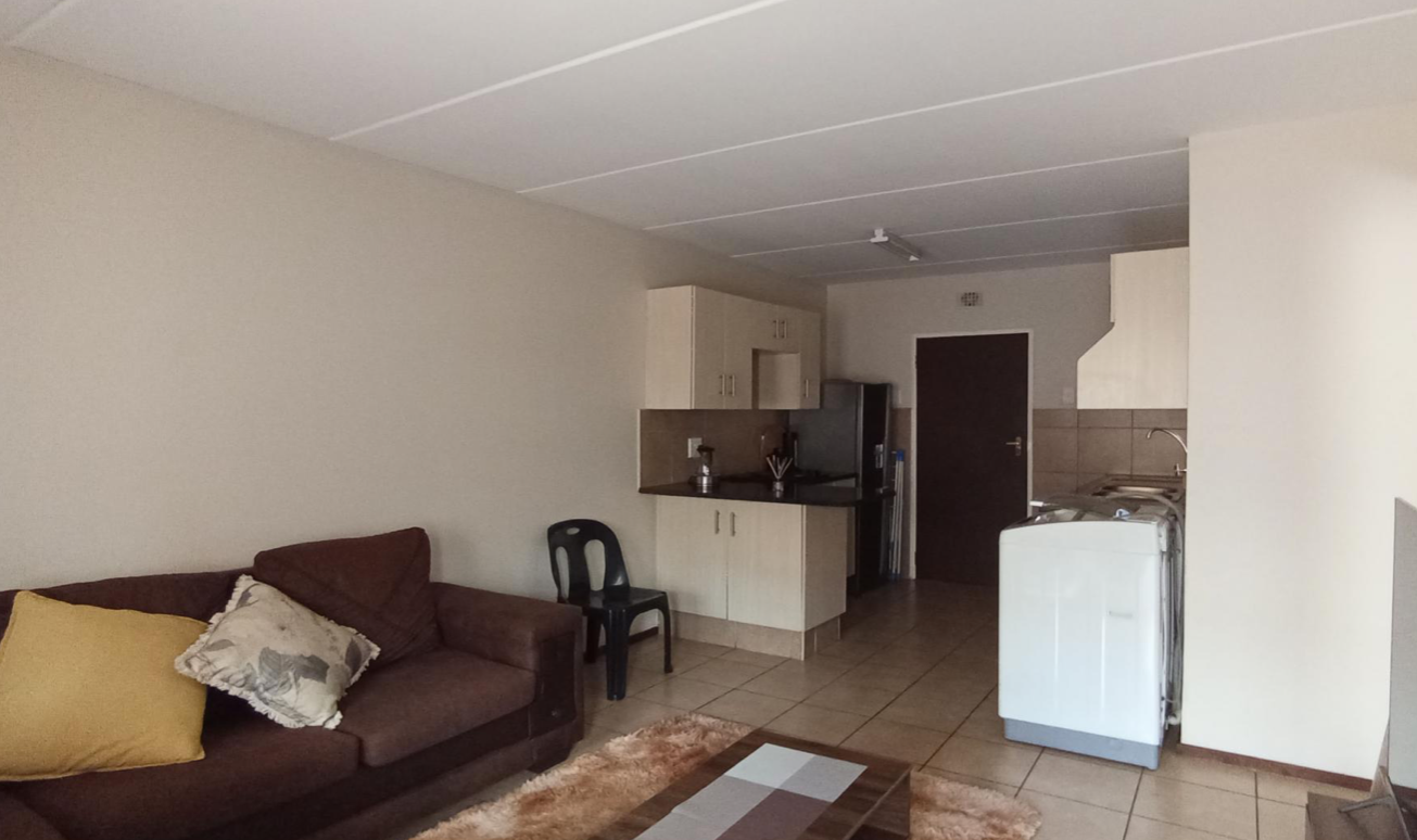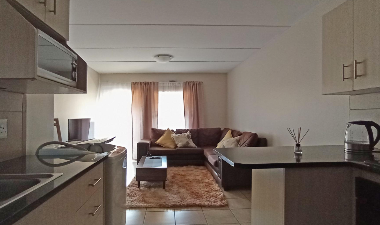 Step inside to an inviting open-plan living area, featuring neutral walls and practical tiled flooring throughout, providing a versatile canvas for personal style. The functional kitchen boasts modern light-colored cabinetry and dark countertops, efficiently designed to accommodate essential appliances. The lounge area, brightened by natural light, offers a comfortable space for relaxation and daily activities.