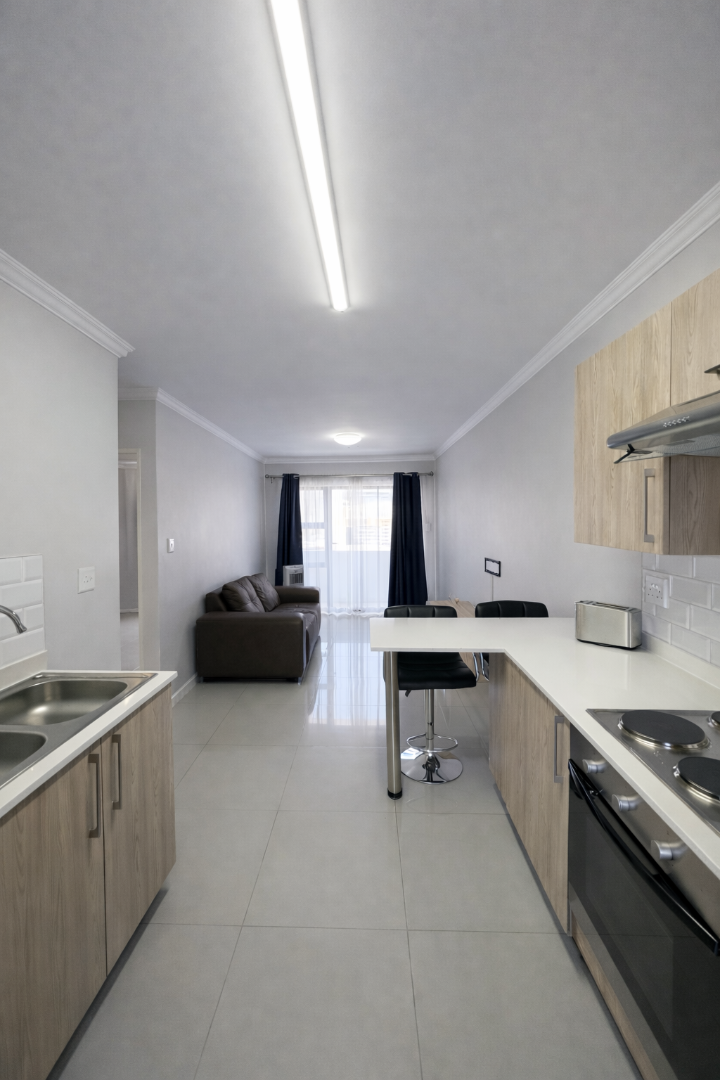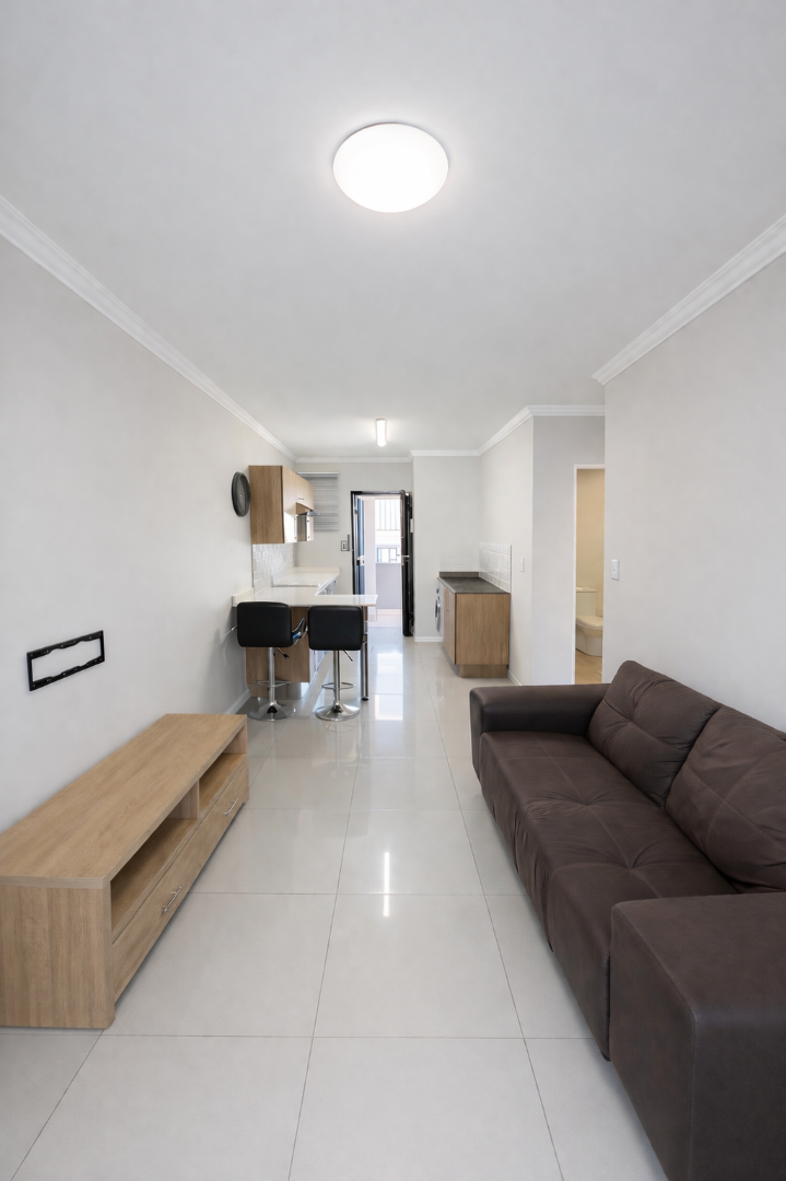 The unit consists of an open plan living area and kitchen. The kitchen includes light wood grain cabinetry, a built in stovetop, and a breakfast bar. The apartment is finished with porcelain tiled flooring.