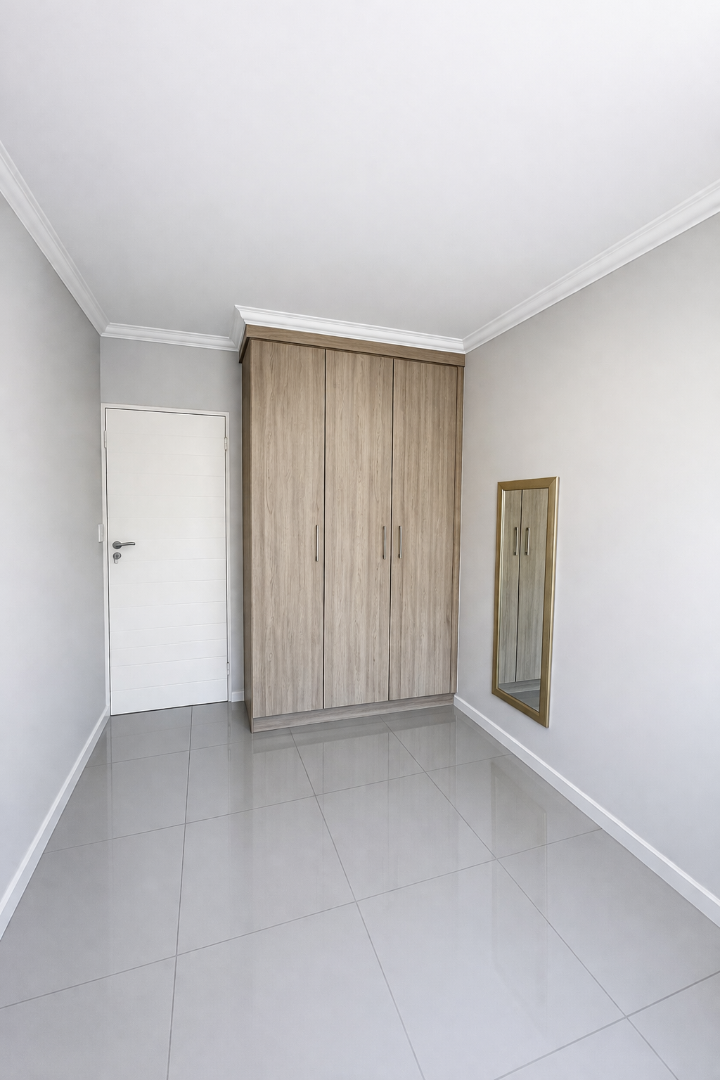 The bedroom has a floor to ceiling built in wardrobe and a wall mirror.