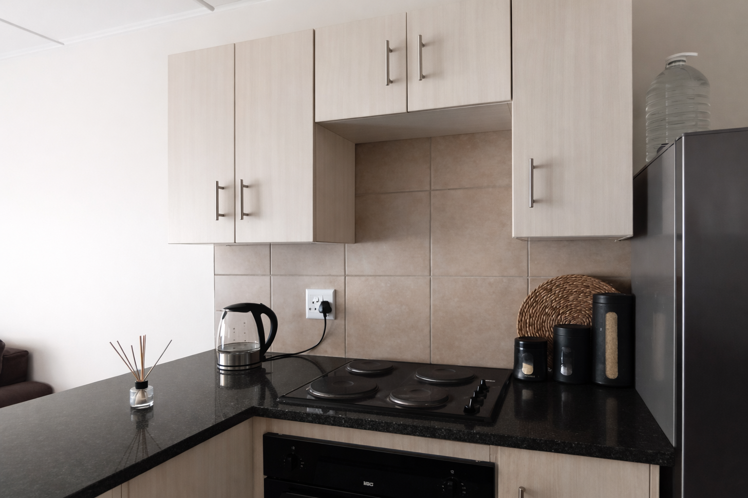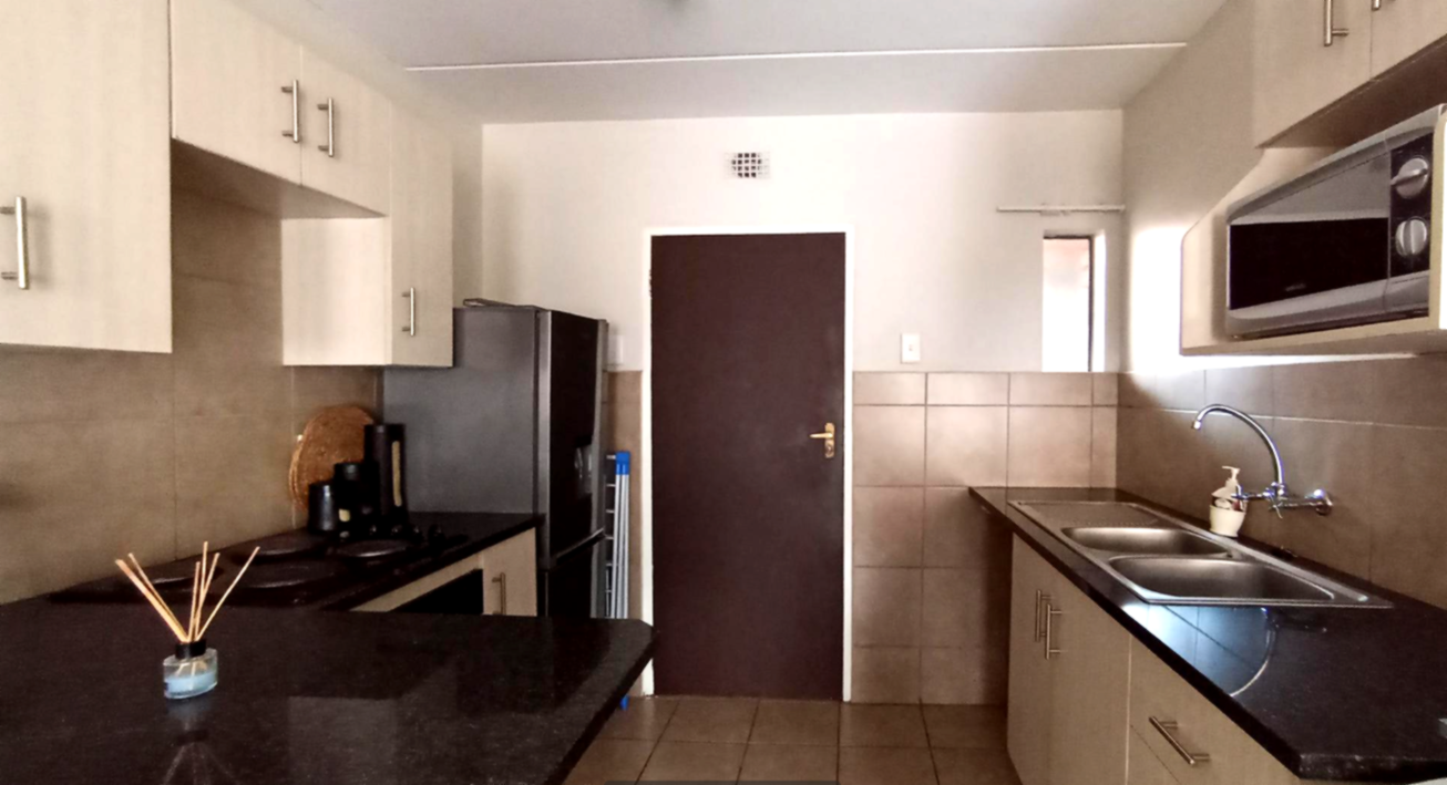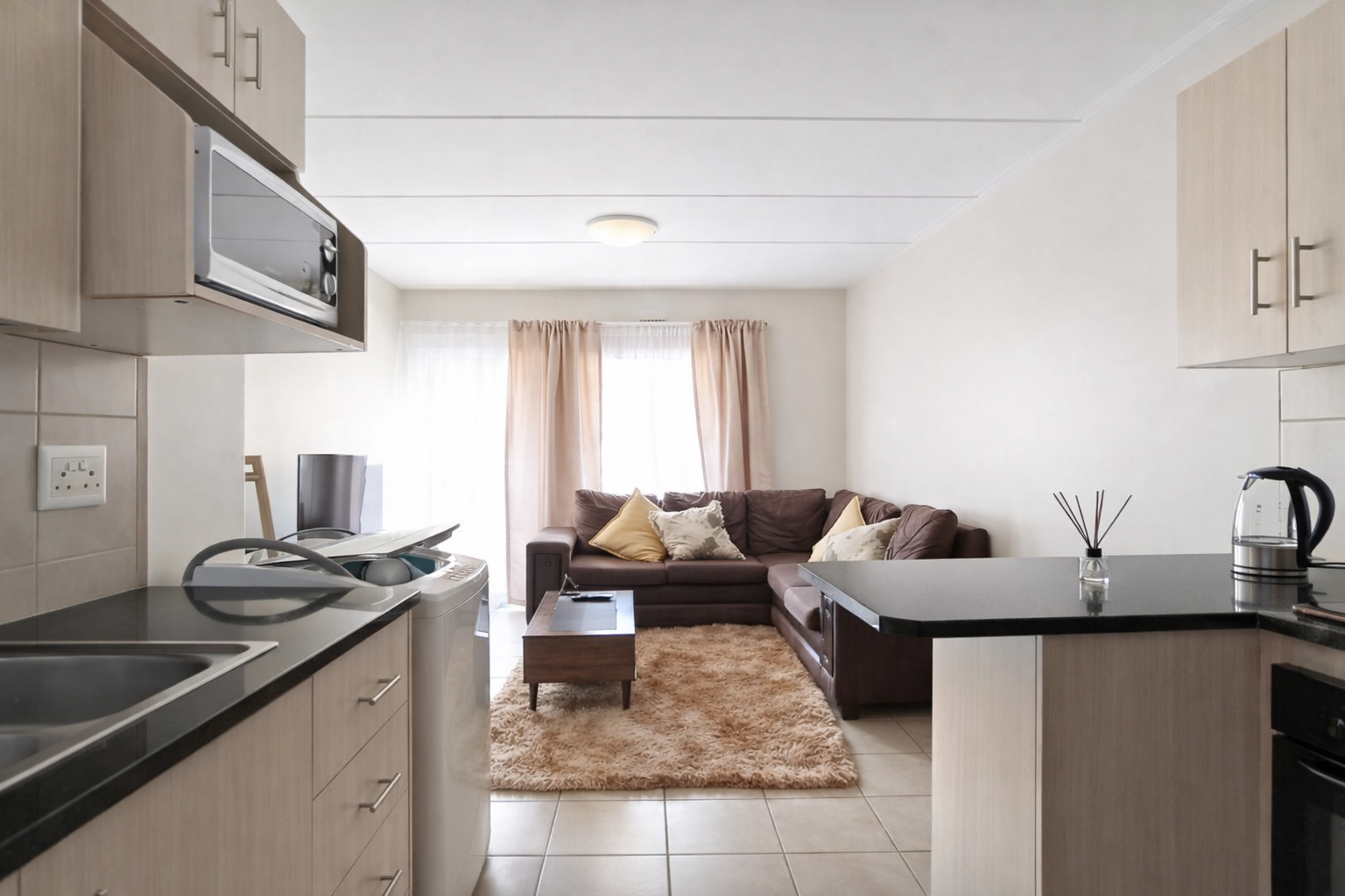 The contemporary kitchen features neat built-in cupboards, sleek countertops, and ample storage, with space for essential appliances. The living area is comfortably sized and filled with natural light, offering a peaceful atmosphere to unwind after a long day.