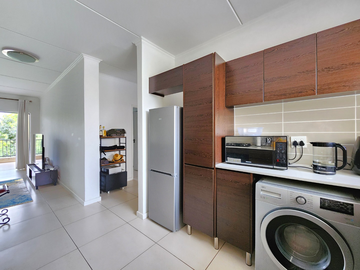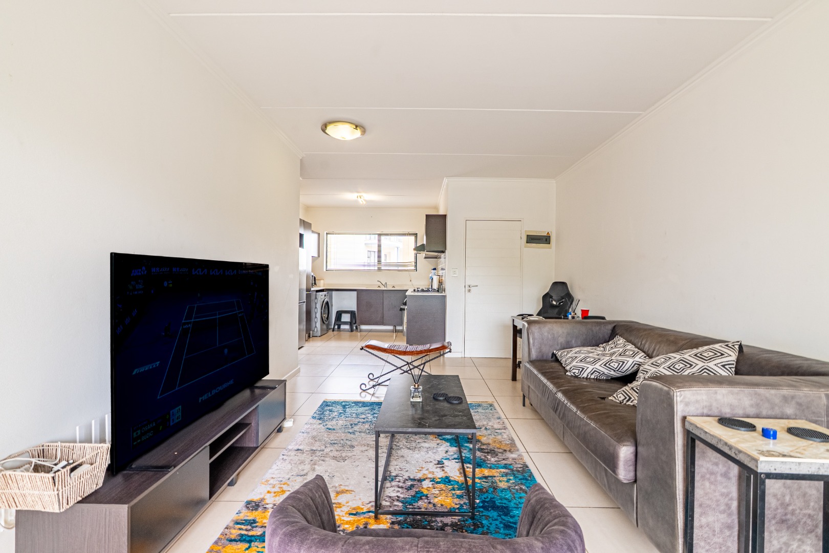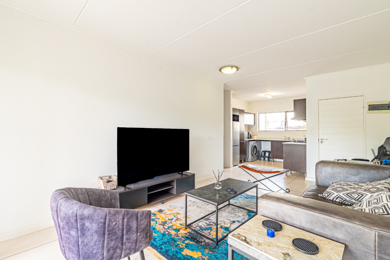 The home welcomes you into a stylish open-plan living and kitchen area, designed with modern living in mind. The kitchen features granite countertops, quality appliances, and ample cupboard space, flowing seamlessly into the living area, ideal for both everyday living and entertaining.