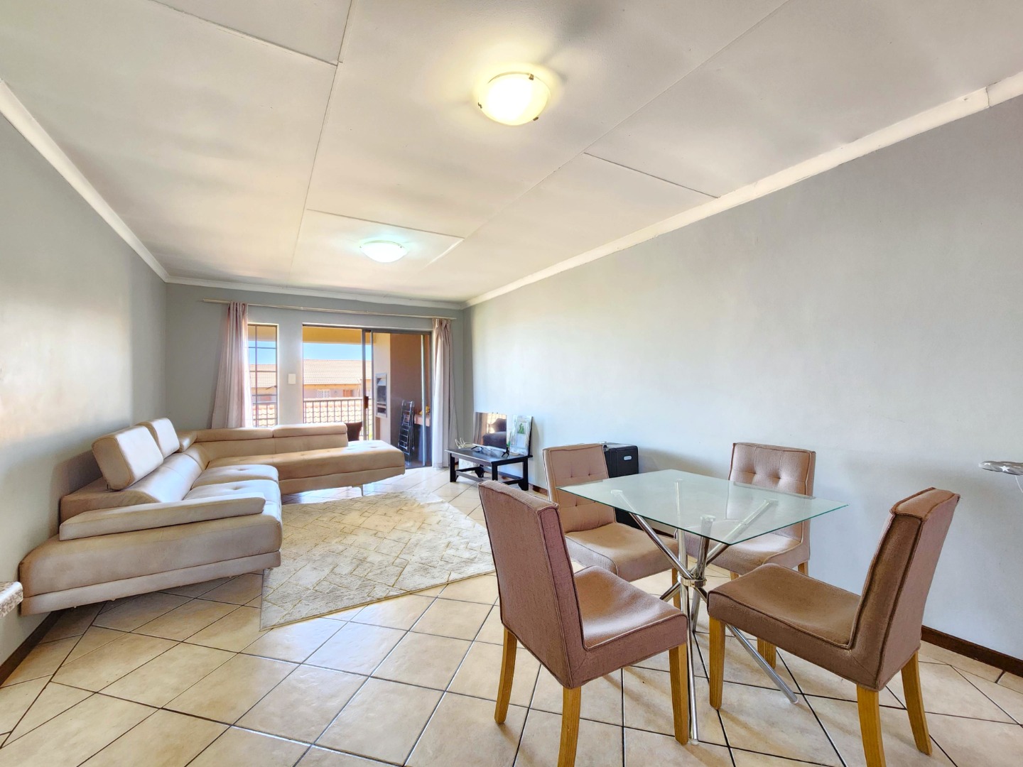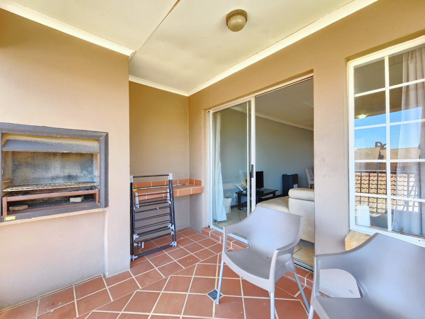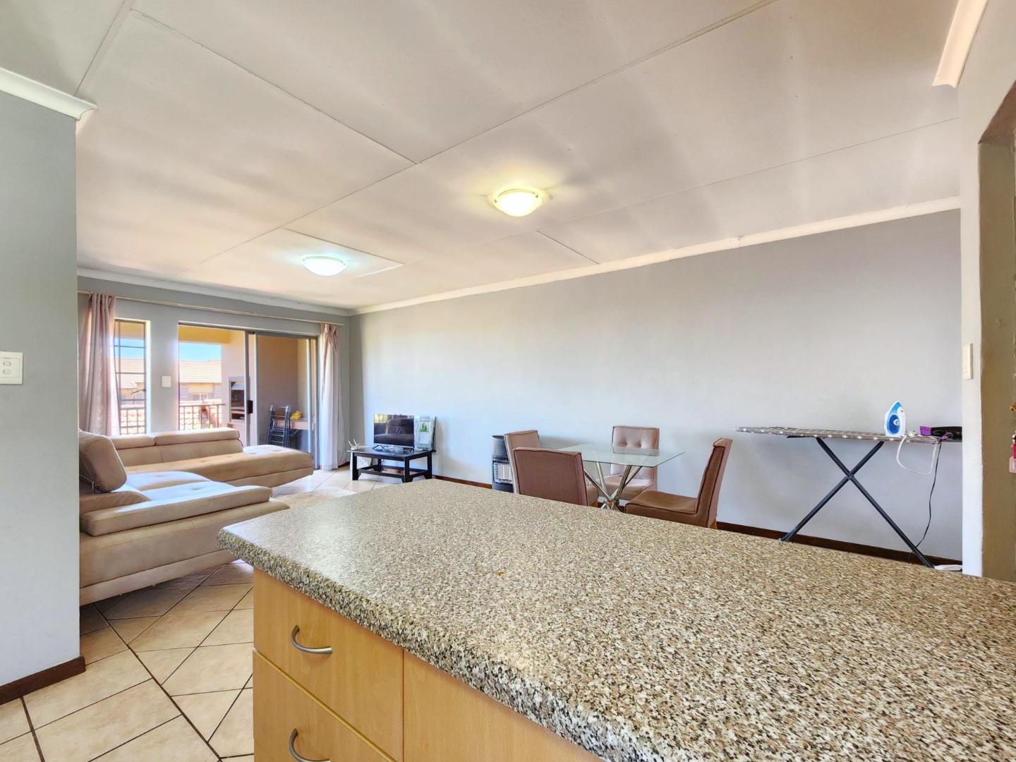 The apartment features a spacious open-plan layout that includes the kitchen, dining area, and TV/family lounge, creating a welcoming space for both everyday living and entertaining. The living area flows seamlessly onto a generous balcony fitted with a built-in braai, perfect for relaxing or hosting guests.