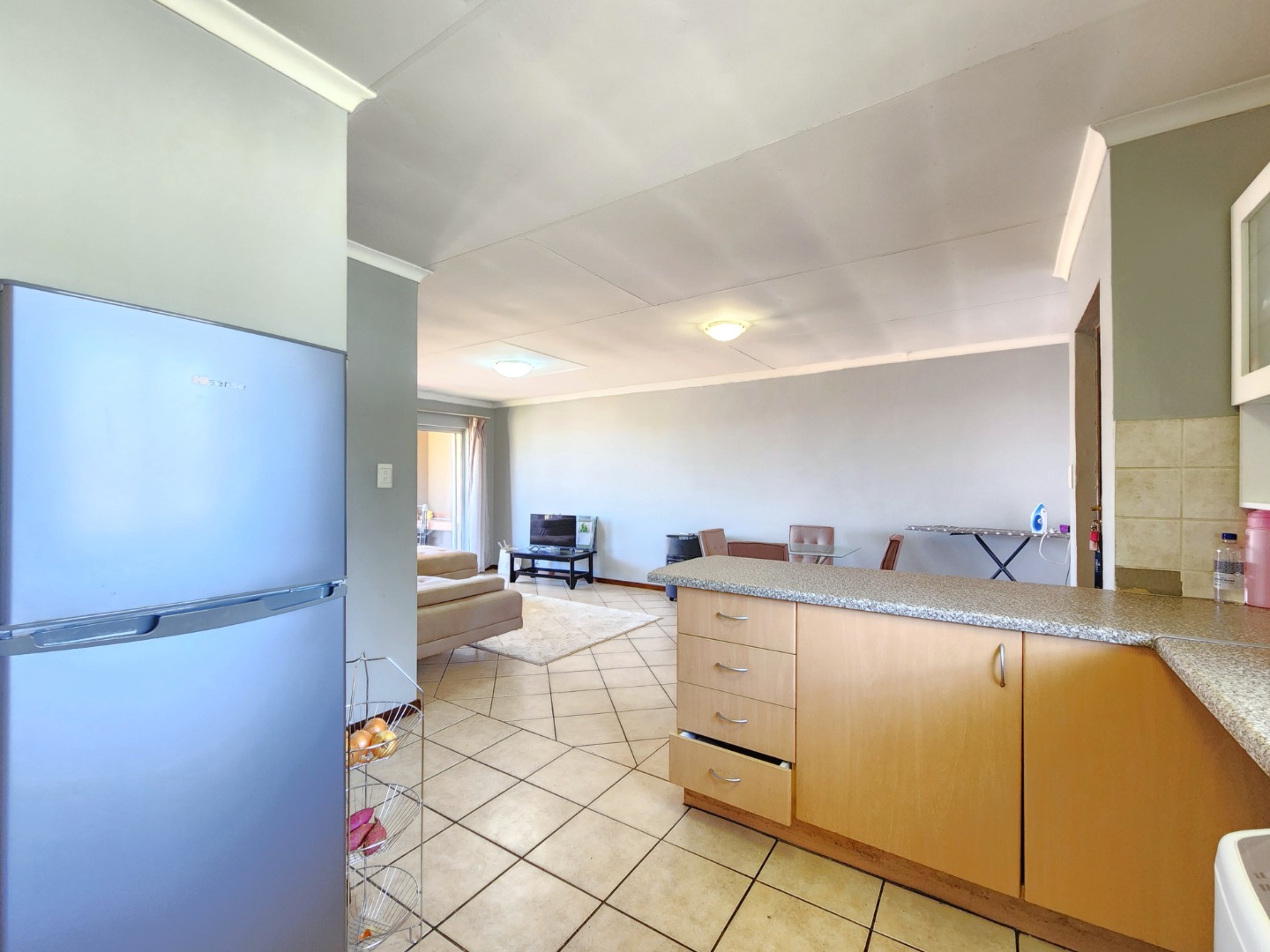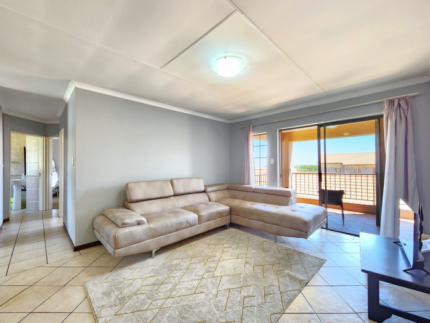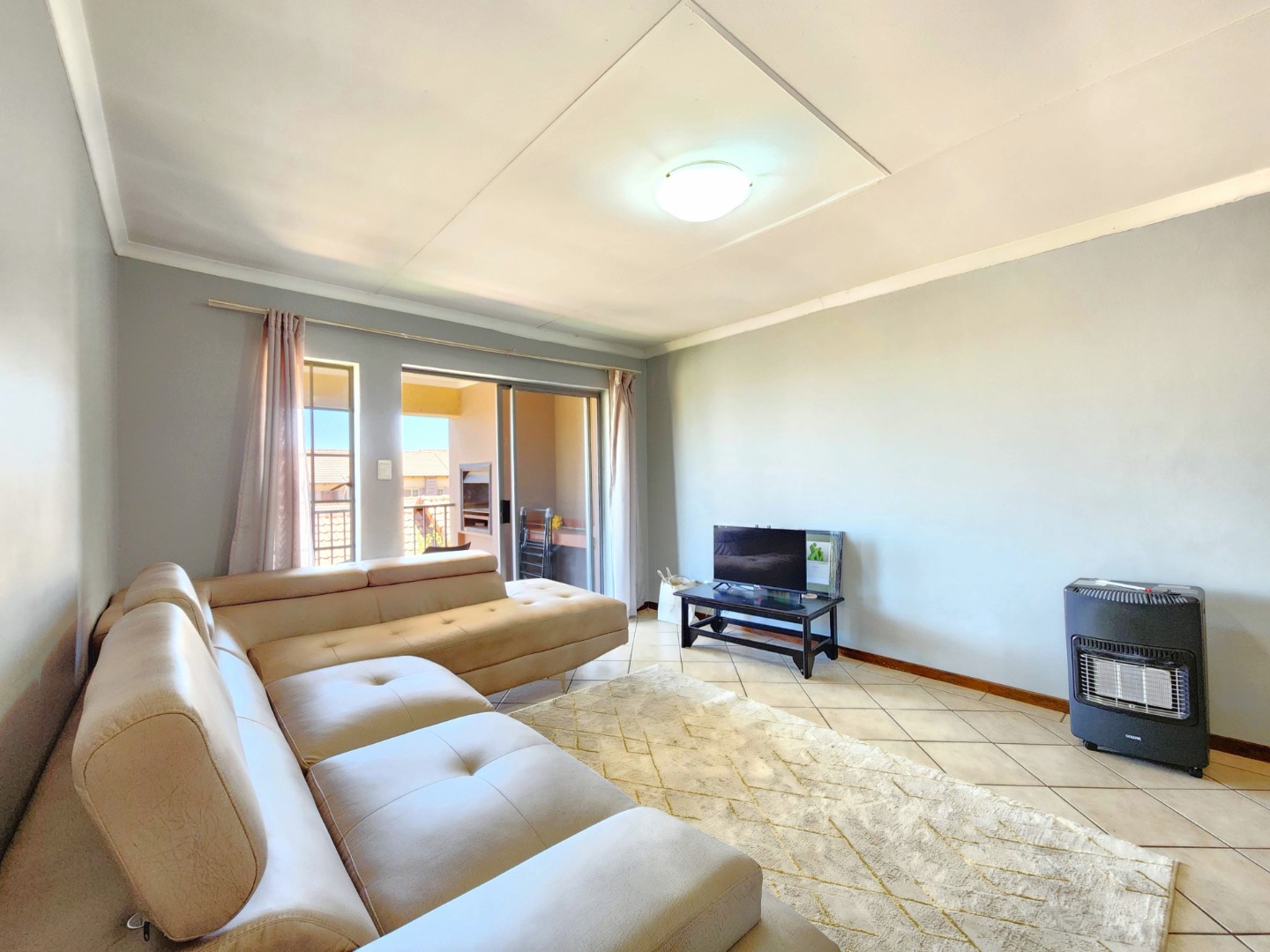The apartment features a spacious open-plan layout that includes the kitchen, dining area, and TV/family lounge, creating a welcoming space for both everyday living and entertaining. The living area flows seamlessly onto a generous balcony fitted with a built-in braai, perfect for relaxing or hosting guests.