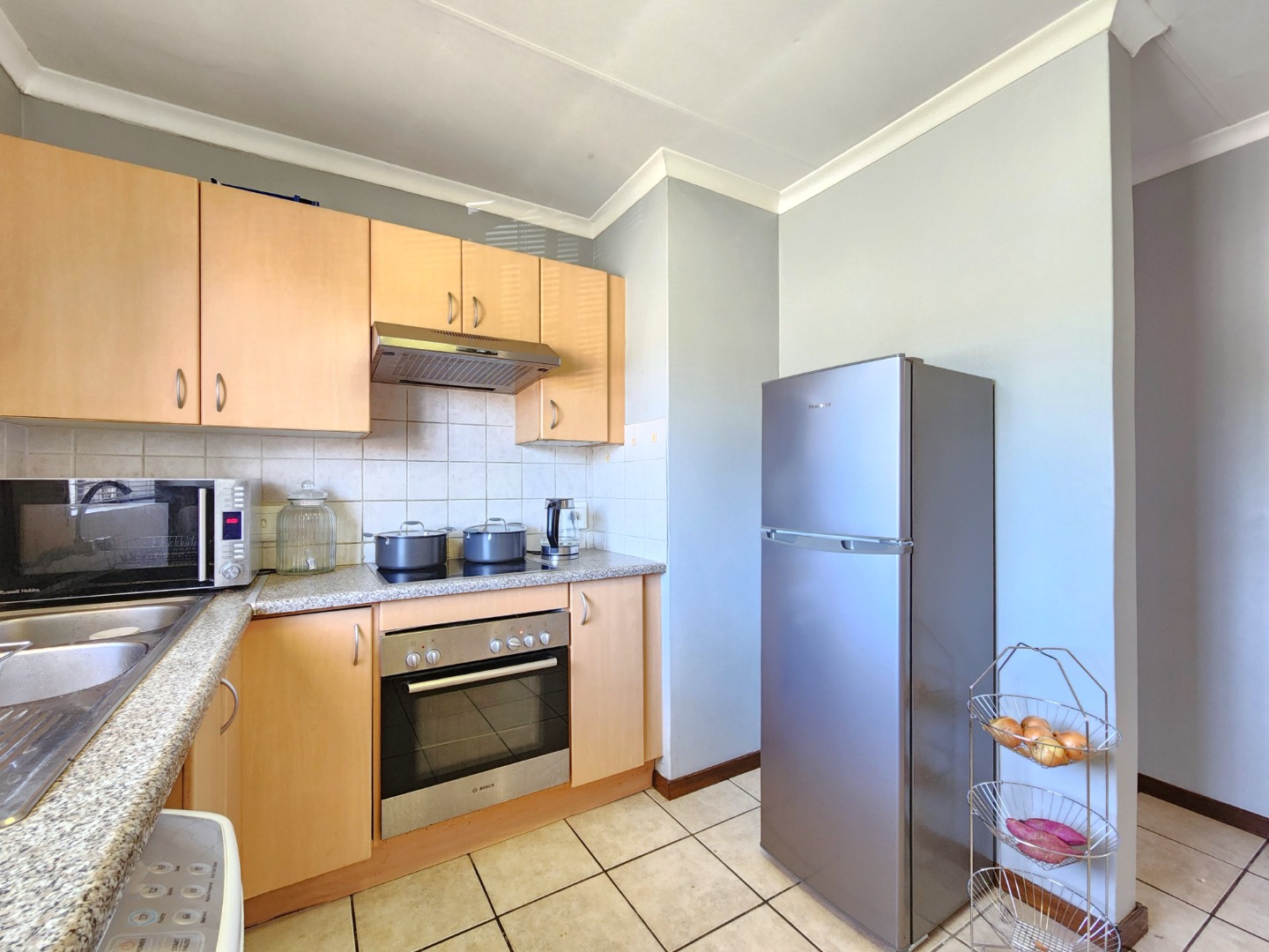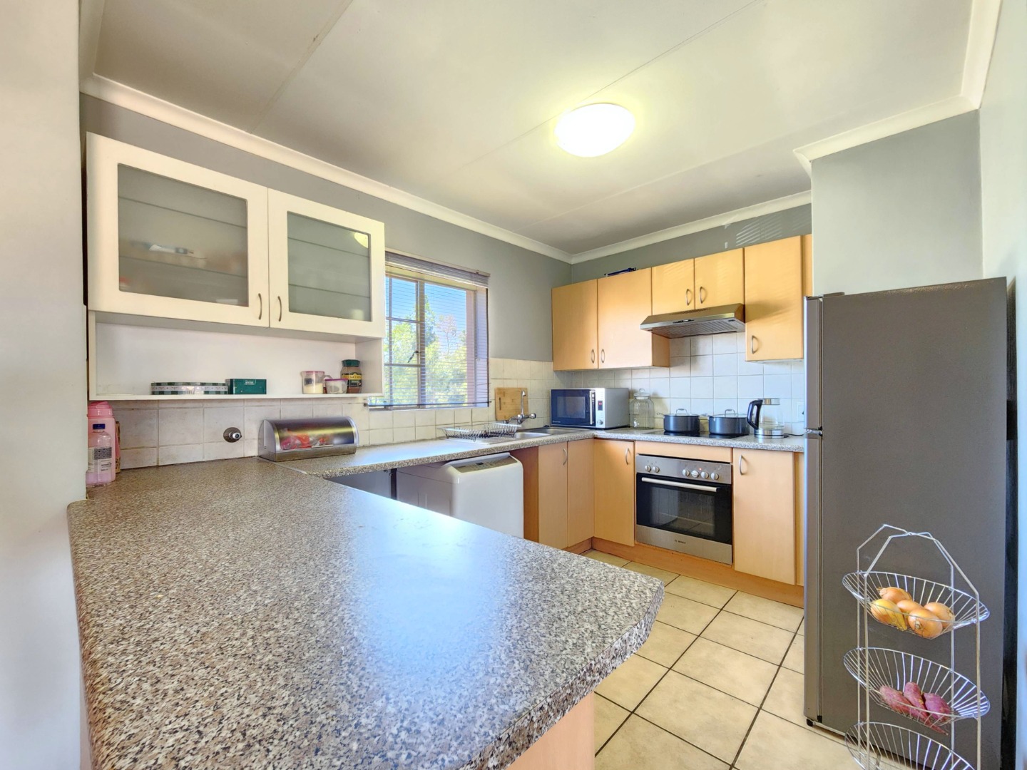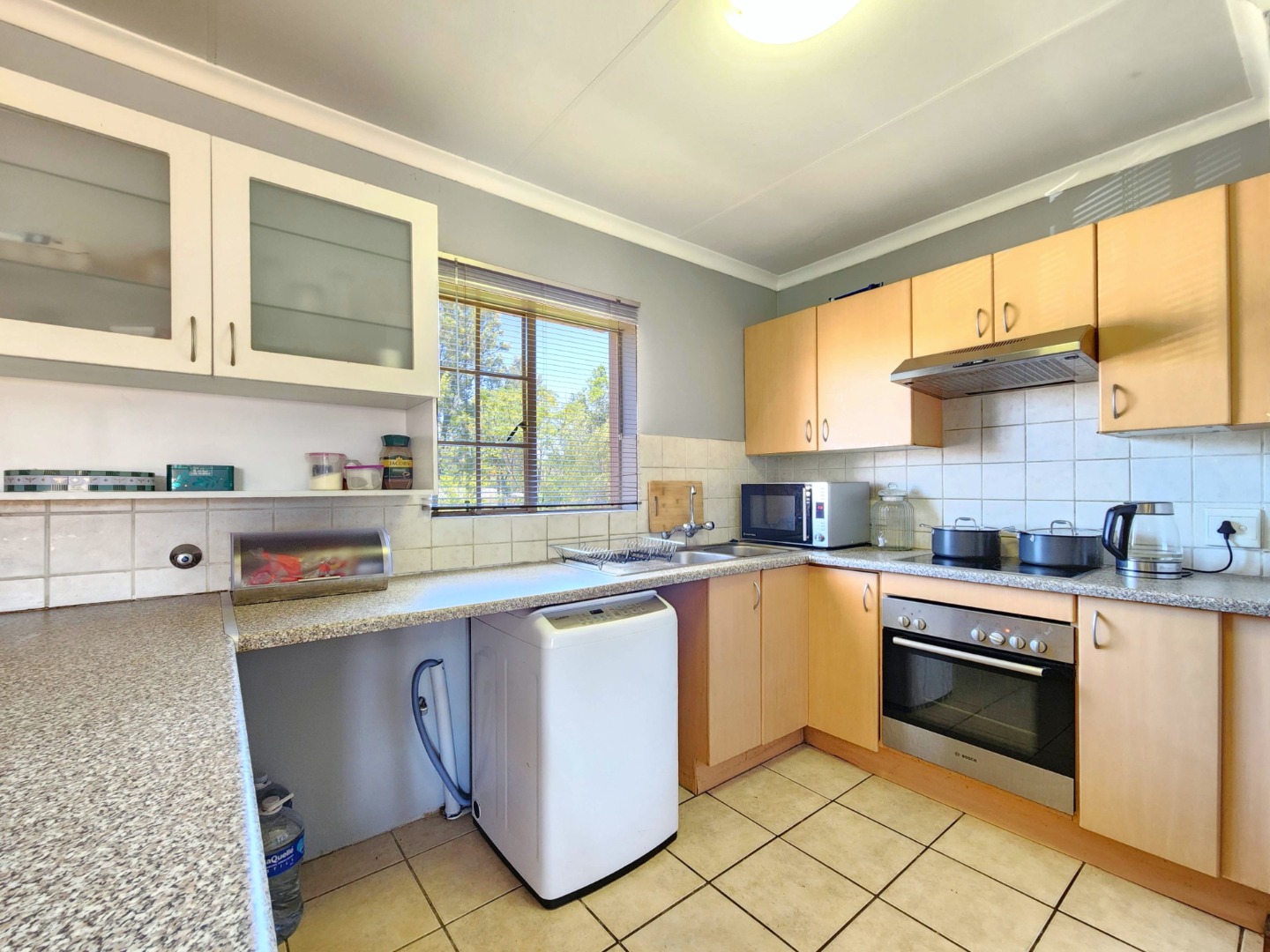 The kitchen is fully equipped with plenty of built-in cupboards, ample countertop space, as well as a stove and extractor fan, making it both practical and functional for daily use.