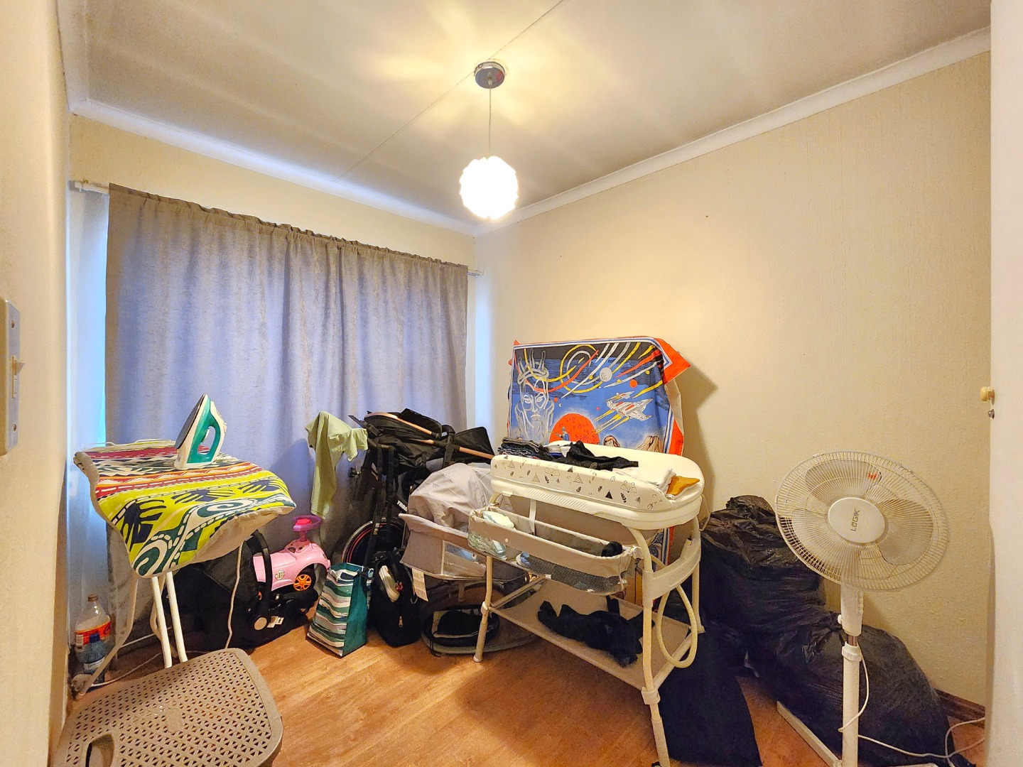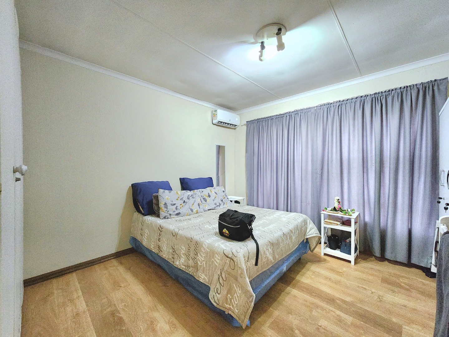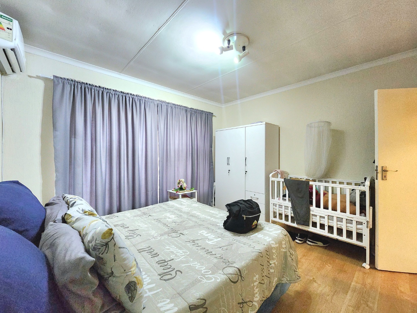 Both bedrooms are spacious and fitted with built-in cupboards and elegant wooden floors, while the main bedroom also includes an air conditioning unit for added comfort. The apartment is serviced by a neat and well-kept full bathroom.