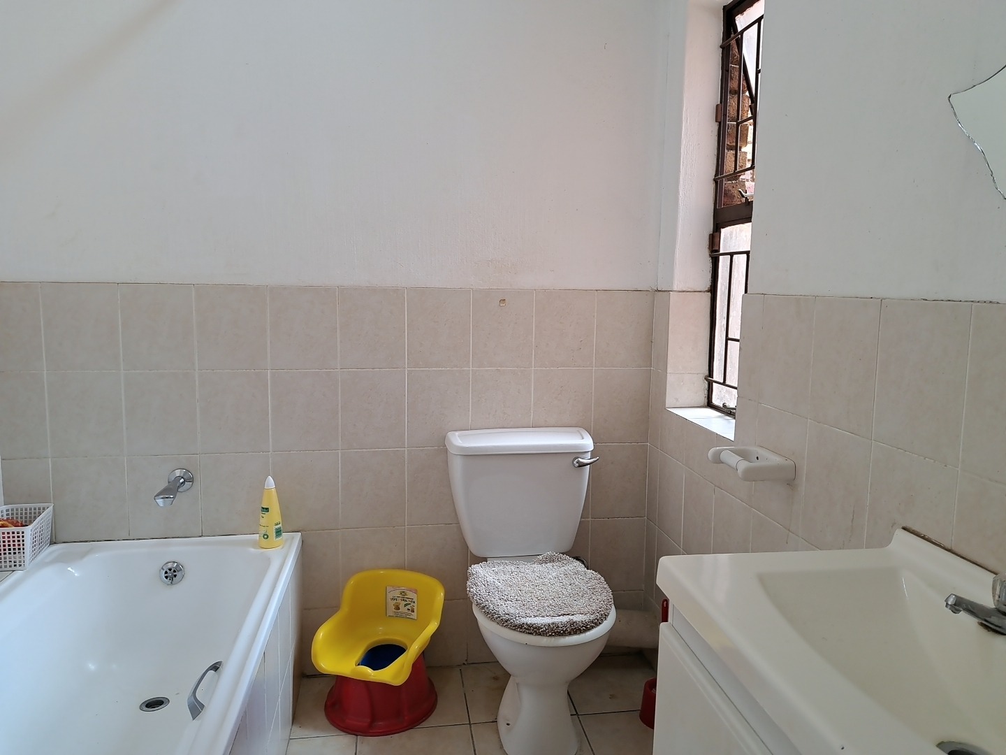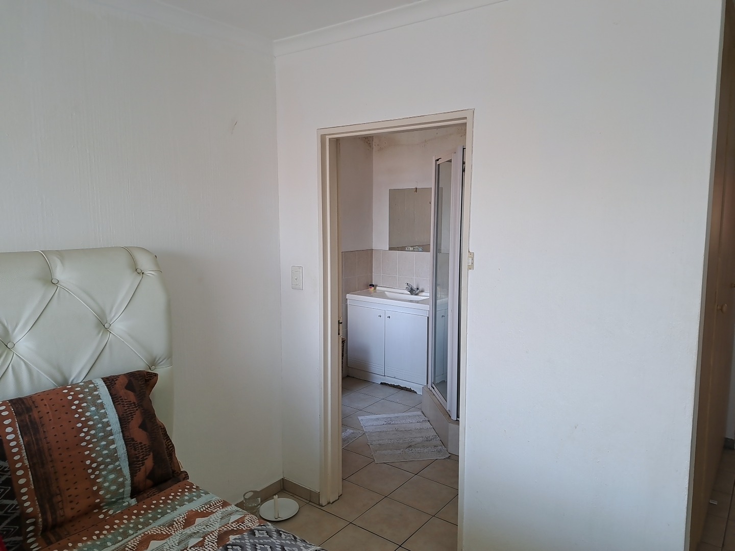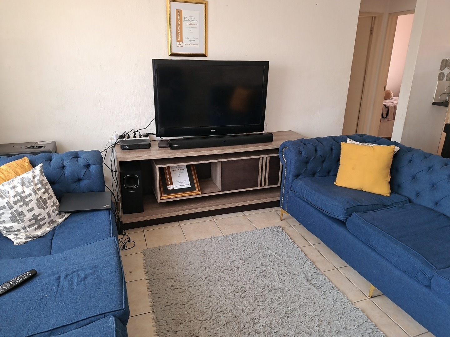 The living area is bathed in natural light from large windows, which are fitted with security bars for peace of mind. Tiled flooring extends throughout the main living spaces, offering durability and easy maintenance. The apartment features two comfortable bedrooms and two bathrooms, with one being an ensuite, ensuring privacy and convenience for residents.