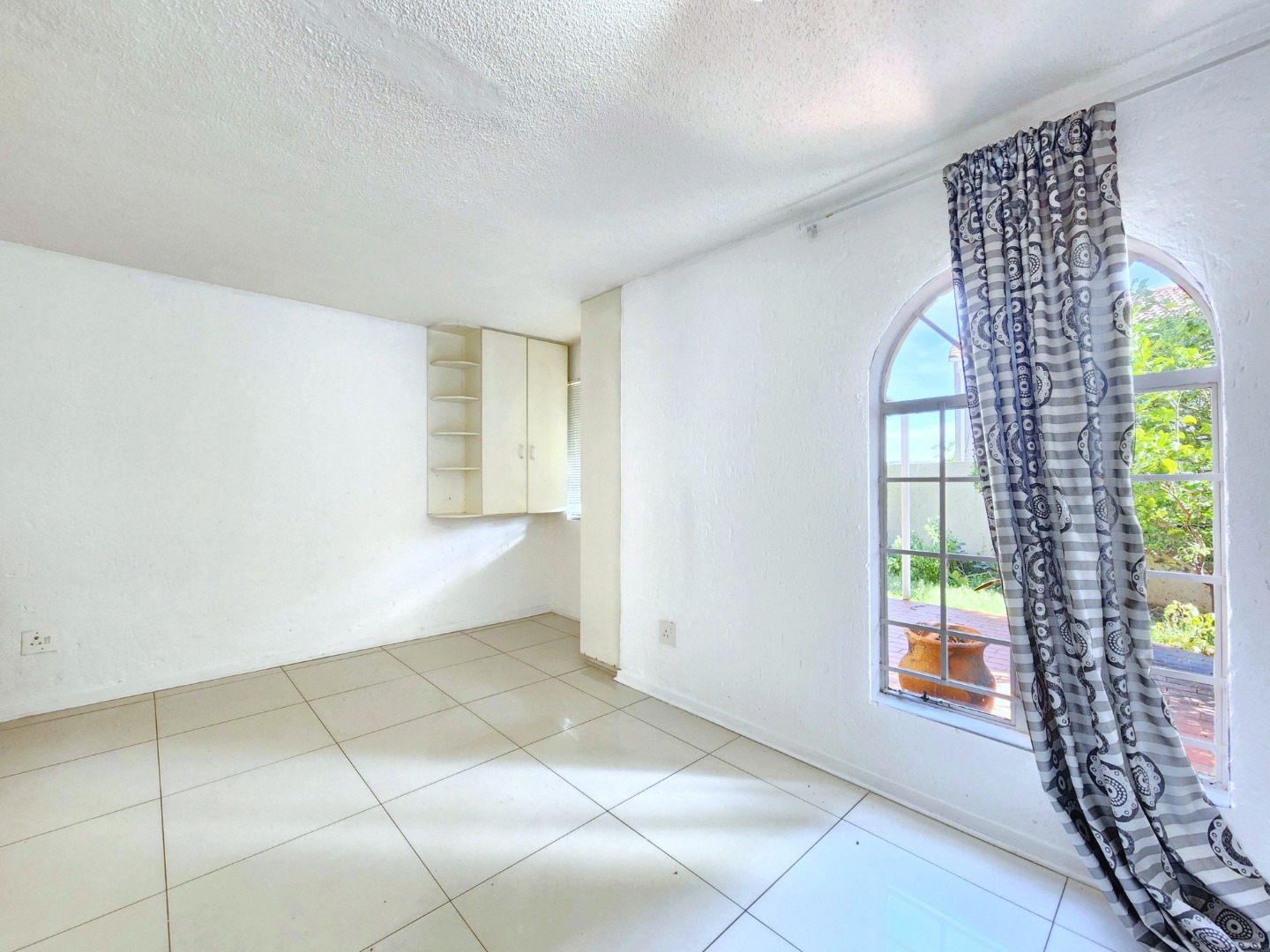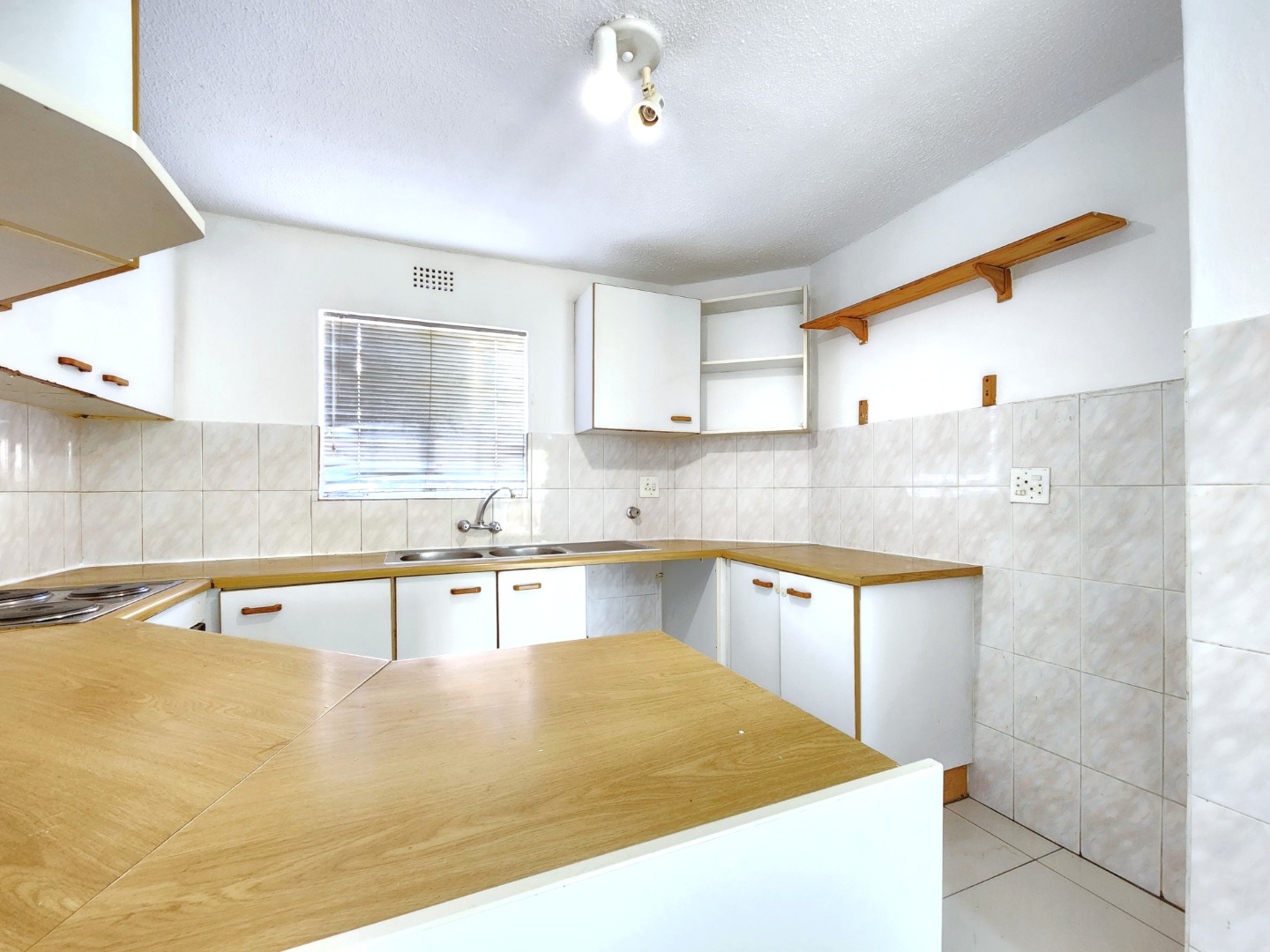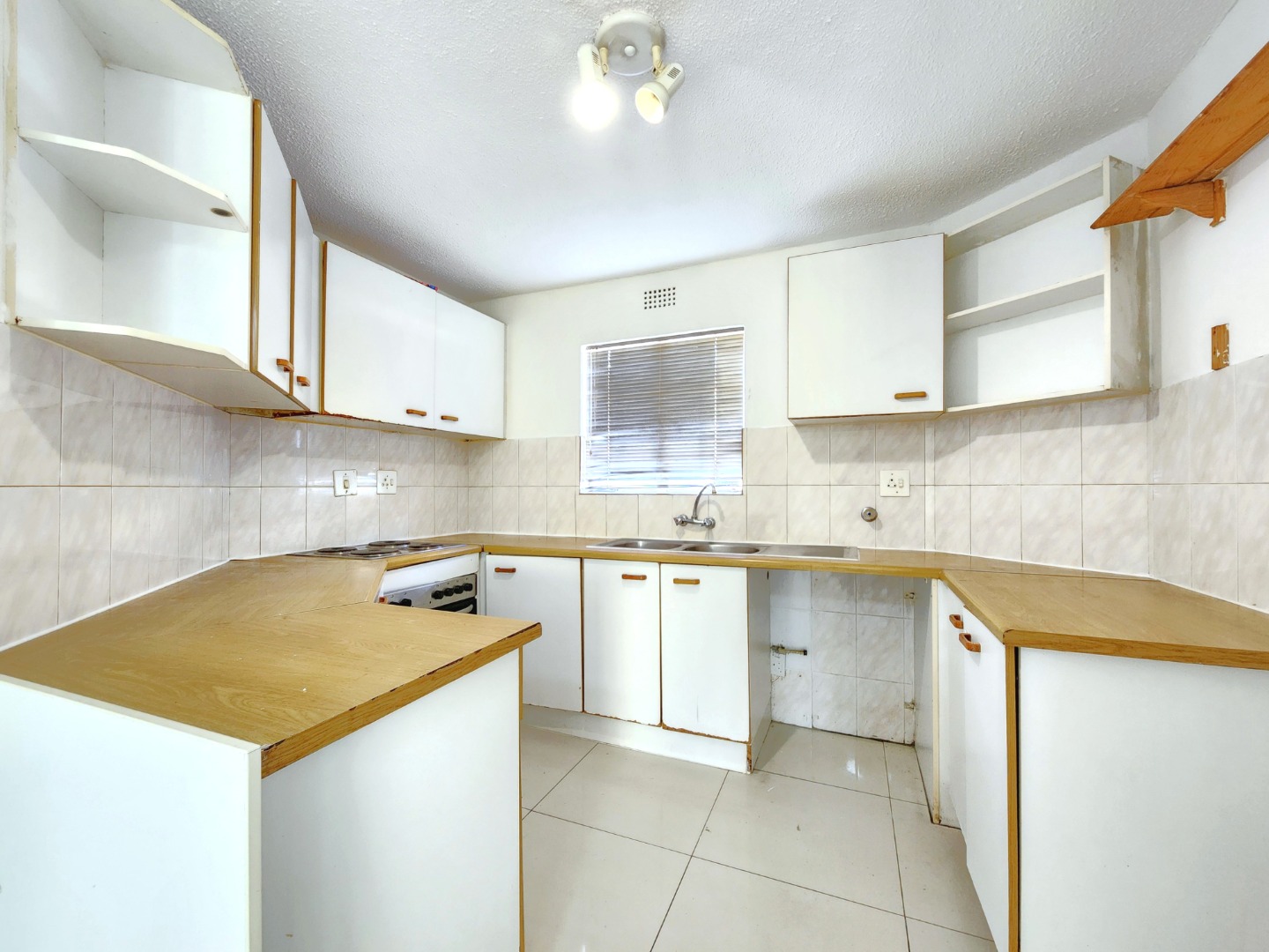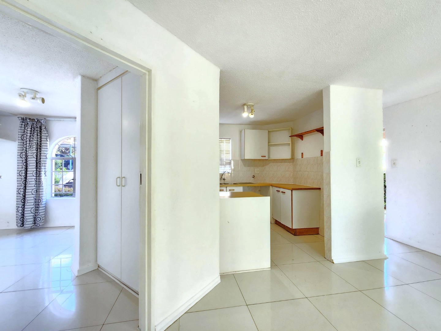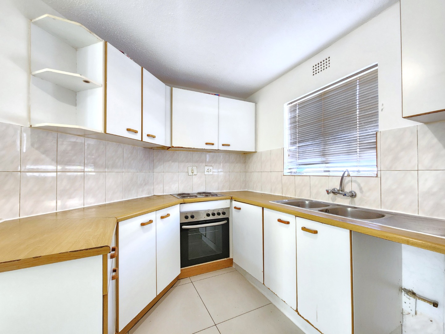 The kitchen is fully equipped with built-in cupboards and ample countertop space, making it both practical and functional for daily use.