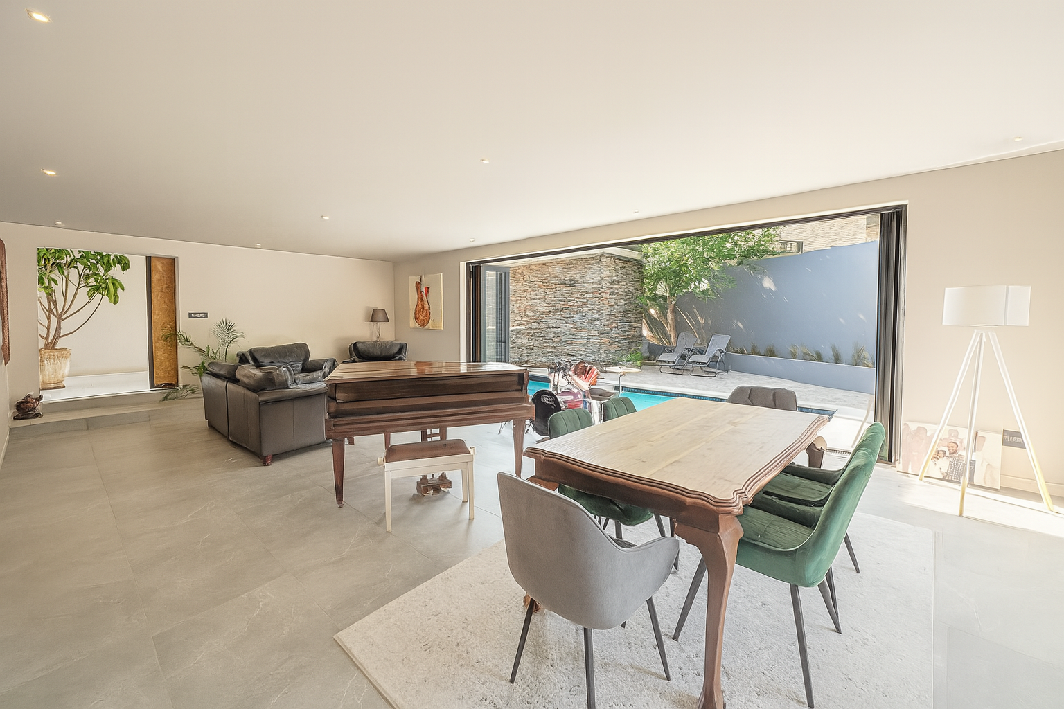 - Outdoor entertainment patio overlooking a sparkling swimming pool