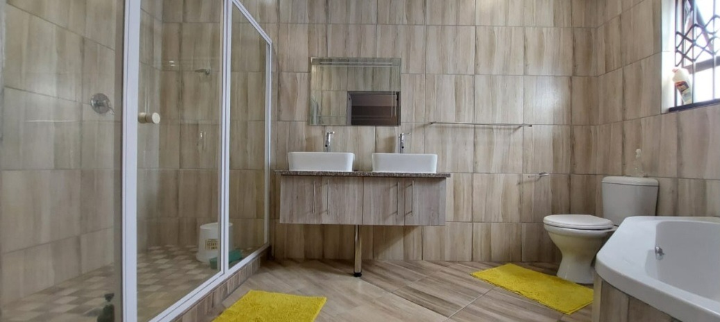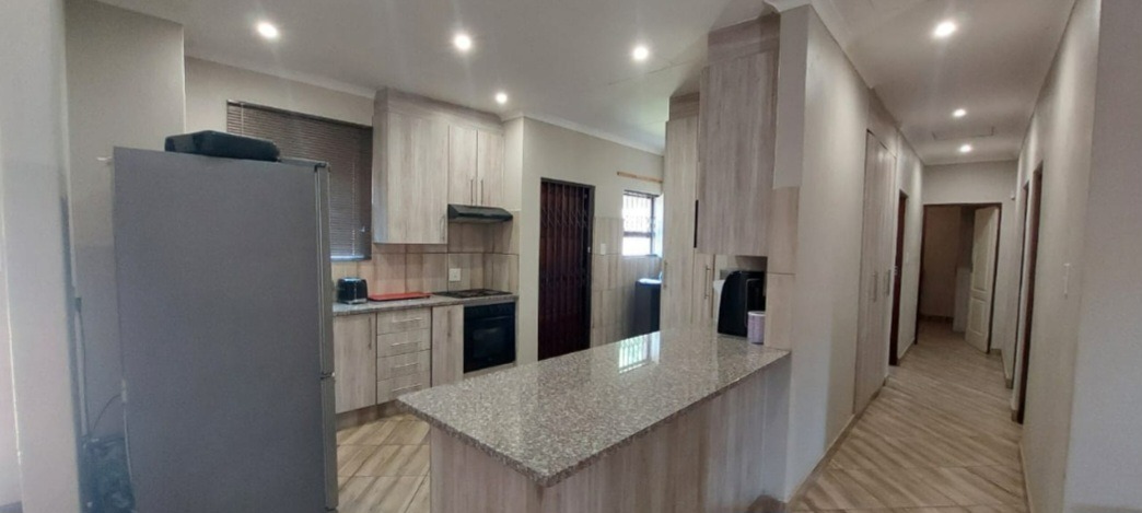 The modern, spacious kitchen is finished with stylish granite countertops and includes a separate scullery, making meal preparation and clean-up both practical and efficient. The kitchen flows seamlessly into an open-plan lounge, creating a warm and inviting living space ideal for relaxing or entertaining.