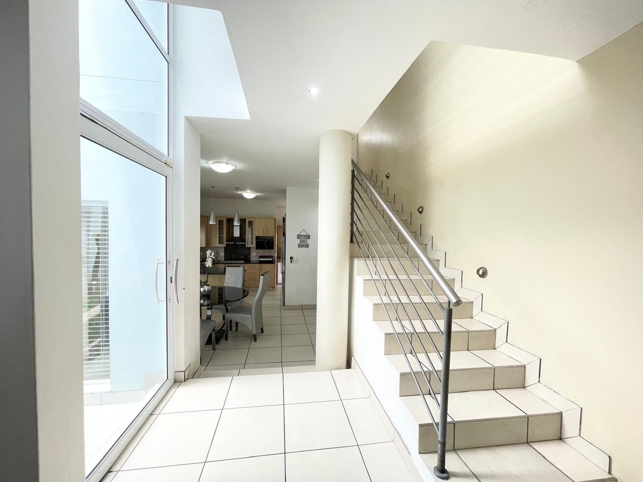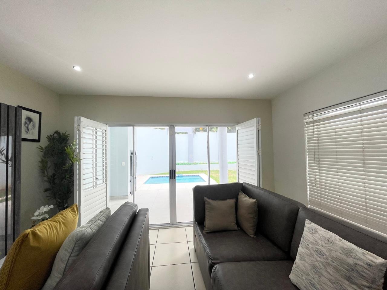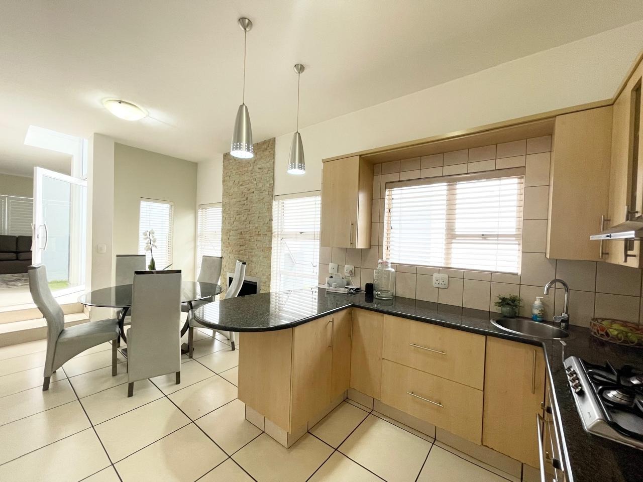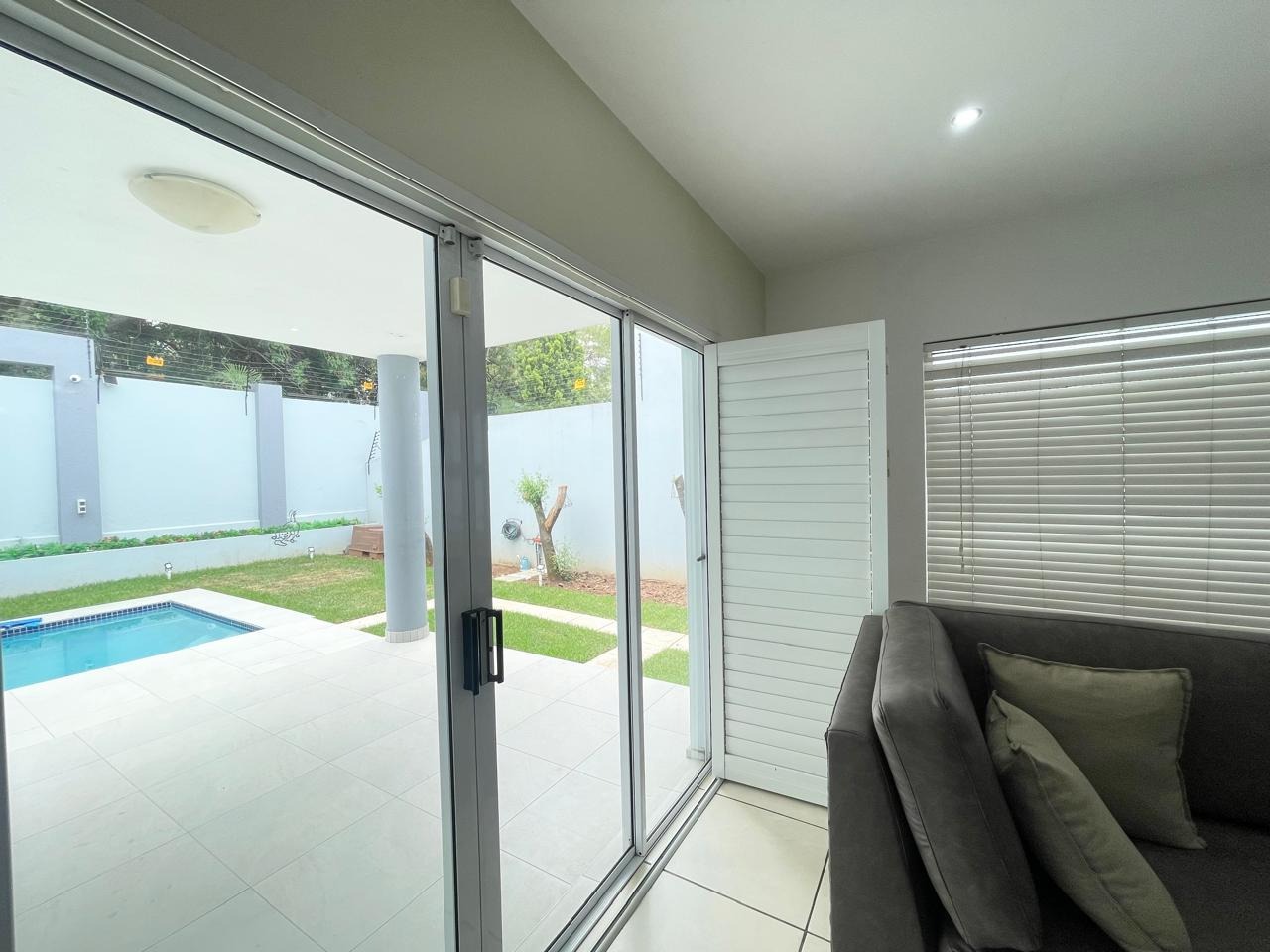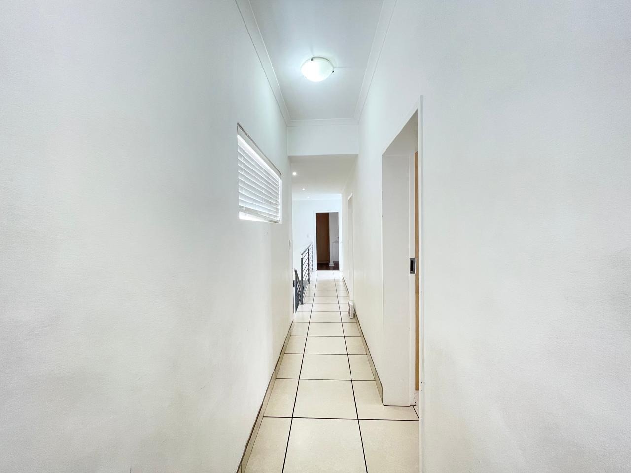 This beautiful and modern four-bedroom home is located within a secure and well-managed complex and offers exceptional space throughout. The downstairs area features a generous open-plan reception and dining area leading into a modern kitchen with a separate scullery. A large lounge opens onto a beautifully maintained garden and swimming pool, providing ample indoor and outdoor space for comfortable family living and entertaining. A guest toilet and a courtyard for gas bottle storage complete the lower level.