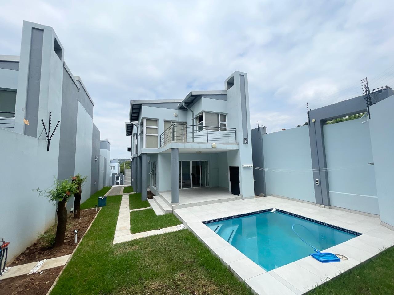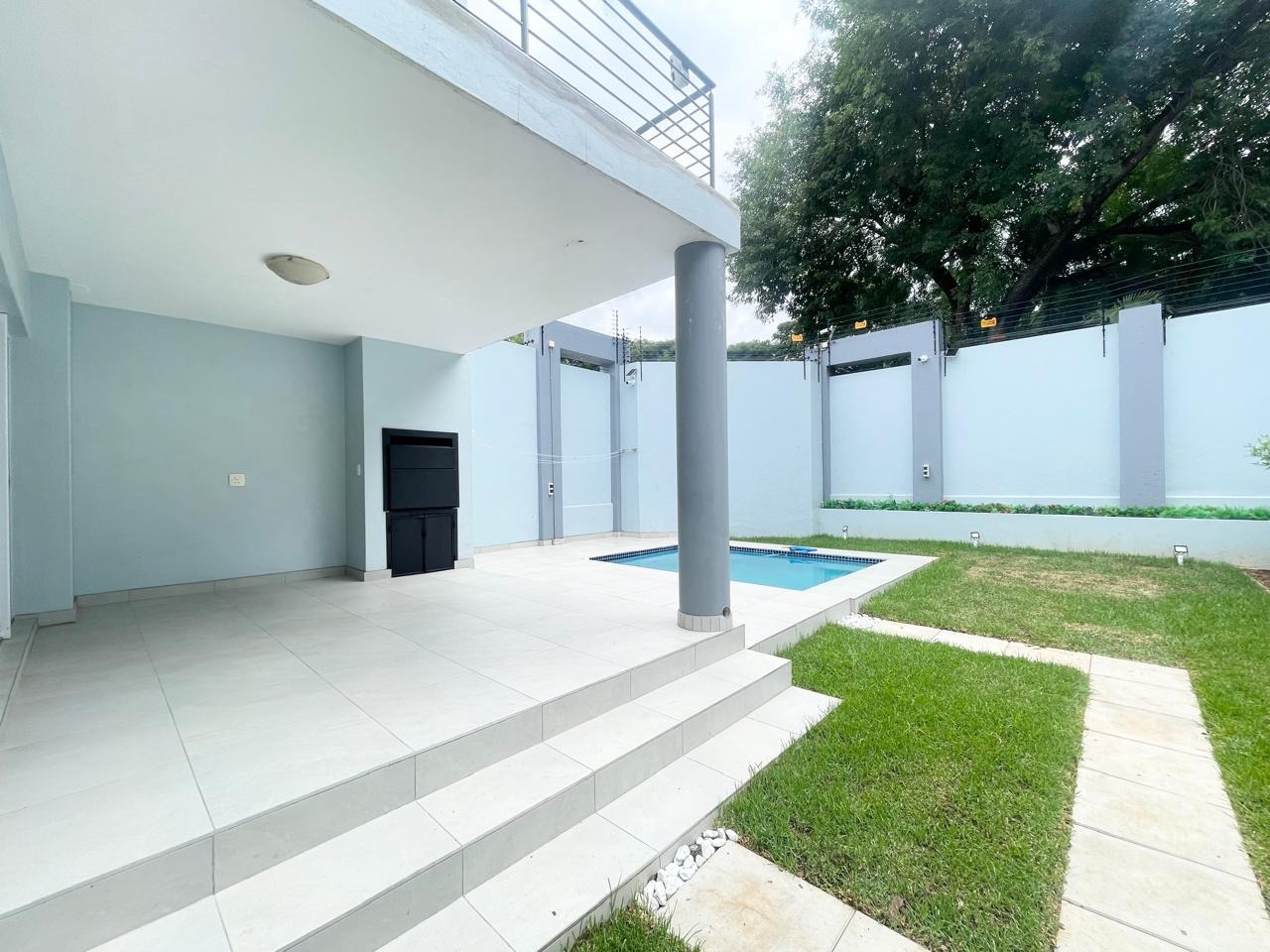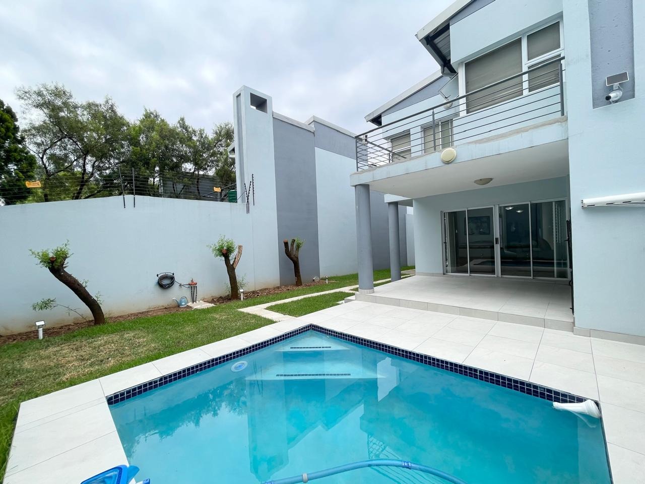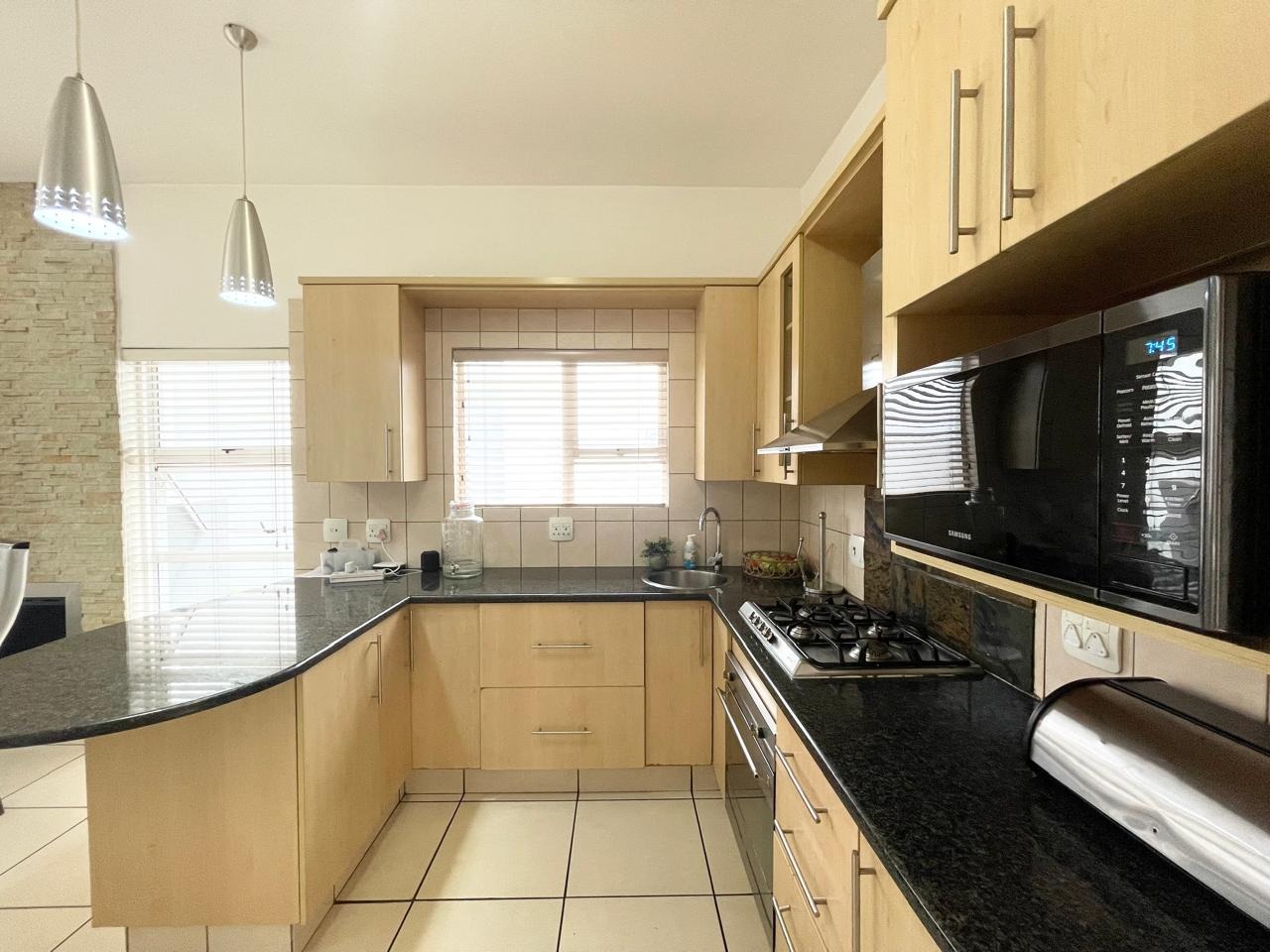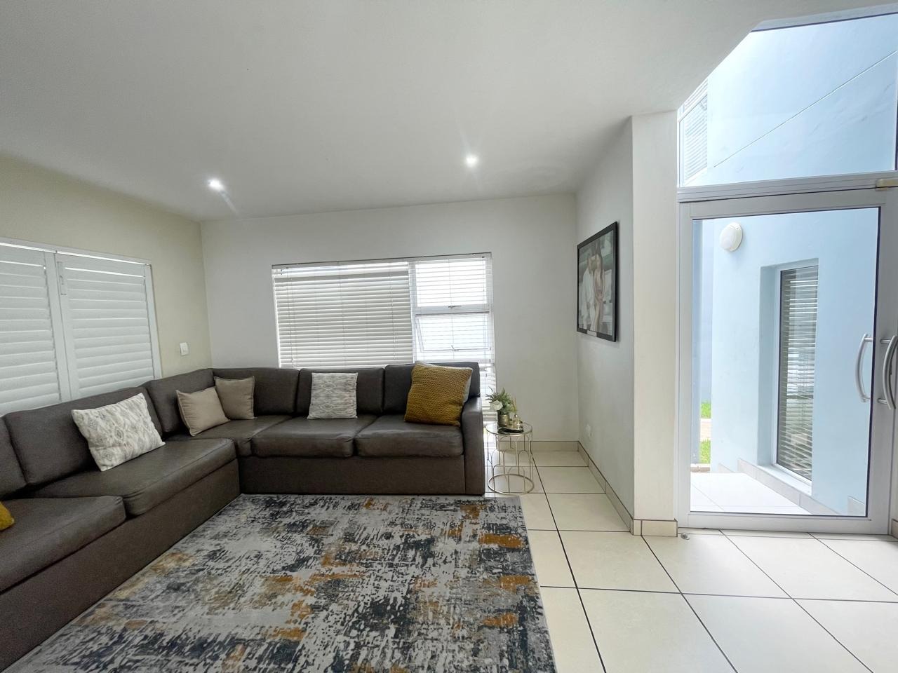 This beautiful and modern four-bedroom home is located within a secure and well-managed complex and offers exceptional space throughout. The downstairs area features a generous open-plan reception and dining area leading into a modern kitchen with a separate scullery. A large lounge opens onto a beautifully maintained garden and swimming pool, providing ample indoor and outdoor space for comfortable family living and entertaining. A guest toilet and a courtyard for gas bottle storage complete the lower level.