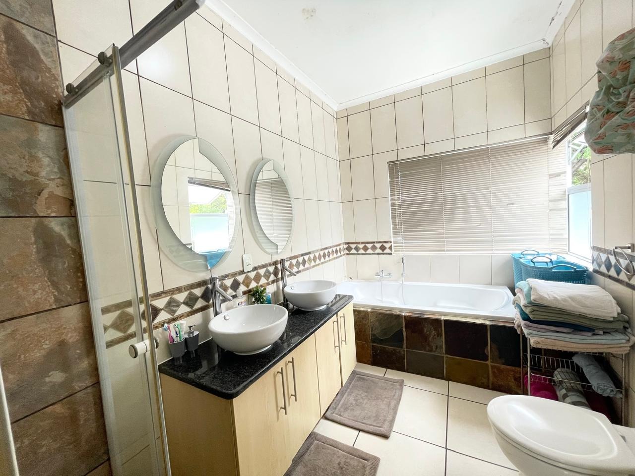 Upstairs, the home boasts four very spacious bedrooms, all with extensive built-in cupboard space. The main bedroom features a full en-suite bathroom with both a bath and a shower and opens onto a private balcony with picturesque views of the garden and pool. The second and third bedrooms share a full bathroom, while the fourth bedroom includes an en-suite bathroom with a shower and access to a private balcony.