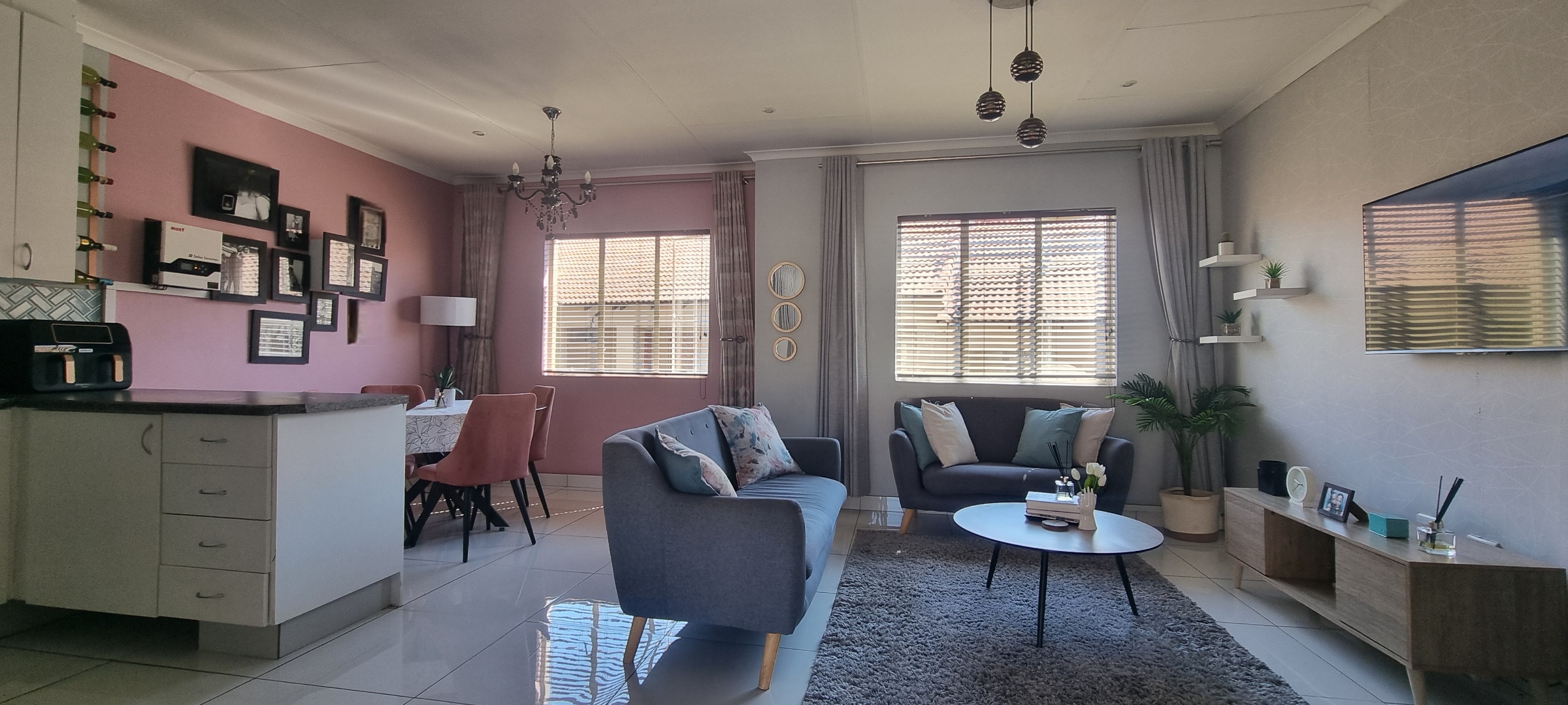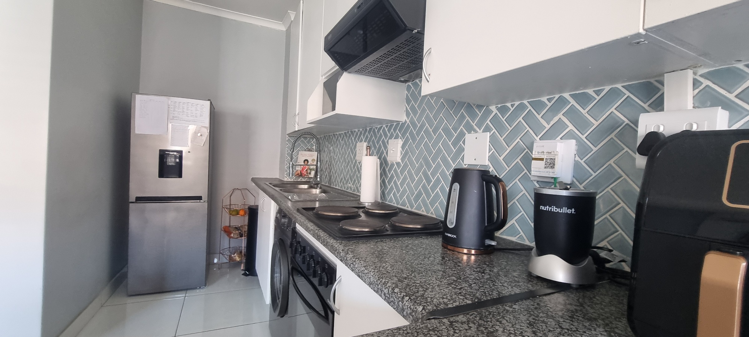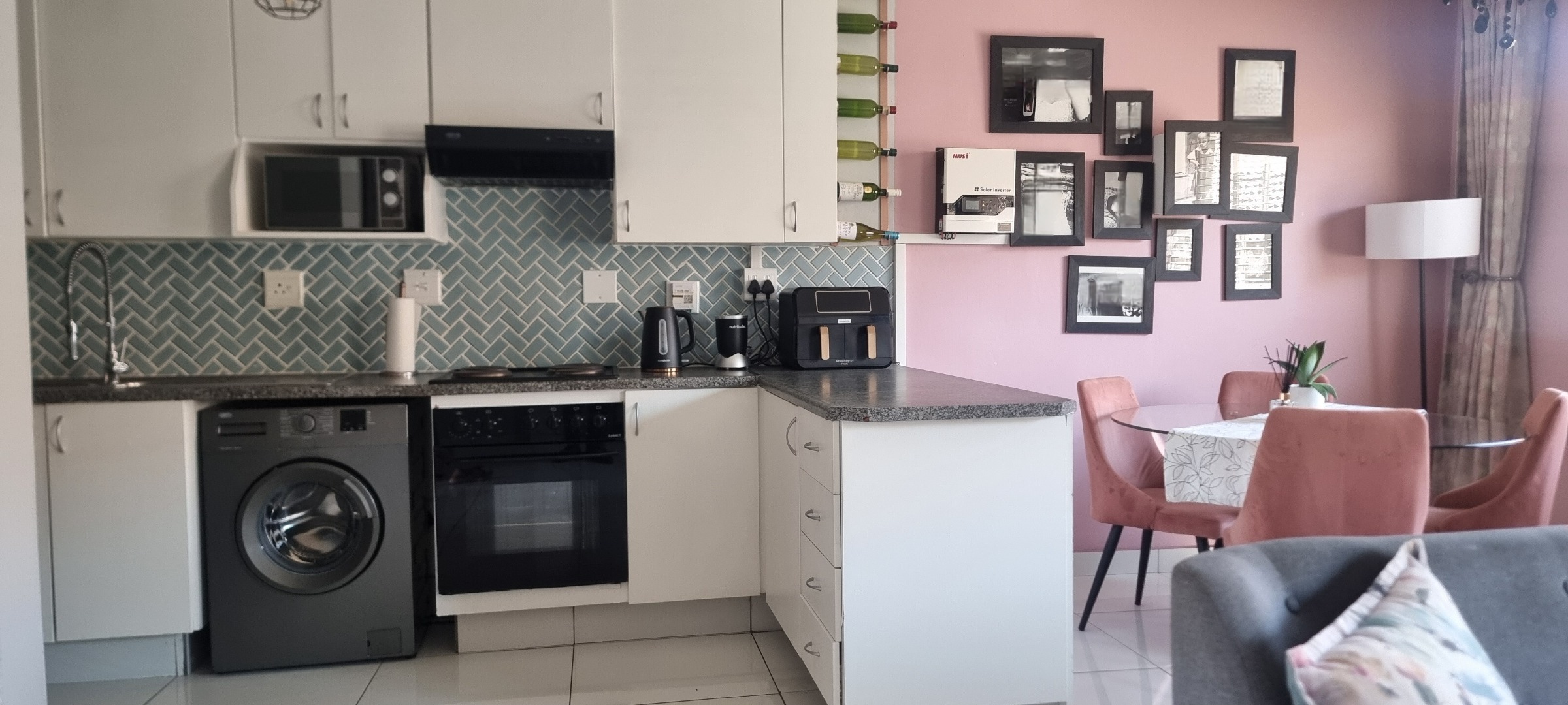 This beautifully renovated apartment offers a perfect blend of modern style and comfortable living. It features two spacious bedrooms with ample cupboard space, and two contemporary bathrooms — the main bedroom is en suite with a shower, while the second bathroom includes a bath. The open-plan kitchen, dining, and lounge area flows seamlessly onto a covered patio with a lovely view, ideal for relaxing or entertaining. The home also includes an inverter, providing uninterrupted power during load shedding, and the electricity is on a standard billing system .