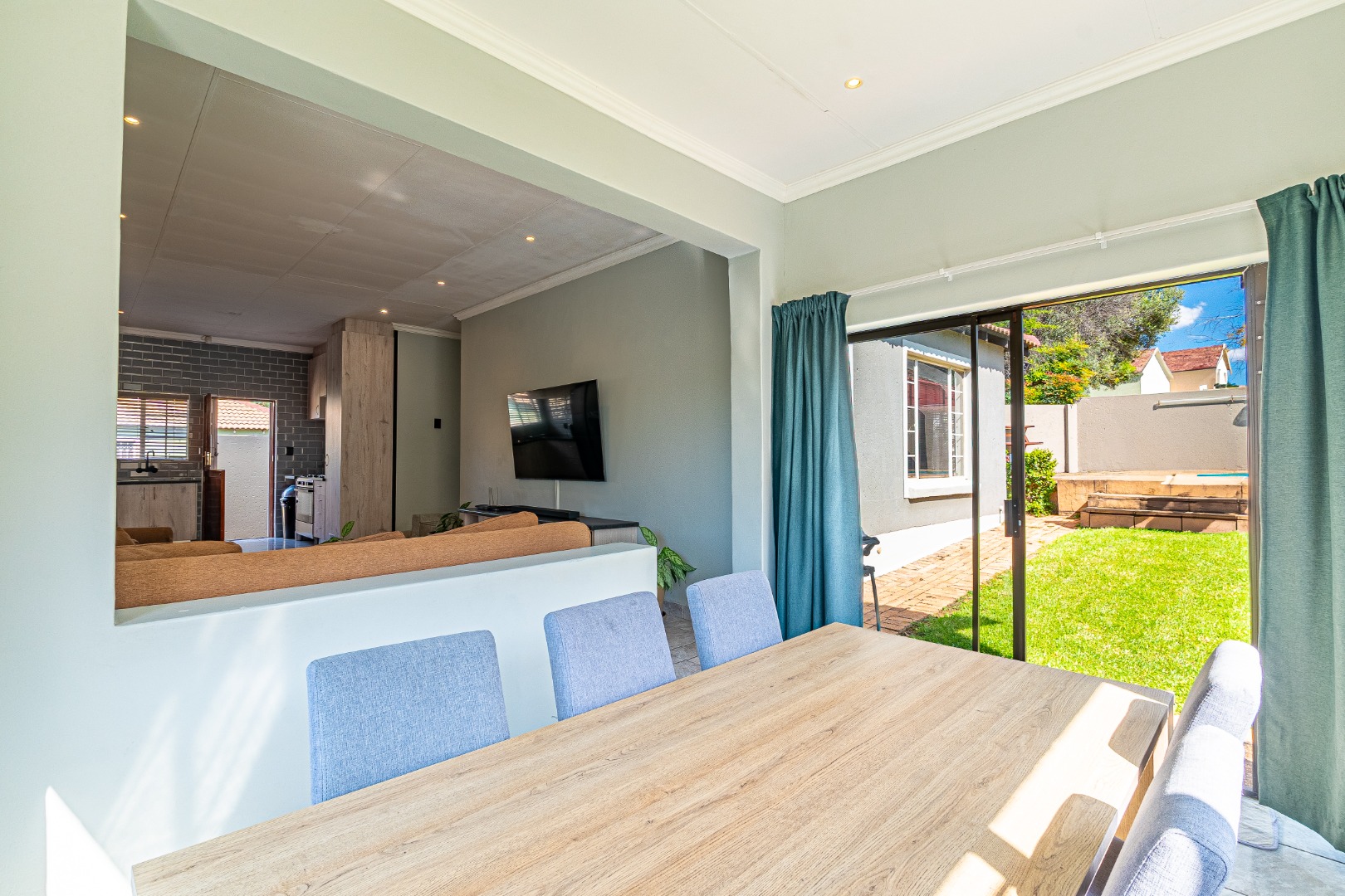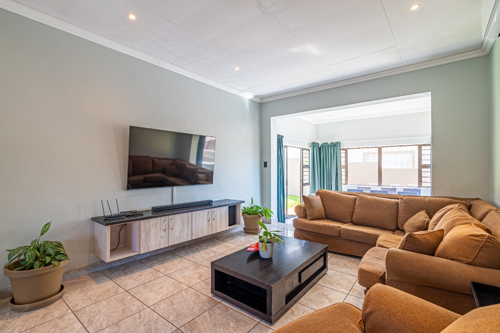 This inviting single-story home offers a seamless open-plan design, integrating the lounge, dining area, and a contemporary kitchen. The spacious living area features neutral walls, tiled flooring, and air conditioning, complemented by a wall-mounted TV setup. The modern kitchen is equipped with light wood-grain cabinetry, granite-look countertops, a gas stove, enhanced by a stylish subway tile backsplash. Large glass doors provide abundant natural light and direct access to the outdoor spaces.